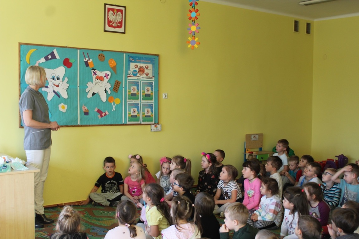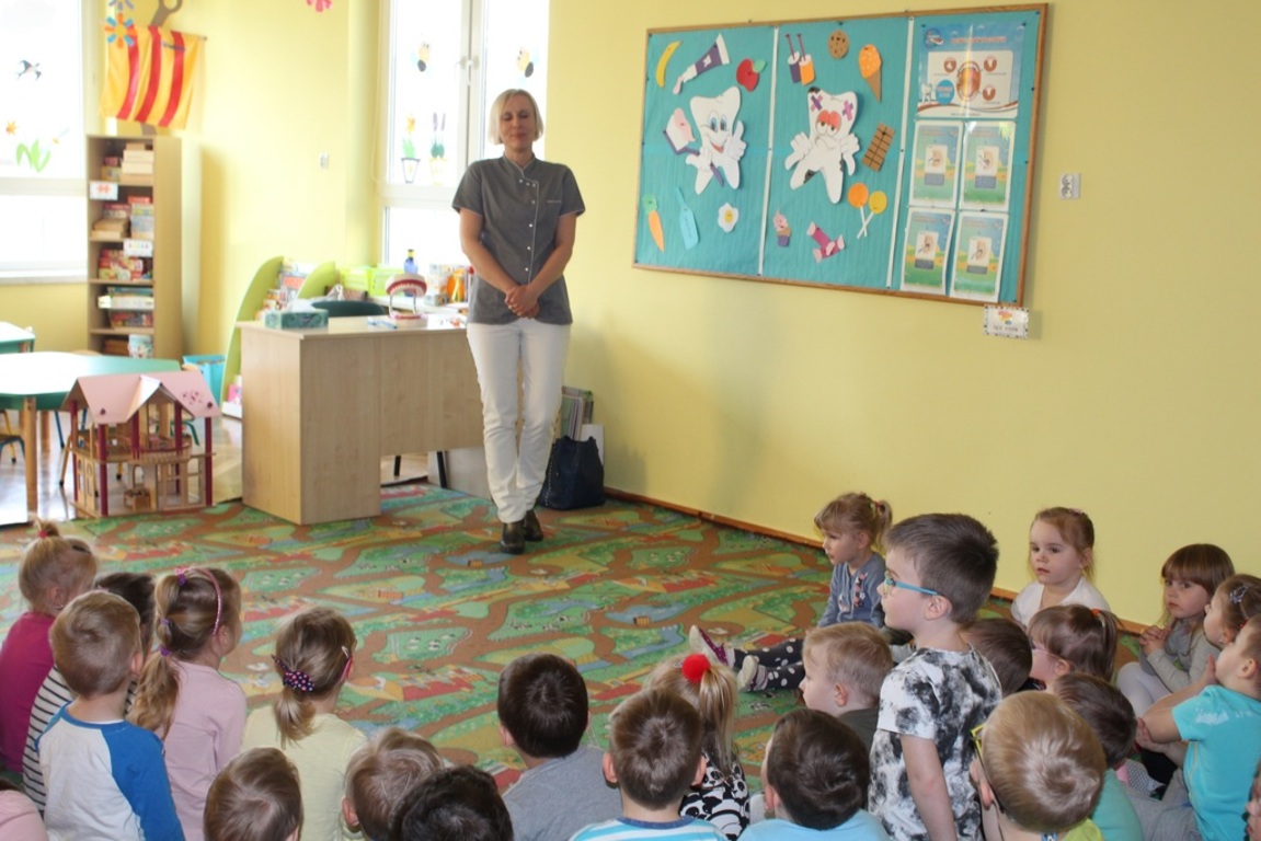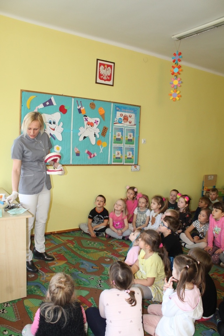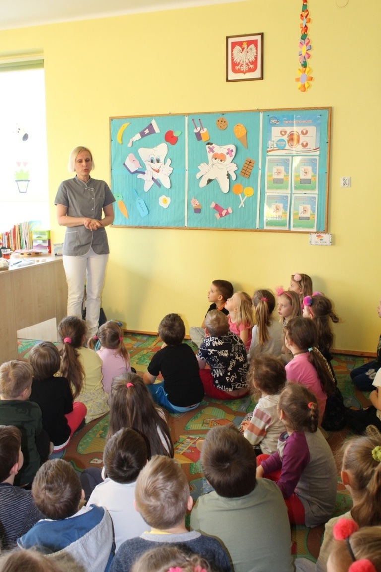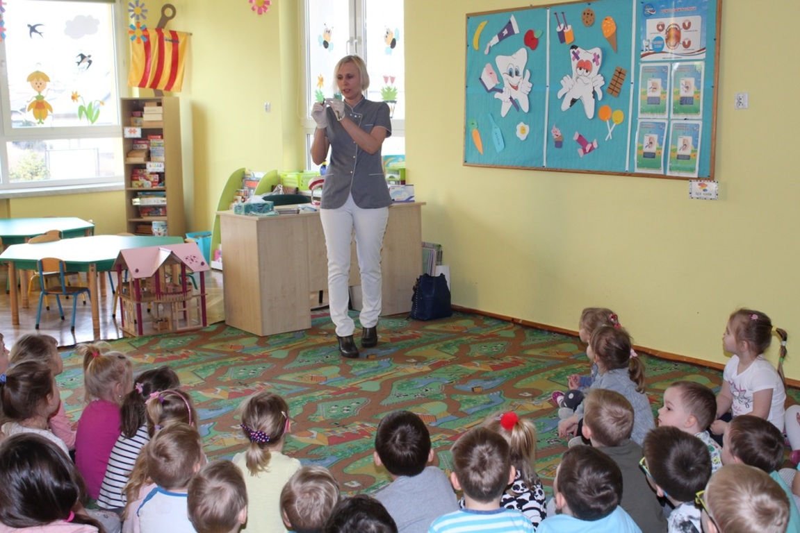 Ten miesiąc obfituje w wiele wydarzeń, jednym z nich było spotkanie 3 kwietnia z pani stomatolog - Martą Oleksiak-Gaj. W bardzo przystępnej i ciekawej formie tłumaczyła dzieciom, jak ważna jest higiena jamy ustnej, do czego doprowadza jej brak i w jaki sposób można pomóc chorym ząbkom. Za pomocą dużej szczotki i modelu szczęki przedszkolaki dowiedziały się, jak poprawnie szczotkować zęby. Zaś na podstawie opowiedzianej bajki, pani stomatolog przedstawiła sposób dbania o piękny i zdrowy uśmiech. Dzieci dowiedziały się, co to jest próchnica i dlaczego psują się zęby oraz jak prawidłowo należy je czyścić.