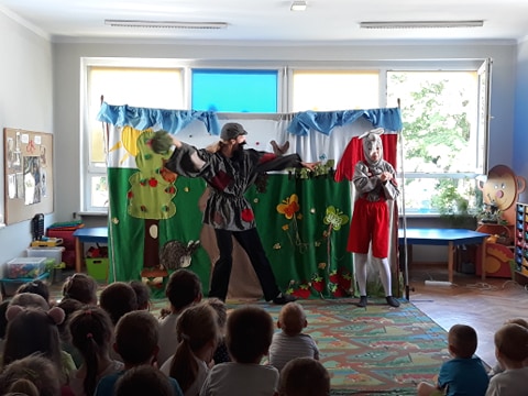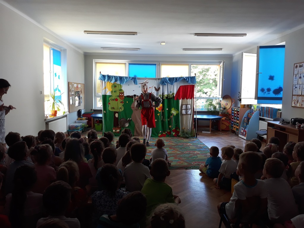 W dniu 11 czerwca po raz ostatni w tym roku szkolnym gościliśmy teatr "Skrzat" z Krakowa. Aktorzy tym razem zaprezzentowali się w przedstawieniu pt.:"Nowe przygody Koziołka Matołka". Dzieci z radością i zaciekawieniem oglądały miejsca jakie zwiedził Koziołek Matołek, i co ciekawego przydarzyło mu się w drodze do Pacanowa. Wraz z Koziołkiem dzieci odbywają podróż przez Amerykę, Afrykę, Chiny. Podczas tej podróży spotykają Babę Jagę, cesarza Chin, wodza afrykańskiego plemienia, króla i reżysera z Hollywood. Spektakl ten dostarczył dzieciom mnóstwo radości. Wszystkie przedszkolaki stały się aktywnymi uczestnikami tego przedstawienia. Wesołe piosenki śpiewane wraz z Koziołkiem sprawiły, że dzieci bawiły się doskonale podczas podróży Koziołka do Pacanowa.