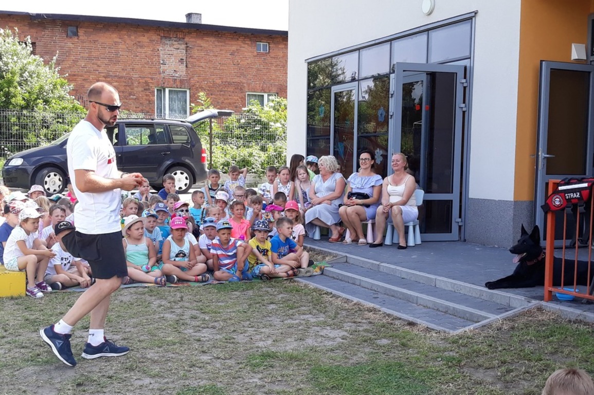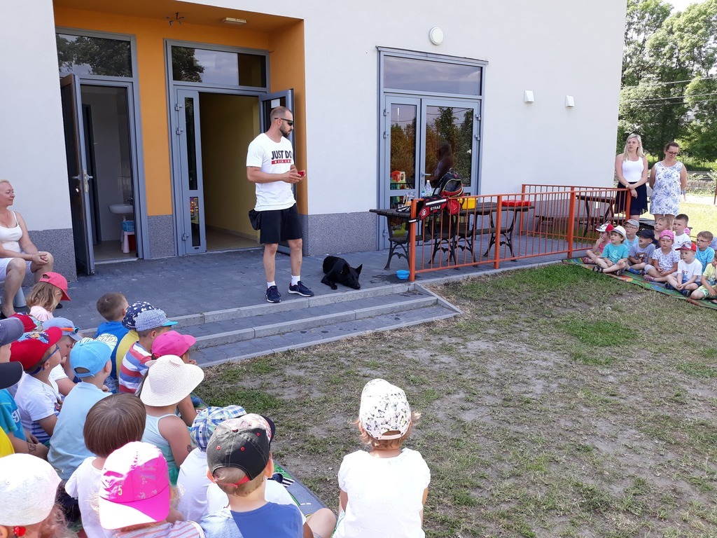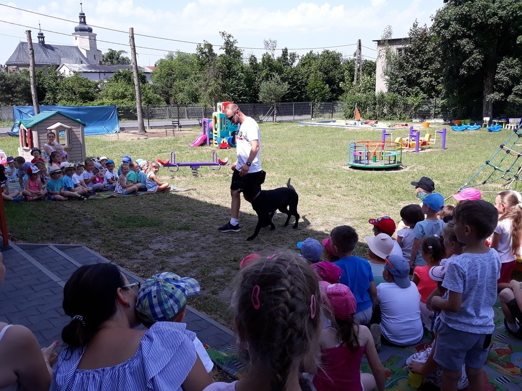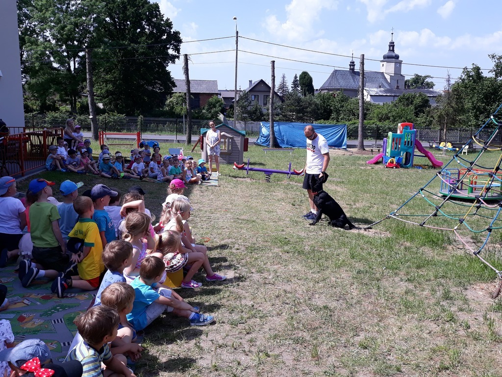 Koniec roku szkolnego obfituje u nas licznymi atrakcjami dla dzieci. Jedną z nich było spotkanie z przedstawicielem Centrum Pracy z Psem "Songo" Panem Mirosławem Dubiel, który jest uznanym treserem psów. Odwiedzając nas z psem Juką opowiedział nam o swojej bardzo ciekawej pracy jako tresera psów oraz przewodnika psa poszukiwawczo-ratowniczego, zaprezentował wraz z psem podstawowe umiejętności jakie nabywają psy w jego ośrodku. Dzieciom spotkanie to uświadomiło jak ważne jest właściwe podejście do psów, że nie jest to zabawka. Nauczyły jak właściwie należy się zachowywać w obecności psów jak również zobaczyły ich niezwykłe umiejętności. Było to bardzo ciekawe, pełne wrażeń spotkanie.