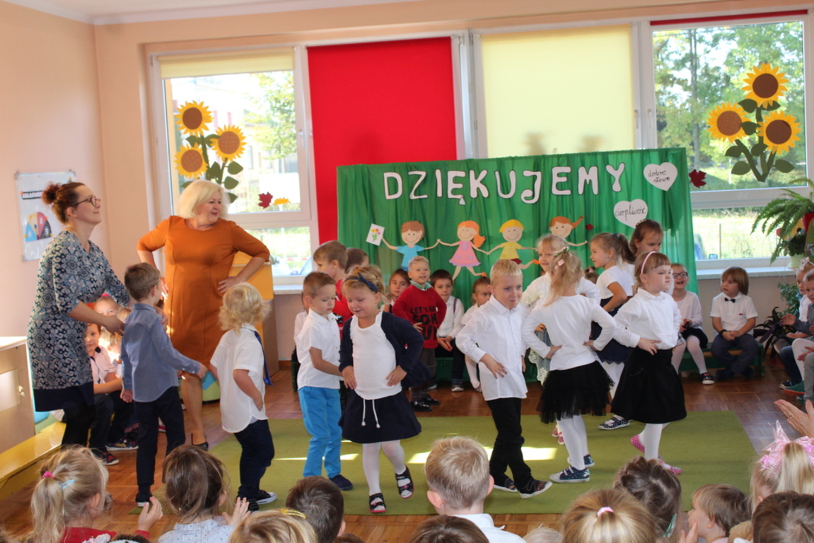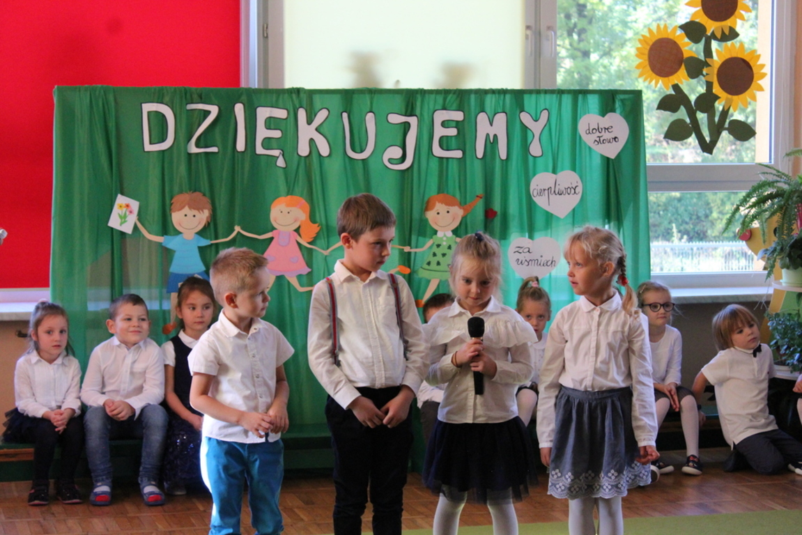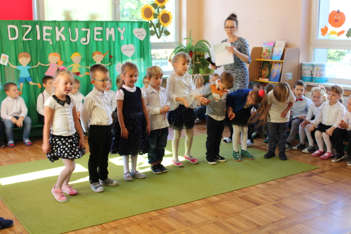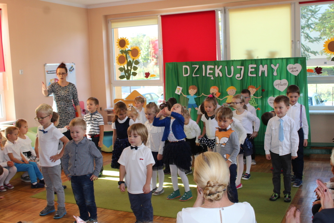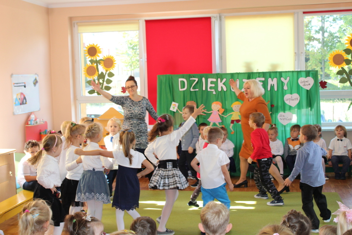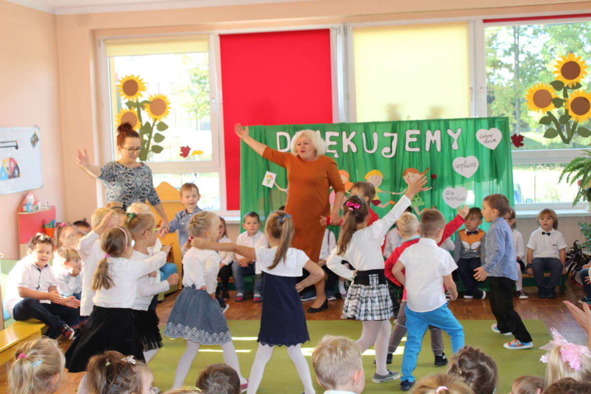Przedszkolaki w jesiennej scenerii podziękowały nauczycielkom oraz pracownikom obsługi za trud włożony w ich edukację i wychowanie. Poprzez wiersze, piosenki oraz życzenia dzieci wyraziły swoją wdzięczność za codzienną opiekę nad nimi, za trud, cierpliwość, miłość i wielkie poświęcenie.