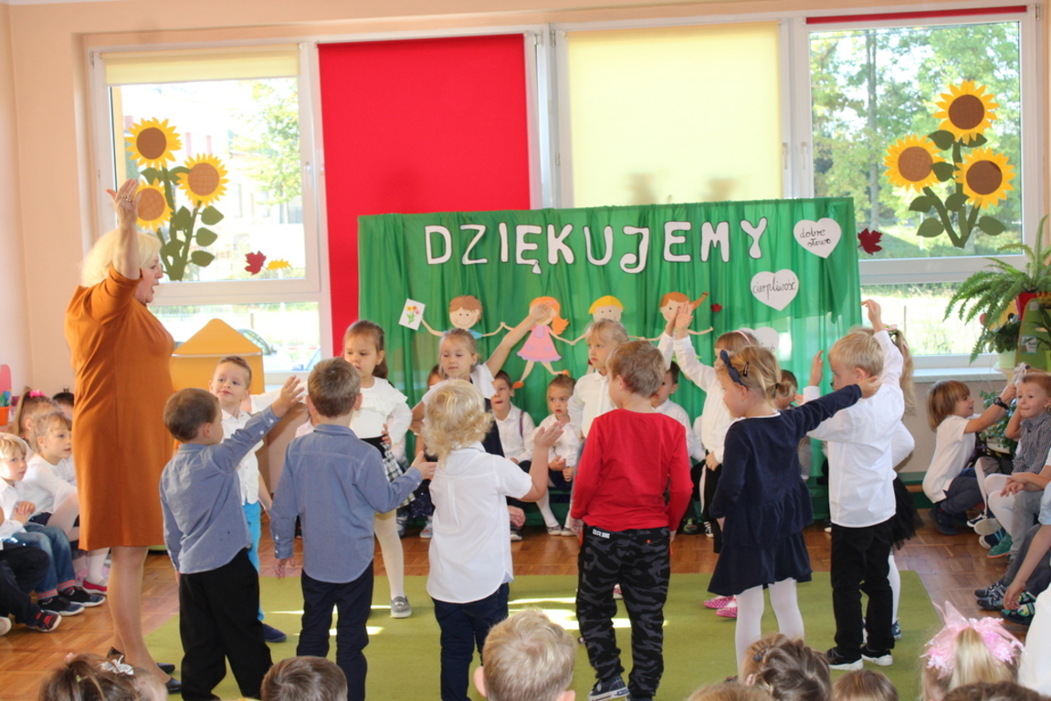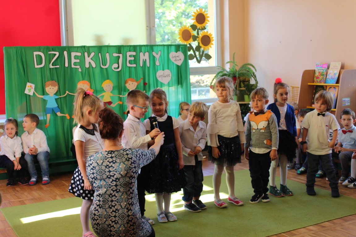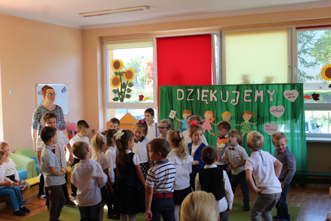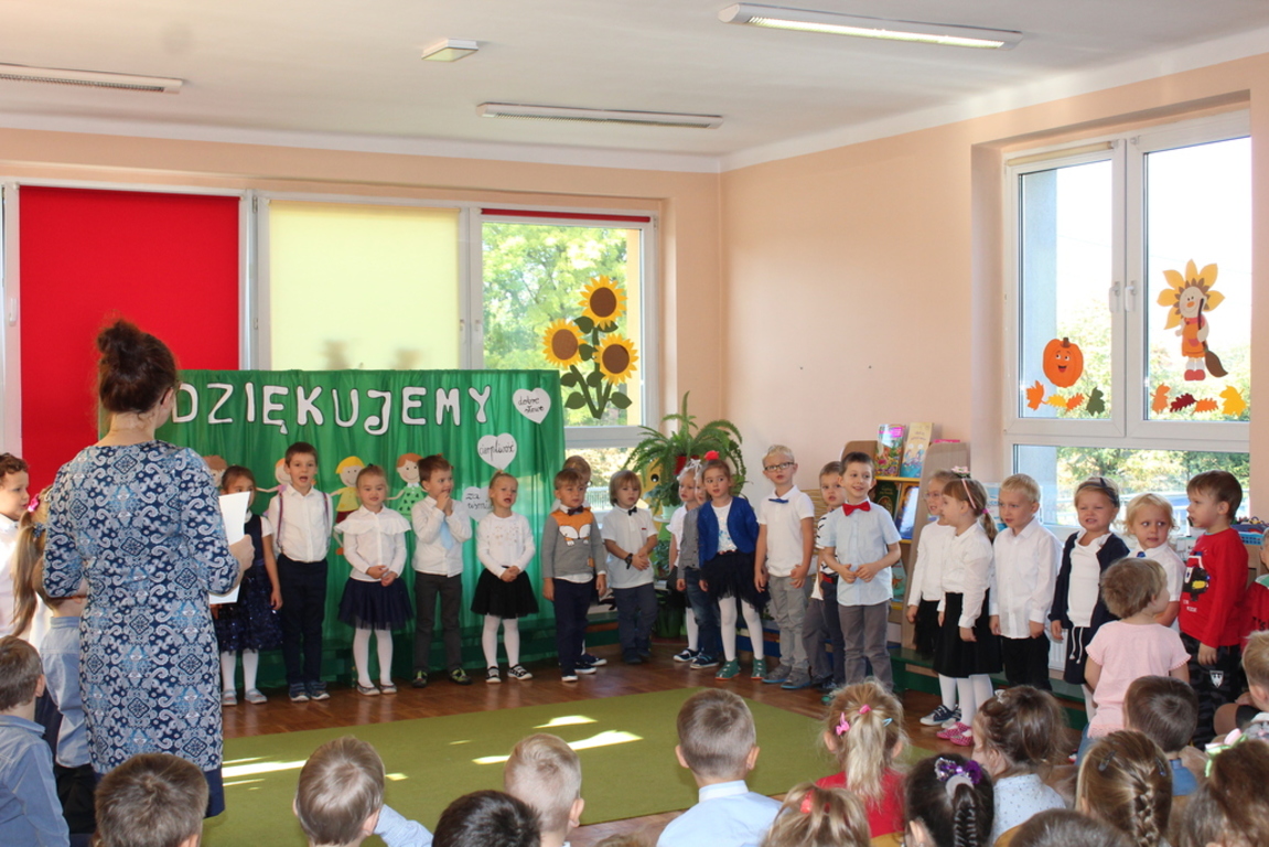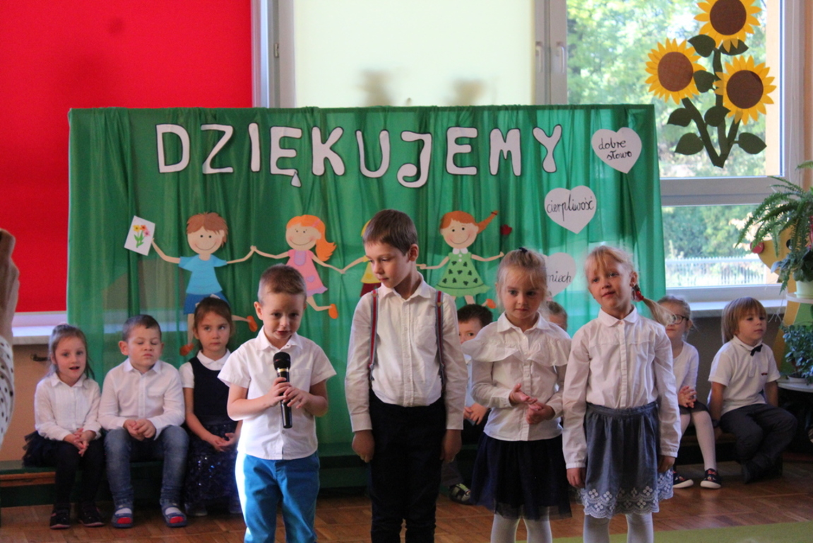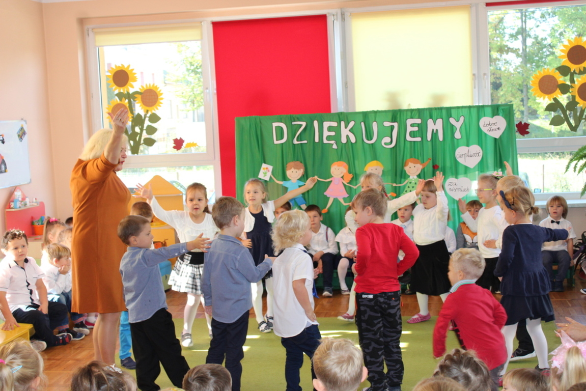 Przedszkolaki w jesiennej scenerii podziękowały nauczycielkom oraz pracownikom obsługi za trud włożony w ich edukację i wychowanie. Poprzez wiersze, piosenki oraz życzenia dzieci wyraziły swoją wdzięczność za codzienną opiekę nad nimi, za trud, cierpliwość, miłość i wielkie poświęcenie.