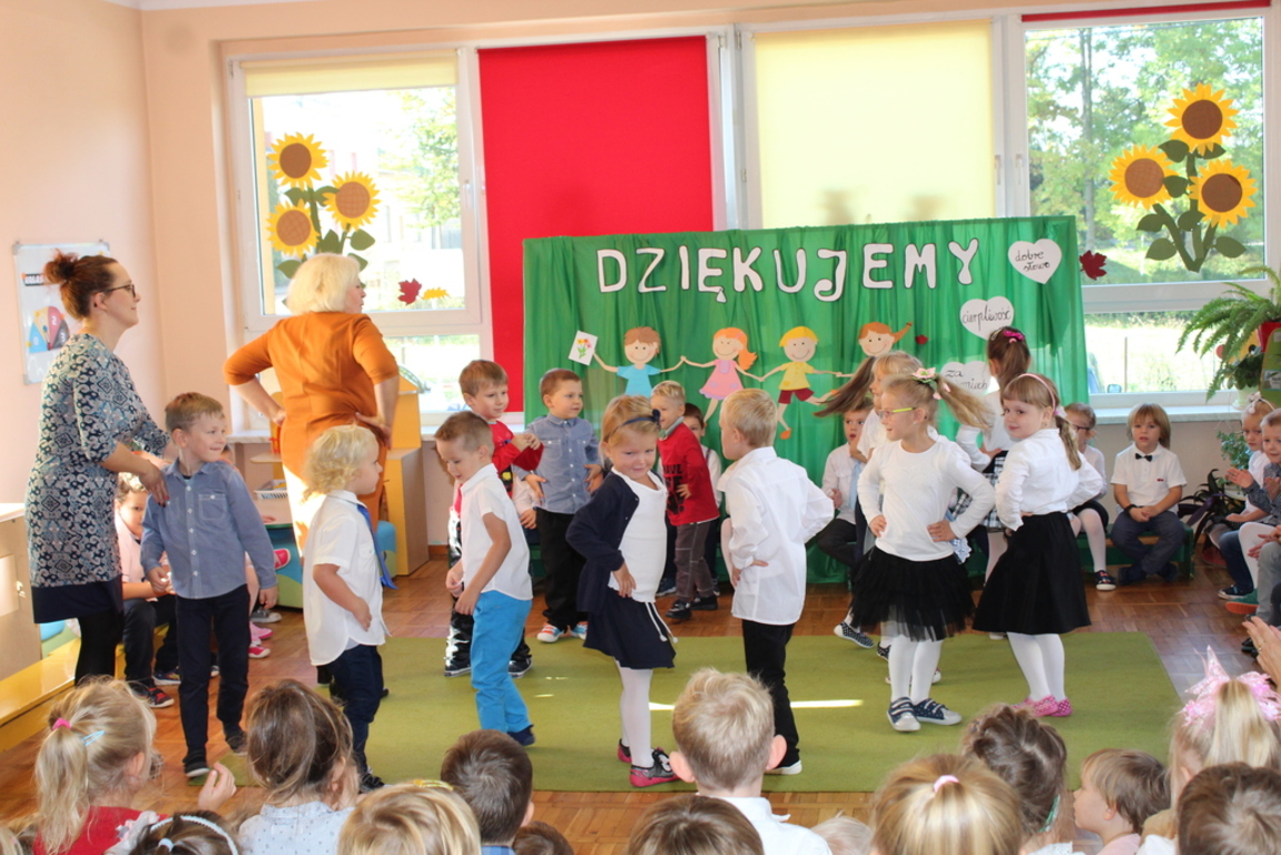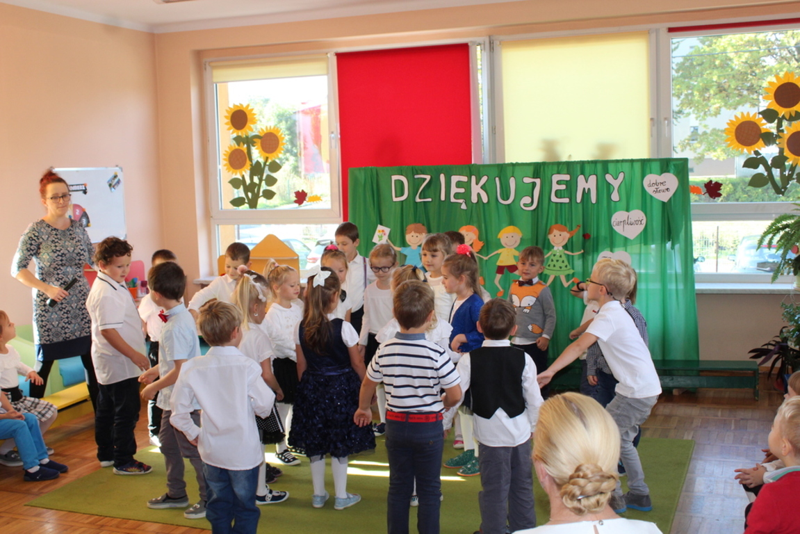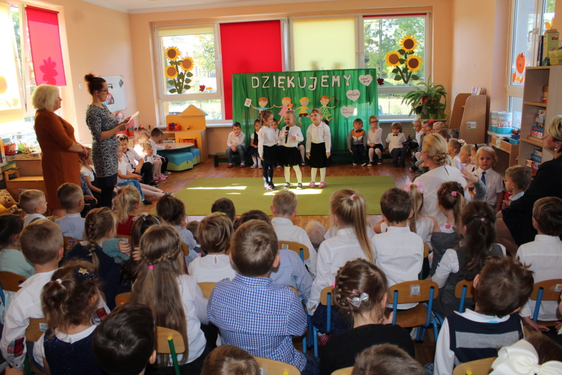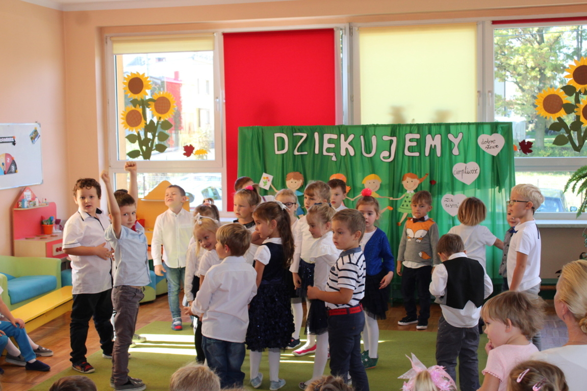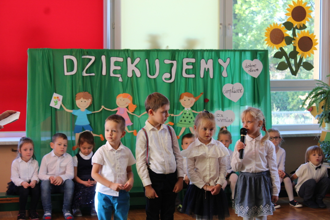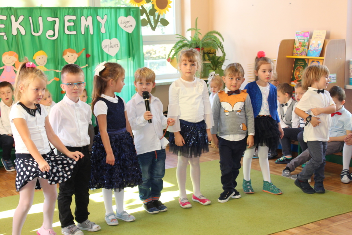 Przedszkolaki w jesiennej scenerii podziękowały nauczycielkom oraz pracownikom obsługi za trud włożony w ich edukację i wychowanie. Poprzez wiersze, piosenki oraz życzenia dzieci wyraziły swoją wdzięczność za codzienną opiekę nad nimi, za trud, cierpliwość, miłość i wielkie poświęcenie.