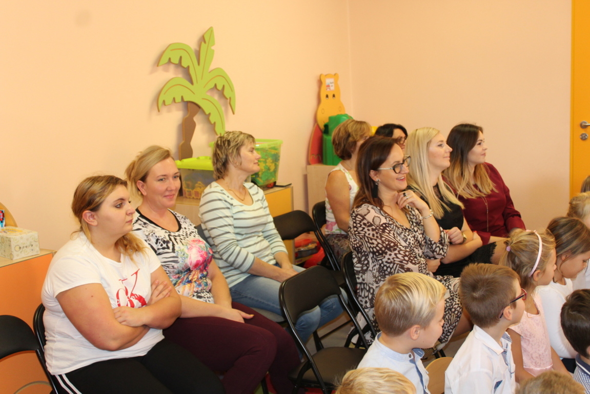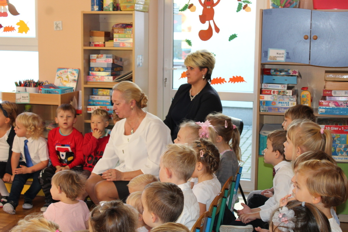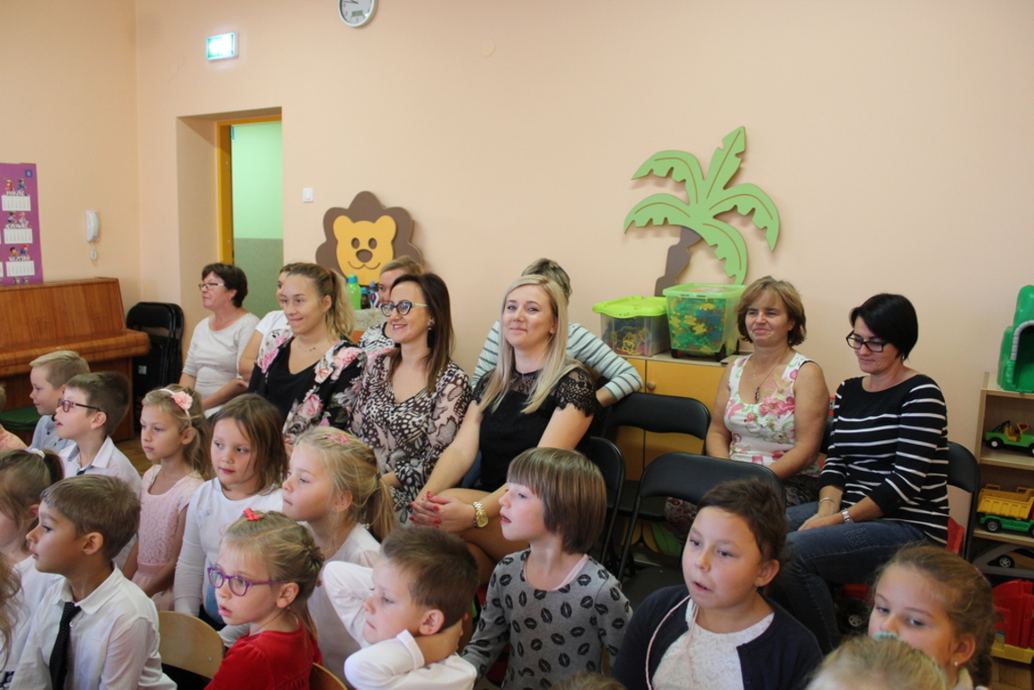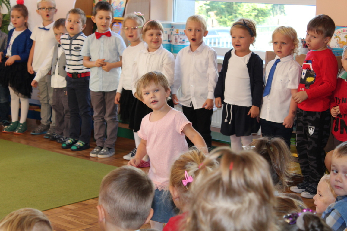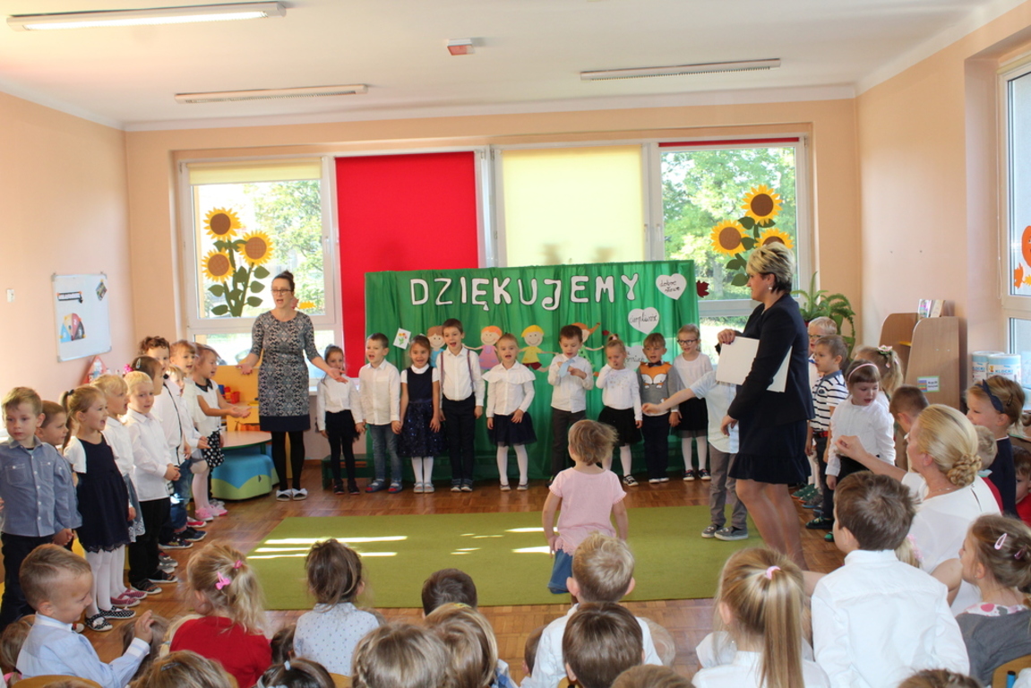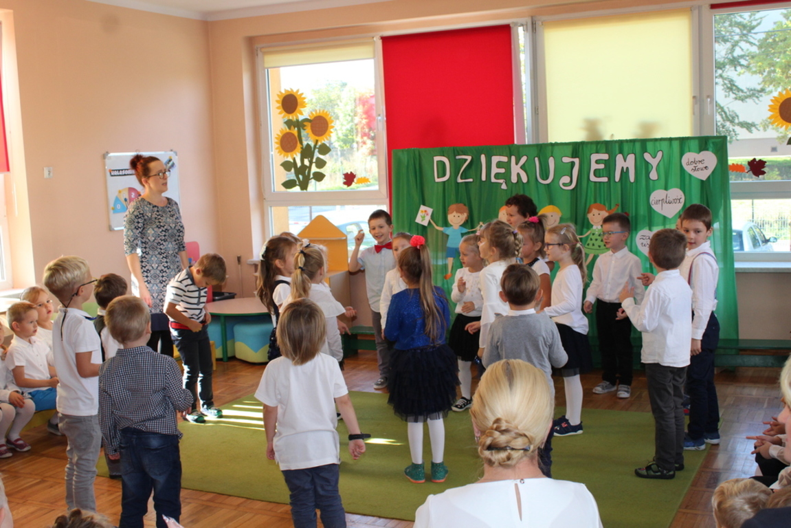 Przedszkolaki w jesiennej scenerii podziękowały nauczycielkom oraz pracownikom obsługi za trud włożony w ich edukację i wychowanie. Poprzez wiersze, piosenki oraz życzenia dzieci wyraziły swoją wdzięczność za codzienną opiekę nad nimi, za trud, cierpliwość, miłość i wielkie poświęcenie.