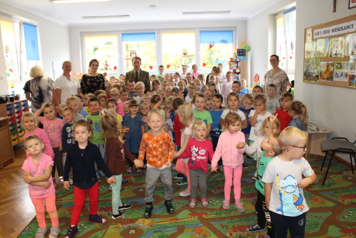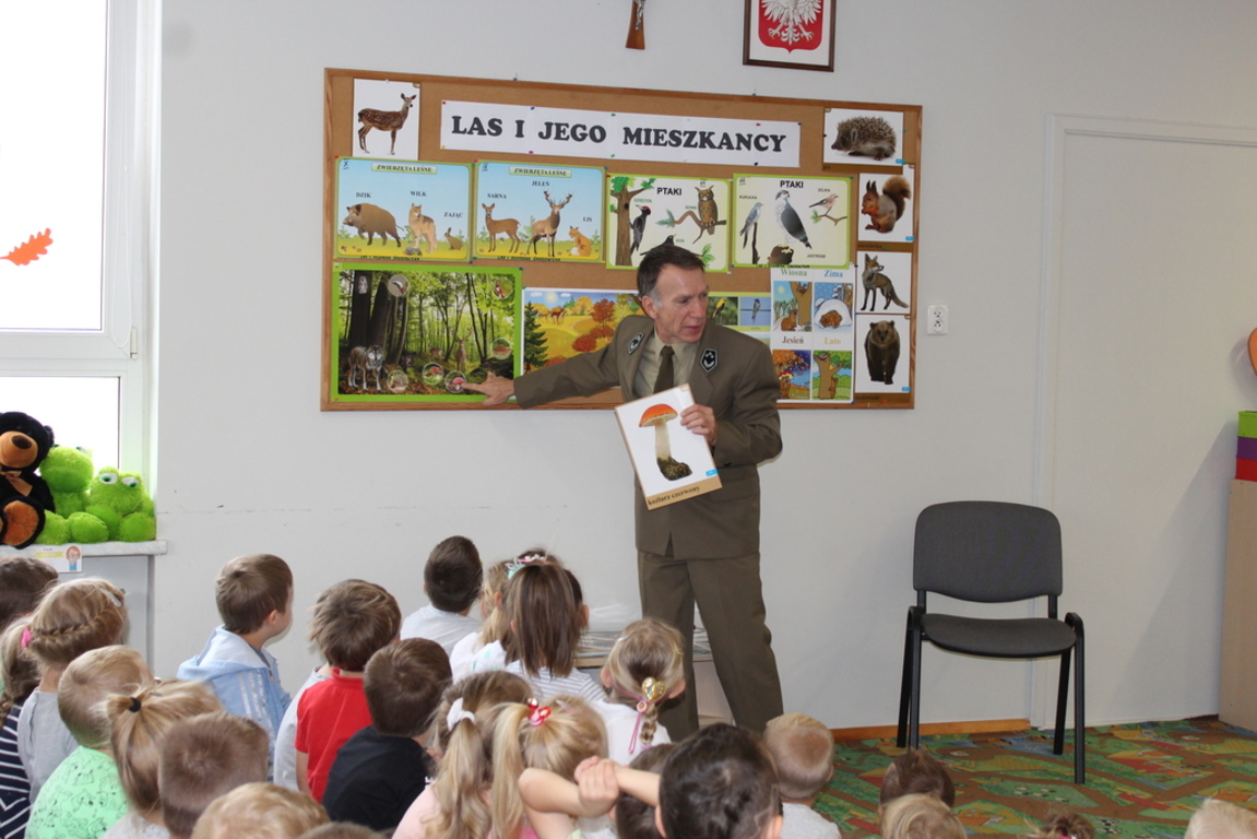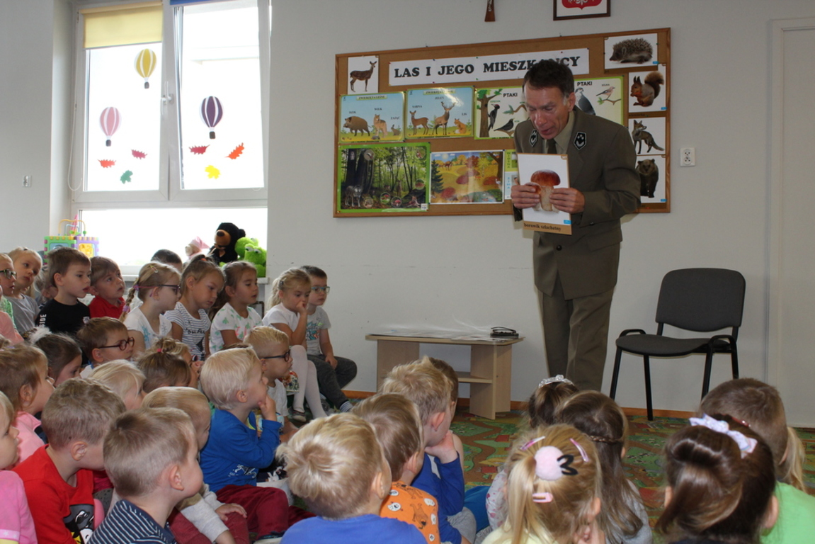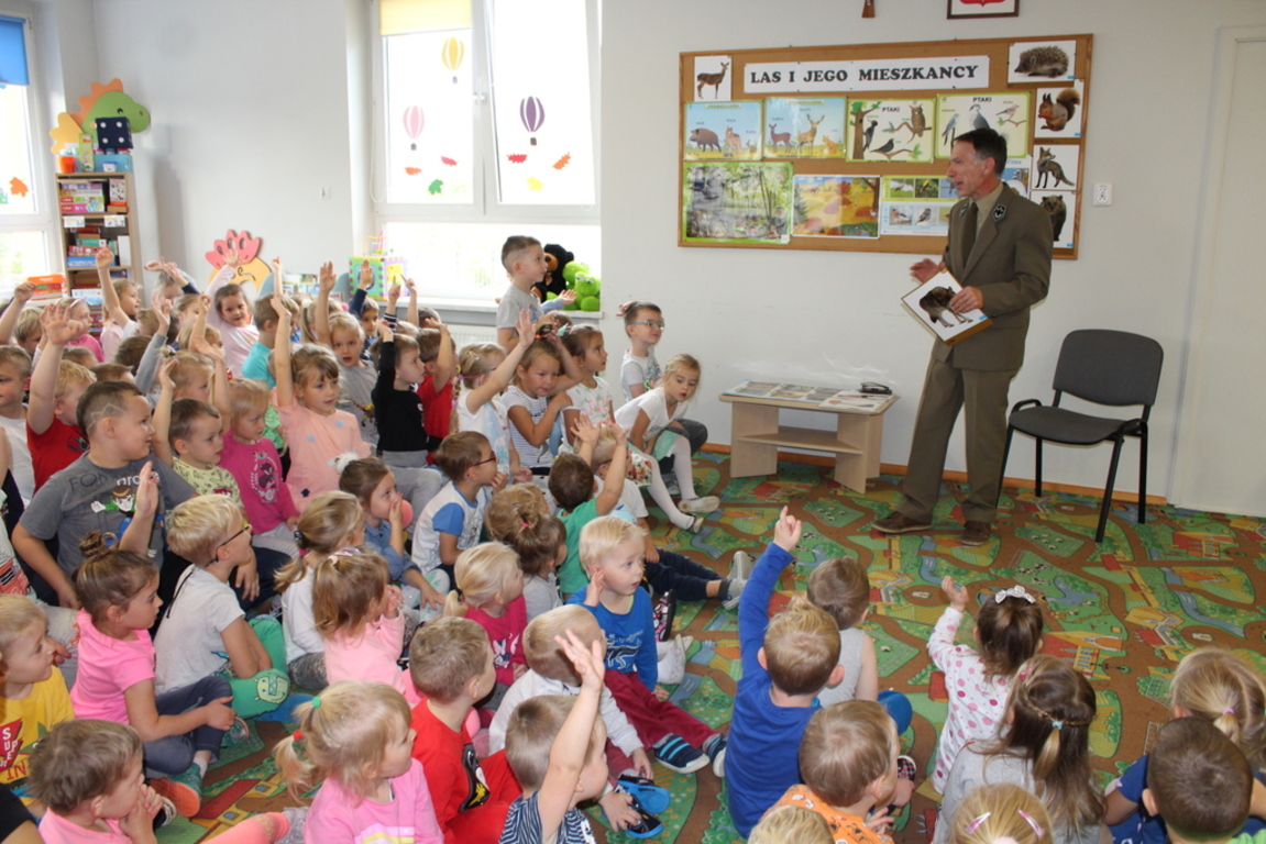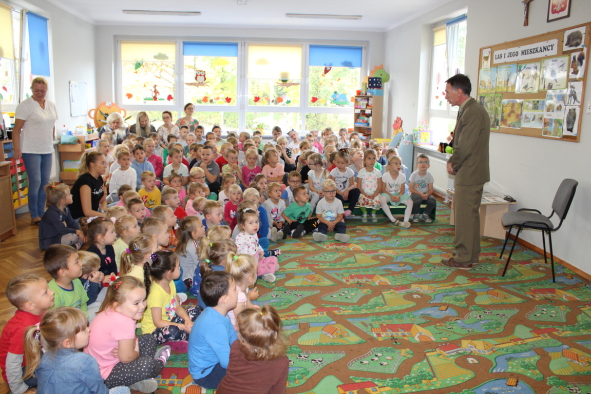 Nasze przedszkole 16 października odwiedził niezwykły gość – Leśniczy Pan Waldemar Bajor z Nadleśnictwa Świerklaniec. który poprowadził zajęcie w ramach tematu kompleksowego „Przygotowanie zwierząt do zimy”. Przedszkolaki oczekiwały gościa z niecierpliwością już od samego rana. Pan Waldemar opowiadał dzieciom o lesie i mieszkających w nim zwierzętach. Podkreślił, że człowiek jest gościem w lesie i musi szanować zwyczaje gospodarzy, czyli zwierząt w nim mieszkających. Podczas spotkania dzieci miały okazję poznać zwyczaje wybranych zwierząt: sarny, dzika, lisa, jelenia.