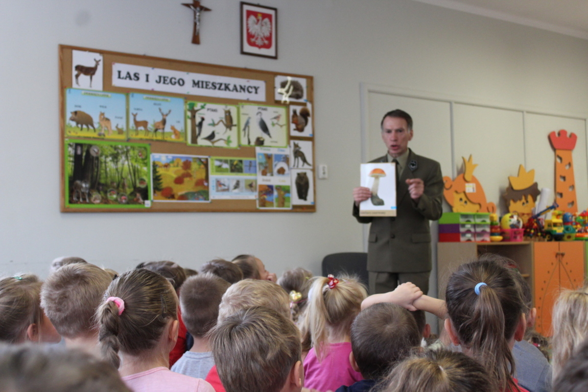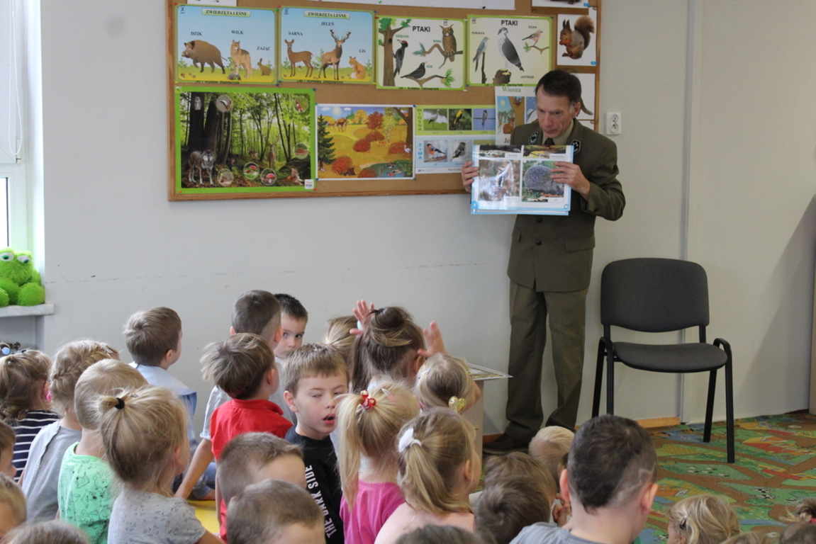 Dzieci dowiedziały się także, w jaki sposób pomagać zwierzętom i ptakom przetrwać zimę. Leśniczy zainteresował dzieci swoimi opowieściami o zwierzętach i ptakach wykorzystując różne ilustracje, obrazki. Dzieci z dużym zainteresowaniem obejrzały ciekawą prezentację.