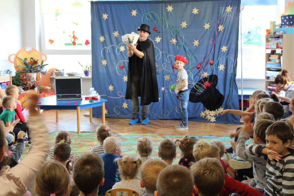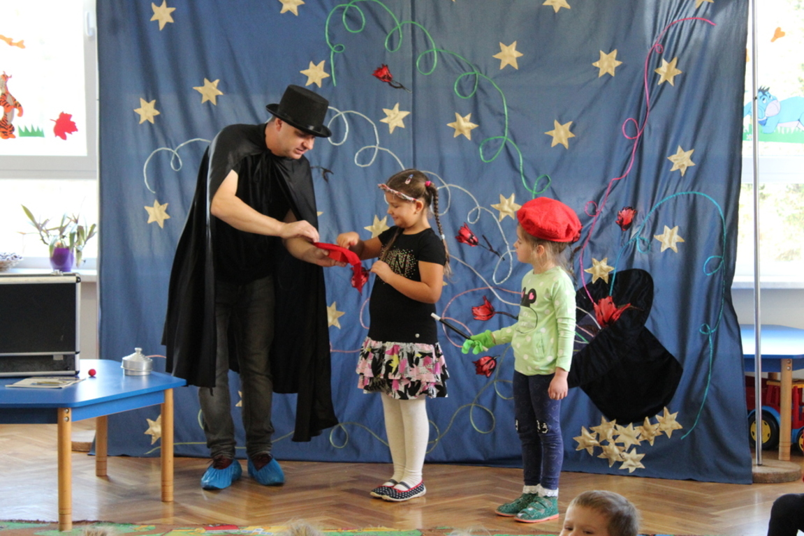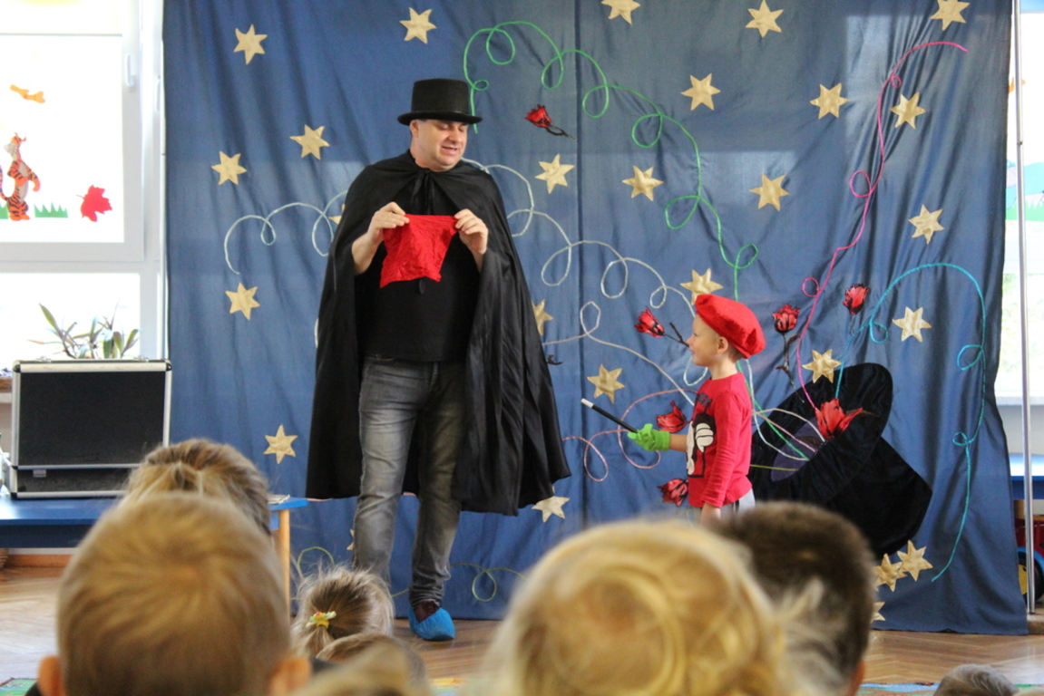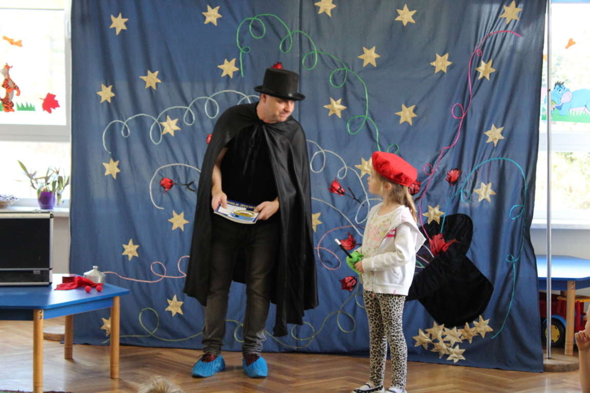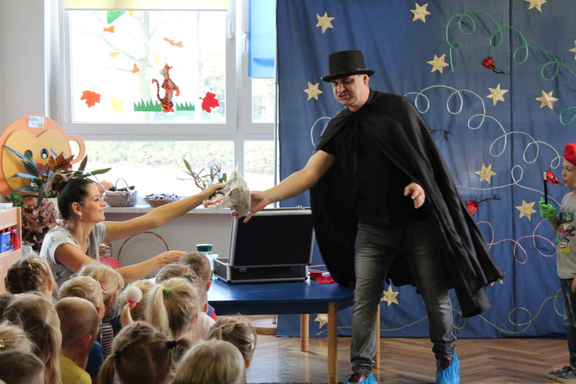 Przedszkolaki bardzo chętnie przenoszą się w świat baśni, czarów i magii. Taką właśnie okazję miały dzieci podczas wizyty w przedszkolu iluzjonisty 25 października. Zabawa w czarowanie bardzo wszystkim się podobała, szczególnie, gdy samemu można było pełnić przez chwilę rolę asystenta profesjonalnego iluzjonisty i otrzymać duże brawa od publiczności. Magik wprowadził wszystkich we wspaniały humor. Dzieci z dużym zaangażowaniem obserwowały każdy ruch iluzjonisty, aby przynajmniej nauczyć się jednej sztuczki. Chętnie nagradzały każdy pokaz gromkimi brawami. Uśmiech dzieci nie nikł jeszcze przez dłuższy czas. Wszyscy opowiadali o nieprawdopodobnych czarach w naszym przedszkolu i nadal zastanawiamy się, jak wlać mleko do gazety, żeby po jej rozłożeniu zniknęło? Może kiedyś się dowiemy?