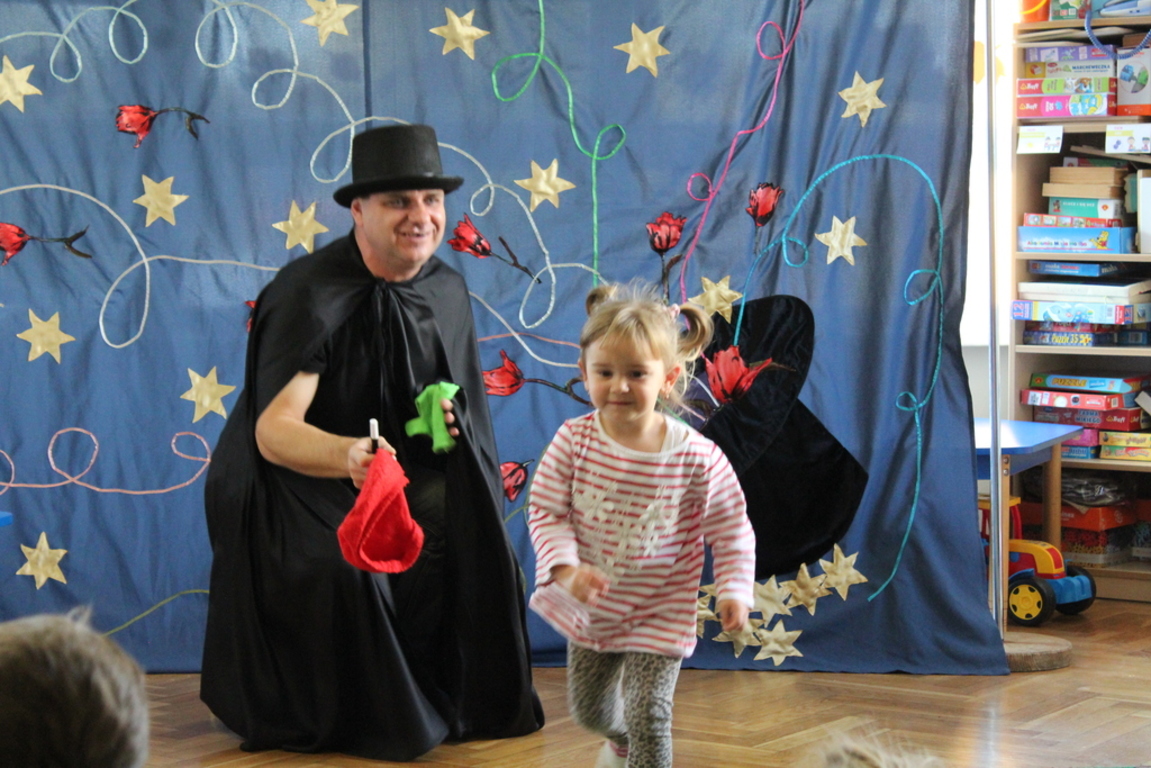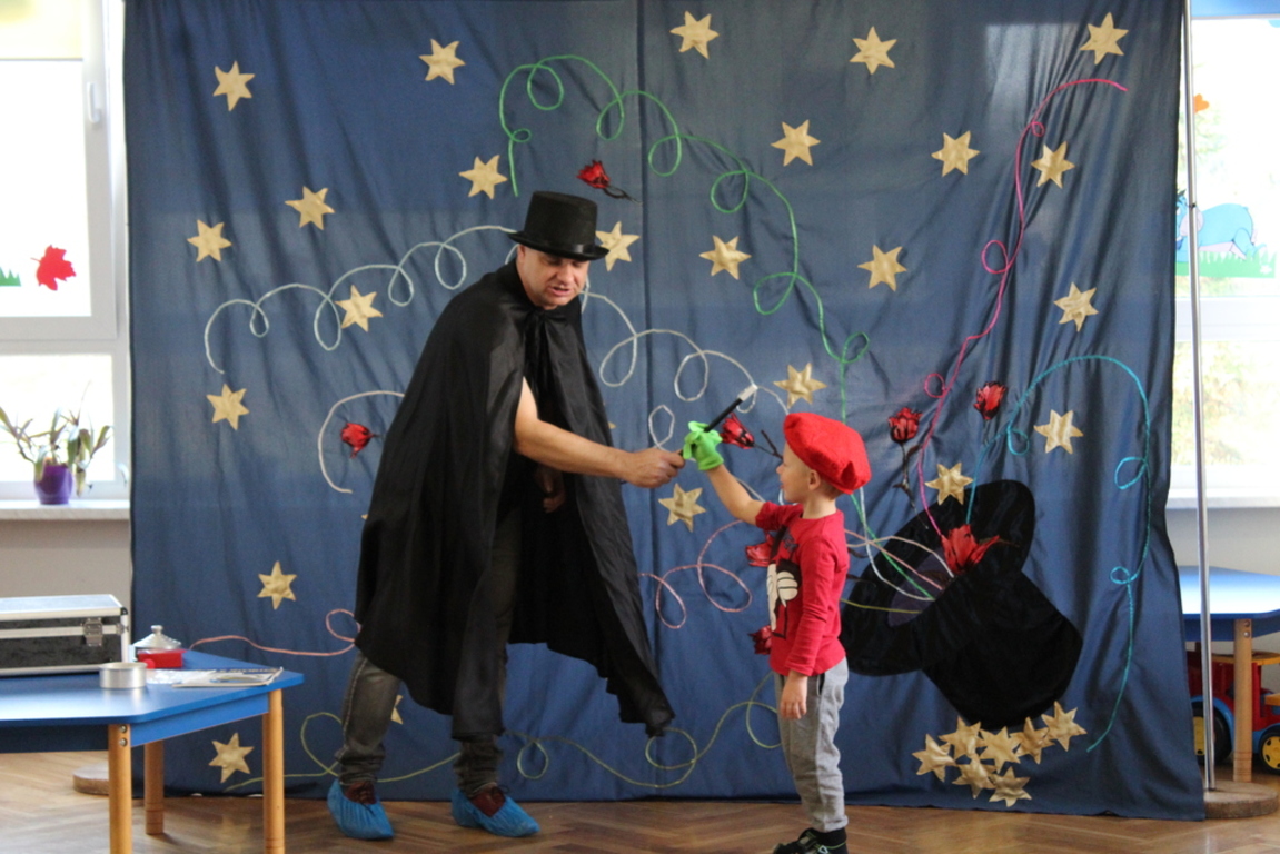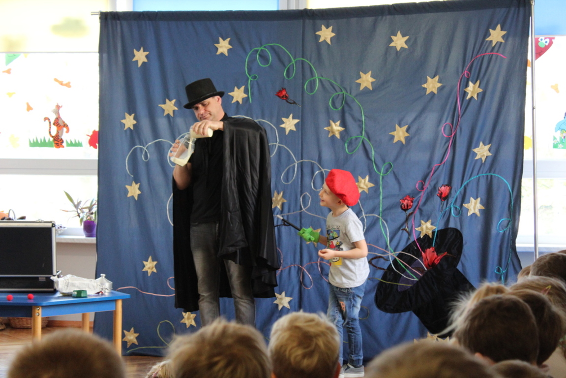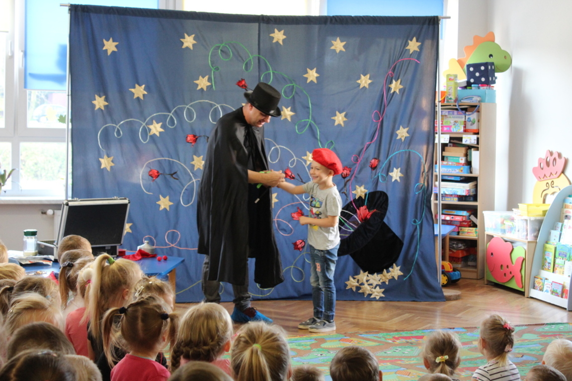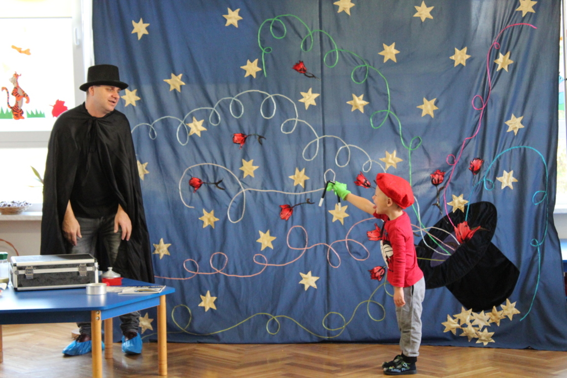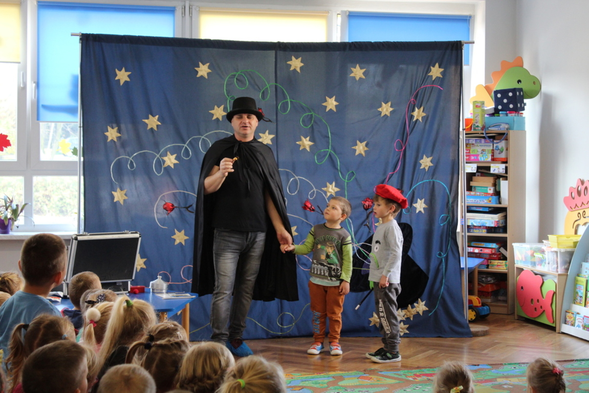 Przedszkolaki bardzo chętnie przenoszą się w świat baśni, czarów i magii. Taką właśnie okazję miały dzieci podczas wizyty w przedszkolu iluzjonisty 25 października. Zabawa w czarowanie bardzo wszystkim się podobała, szczególnie, gdy samemu można było pełnić przez chwilę rolę asystenta profesjonalnego iluzjonisty i otrzymać duże brawa od publiczności. Magik wprowadził wszystkich we wspaniały humor. Dzieci z dużym zaangażowaniem obserwowały każdy ruch iluzjonisty, aby przynajmniej nauczyć się jednej sztuczki. Chętnie nagradzały każdy pokaz gromkimi brawami. Uśmiech dzieci nie nikł jeszcze przez dłuższy czas. Wszyscy opowiadali o nieprawdopodobnych czarach w naszym przedszkolu i nadal zastanawiamy się, jak wlać mleko do gazety, żeby po jej rozłożeniu zniknęło? Może kiedyś się dowiemy?