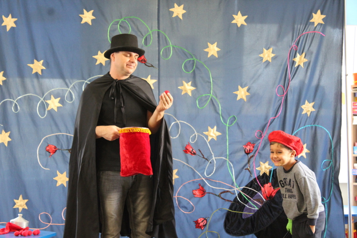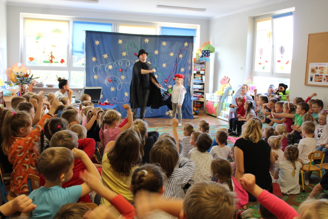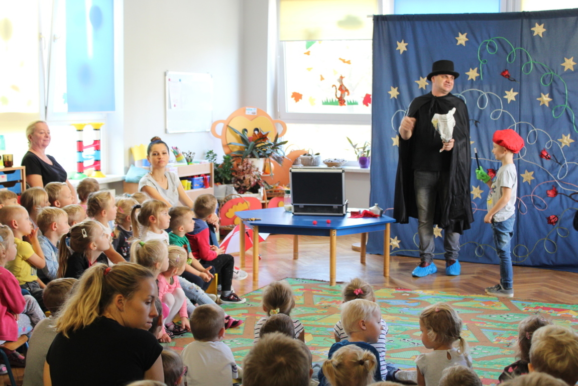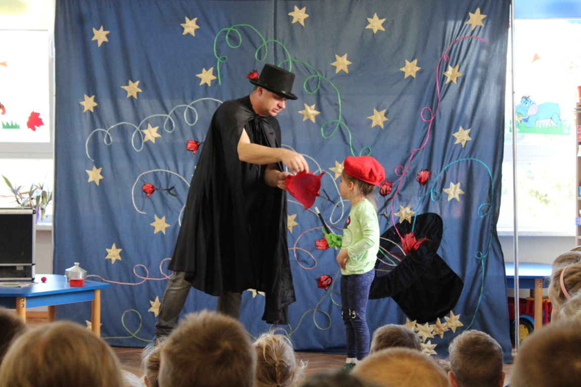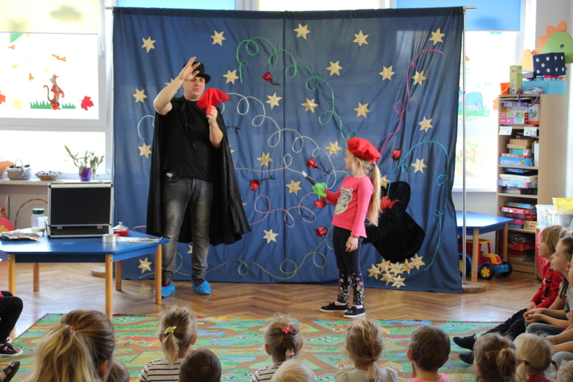 Przedszkolaki bardzo chętnie przenoszą się w świat baśni, czarów i magii. Taką właśnie okazję miały dzieci podczas wizyty w przedszkolu iluzjonisty 25 października. Zabawa w czarowanie bardzo wszystkim się podobała, szczególnie, gdy samemu można było pełnić przez chwilę rolę asystenta profesjonalnego iluzjonisty i otrzymać duże brawa od publiczności. Magik wprowadził wszystkich we wspaniały humor. Dzieci z dużym zaangażowaniem obserwowały każdy ruch iluzjonisty, aby przynajmniej nauczyć się jednej sztuczki. Chętnie nagradzały każdy pokaz gromkimi brawami. Uśmiech dzieci nie nikł jeszcze przez dłuższy czas. Wszyscy opowiadali o nieprawdopodobnych czarach w naszym przedszkolu i nadal zastanawiamy się, jak wlać mleko do gazety, żeby po jej rozłożeniu zniknęło? Może kiedyś się dowiemy?