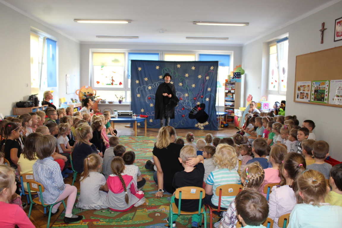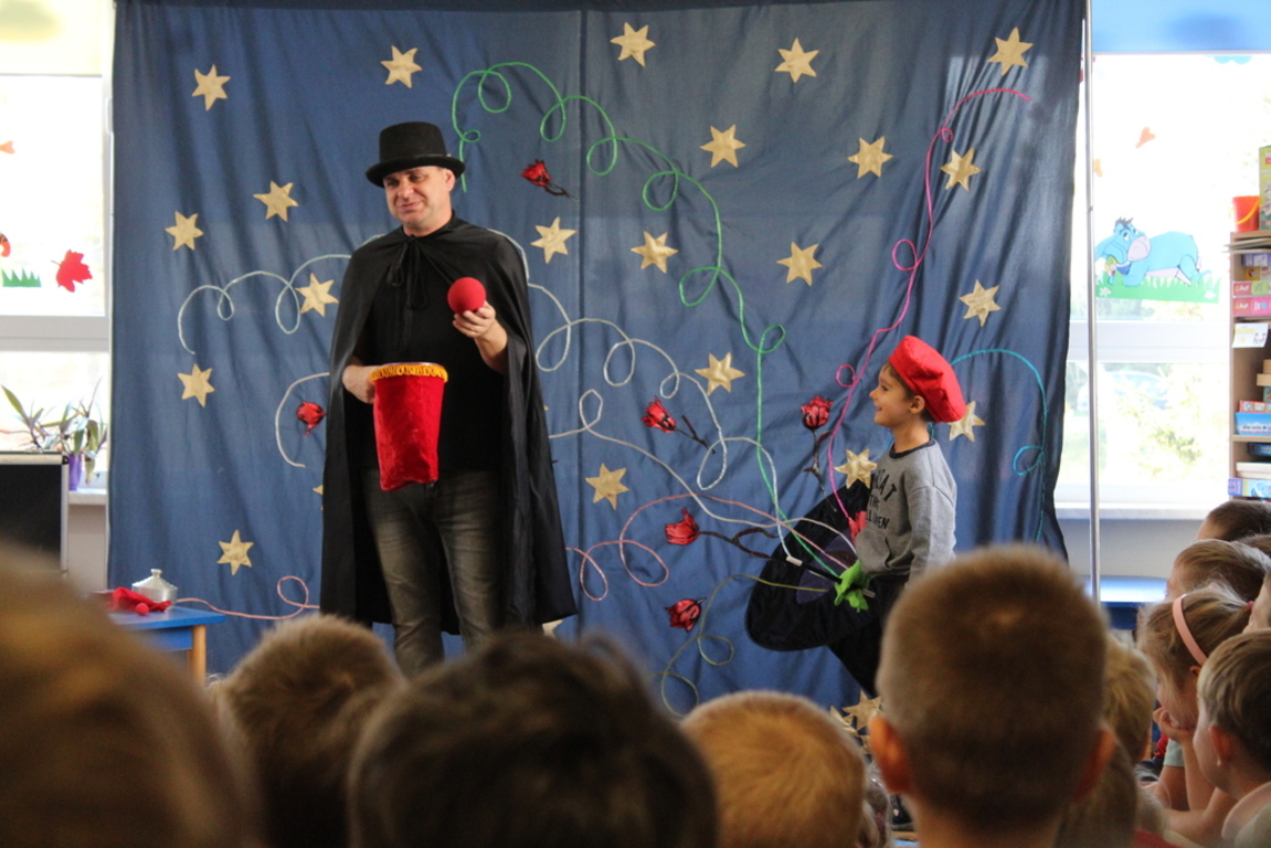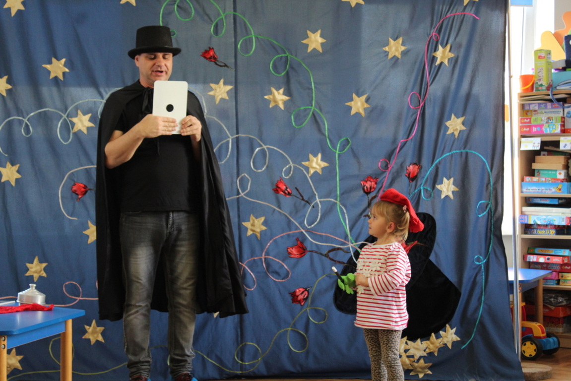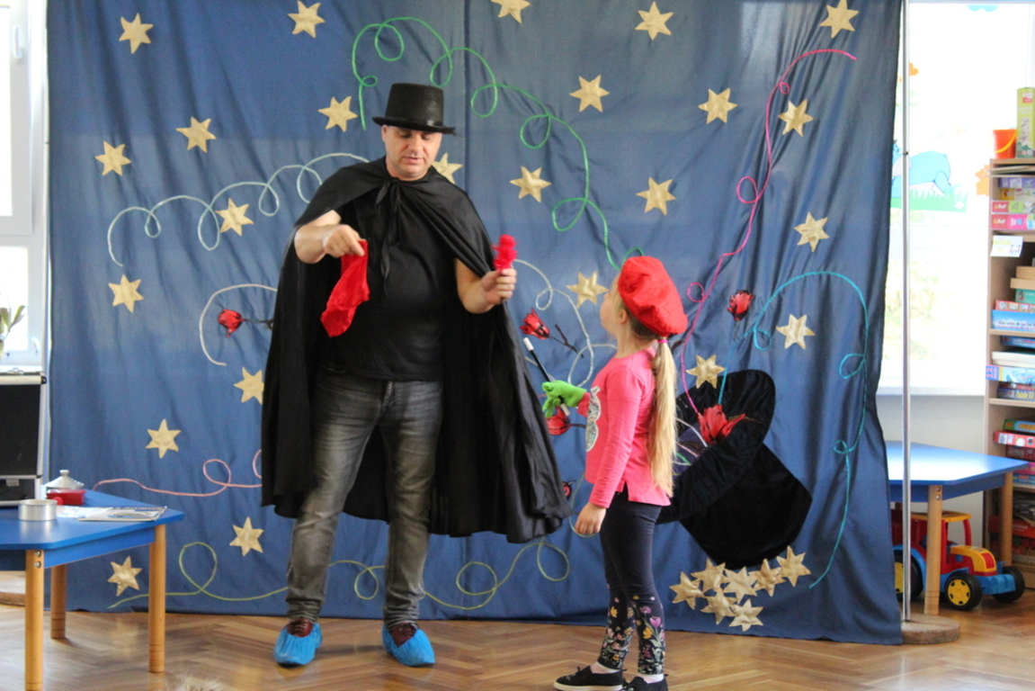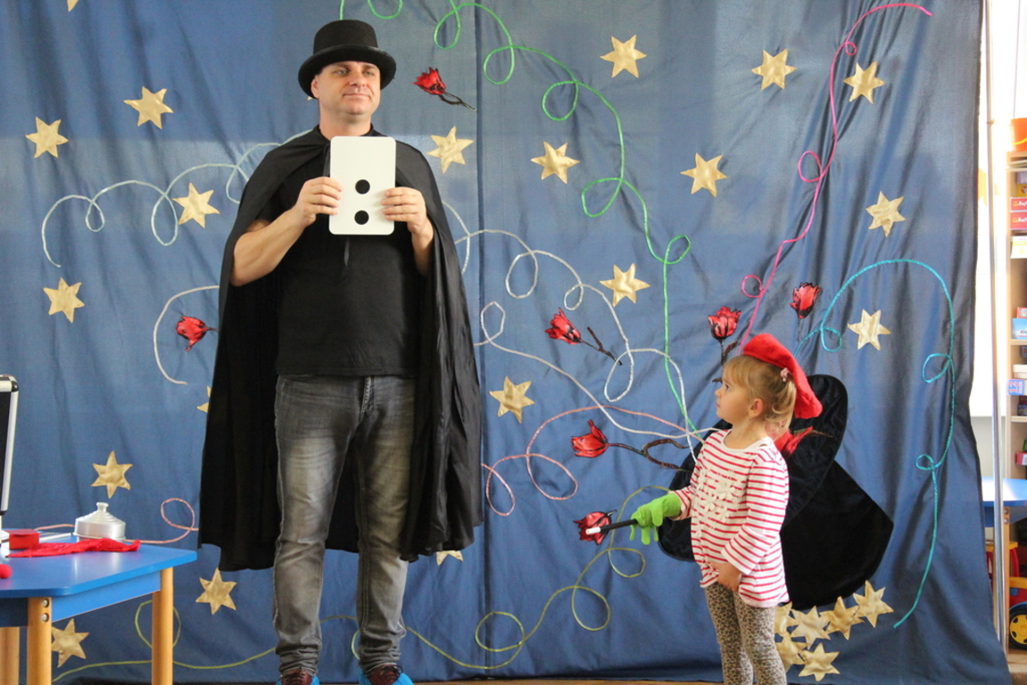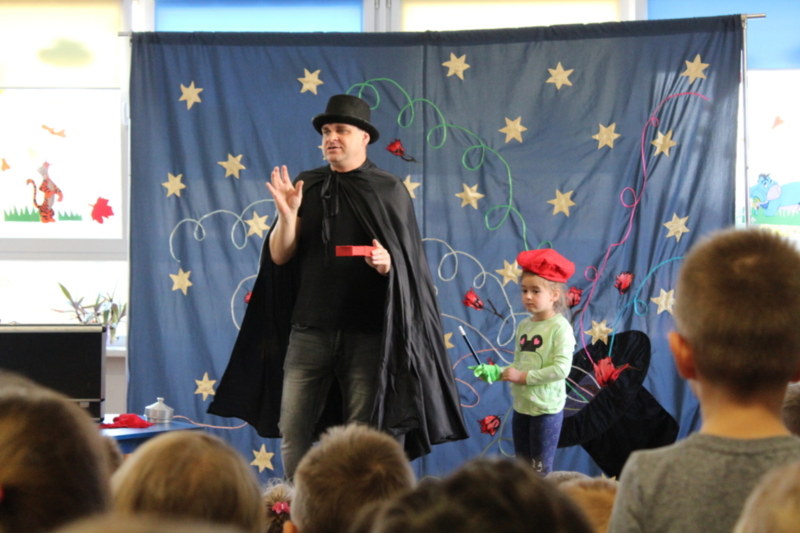 Przedszkolaki bardzo chętnie przenoszą się w świat baśni, czarów i magii. Taką właśnie okazję miały dzieci podczas wizyty w przedszkolu iluzjonisty 25 października. Zabawa w czarowanie bardzo wszystkim się podobała, szczególnie, gdy samemu można było pełnić przez chwilę rolę asystenta profesjonalnego iluzjonisty i otrzymać duże brawa od publiczności. Magik wprowadził wszystkich we wspaniały humor. Dzieci z dużym zaangażowaniem obserwowały każdy ruch iluzjonisty, aby przynajmniej nauczyć się jednej sztuczki. Chętnie nagradzały każdy pokaz gromkimi brawami. Uśmiech dzieci nie nikł jeszcze przez dłuższy czas. Wszyscy opowiadali o nieprawdopodobnych czarach w naszym przedszkolu i nadal zastanawiamy się, jak wlać mleko do gazety, żeby po jej rozłożeniu zniknęło? Może kiedyś się dowiemy?