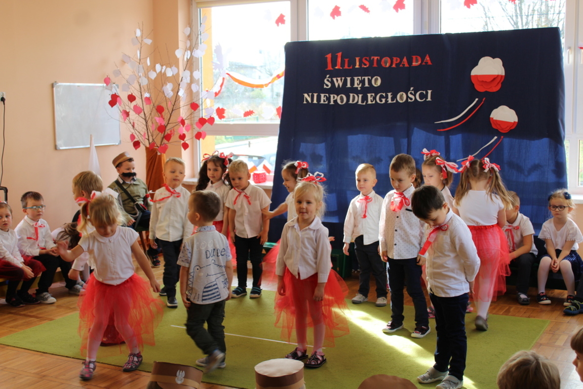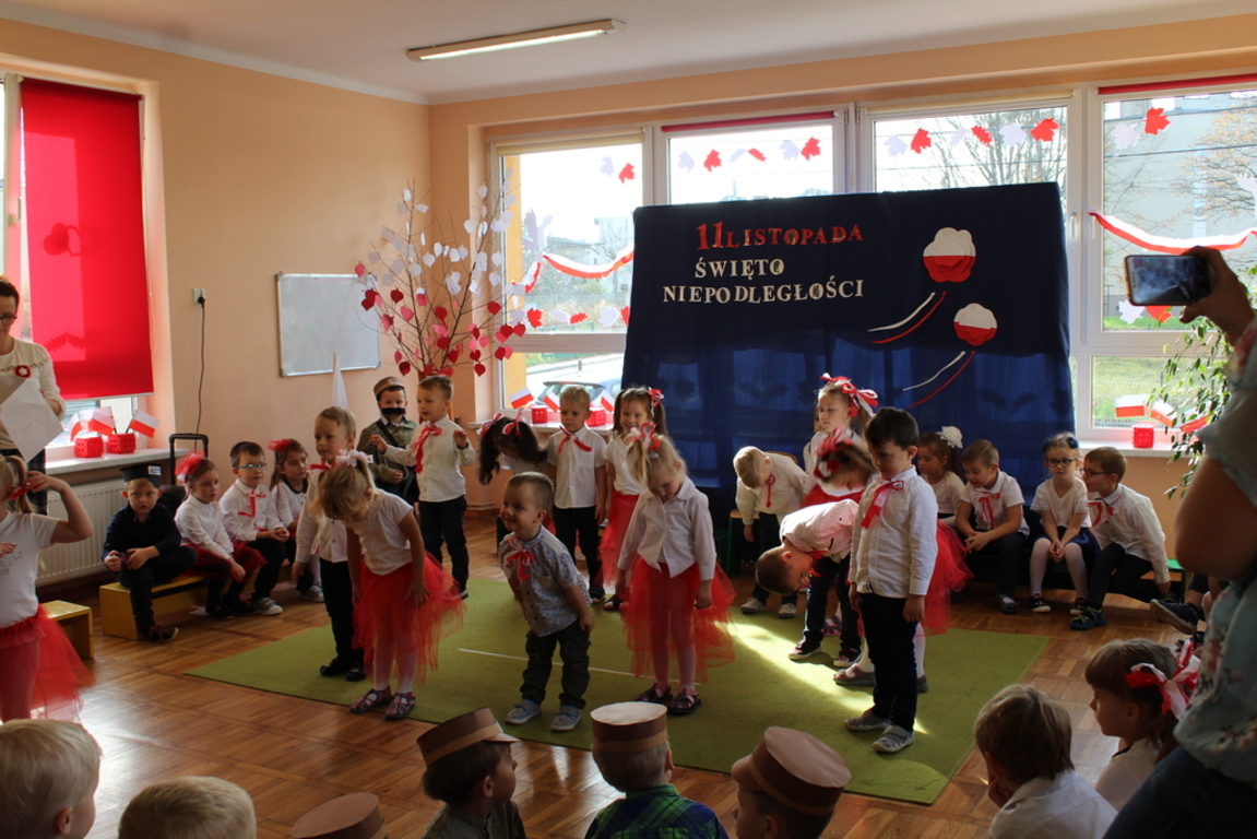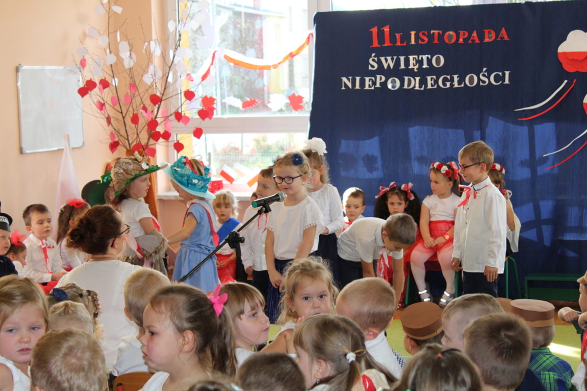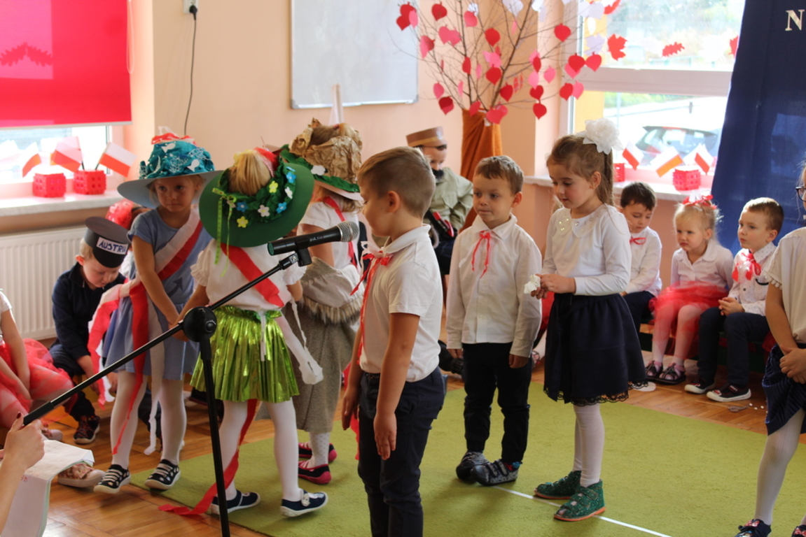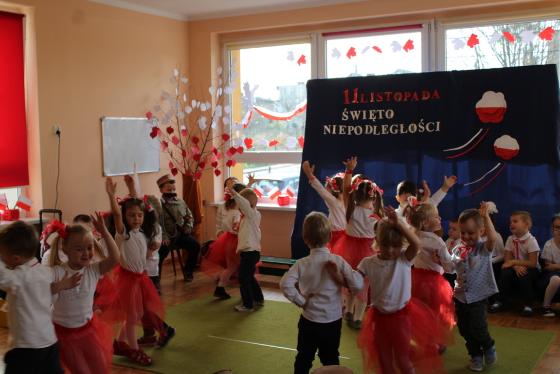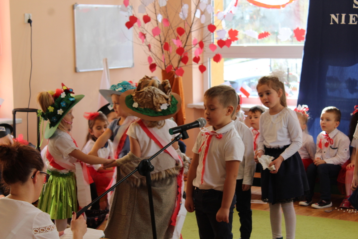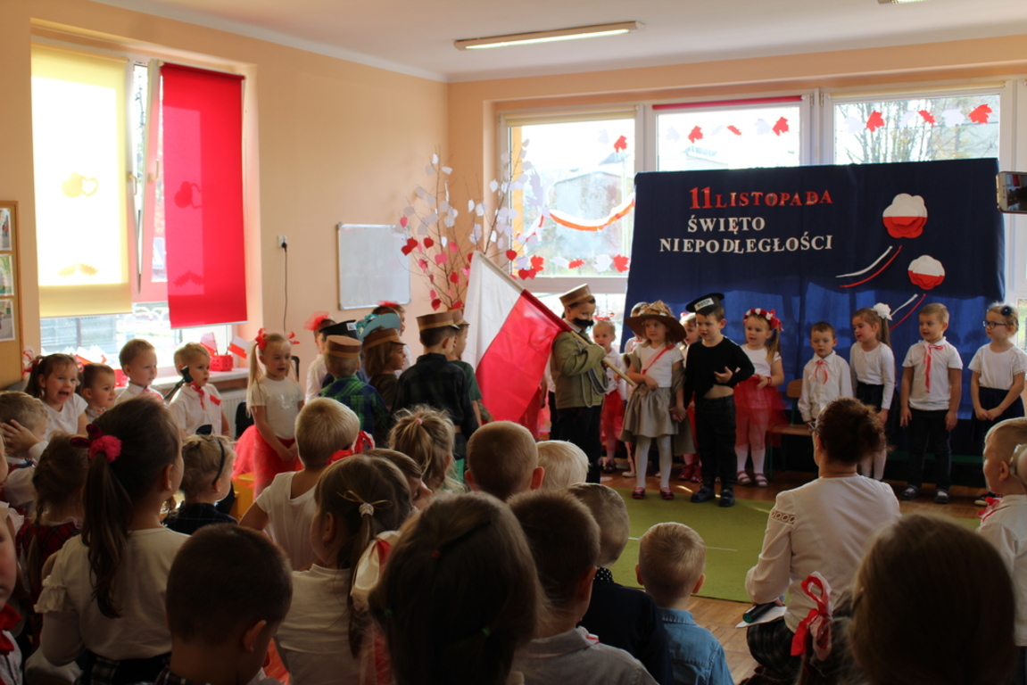 Pamiętając, że nie zawsze mogliśmy cieszyć się wolnością grupy II i IV pod kierunkiem wychowawczyń, Pań Magdaleny Jegerczyk i Anny Skop zaprezentowały program artystyczny podczas którego, zaprezentowana została krótka inscenizacja dotycząca tak ważnego wydarzenia jakim było odzyskanie przez Polskę Niepodległości. Dzieci recytowały również wiersze patriotyczne jak i te tłumaczące sens współczesnej polskości oraz nawiązujące do dostrzegania piękna ojczyzny.