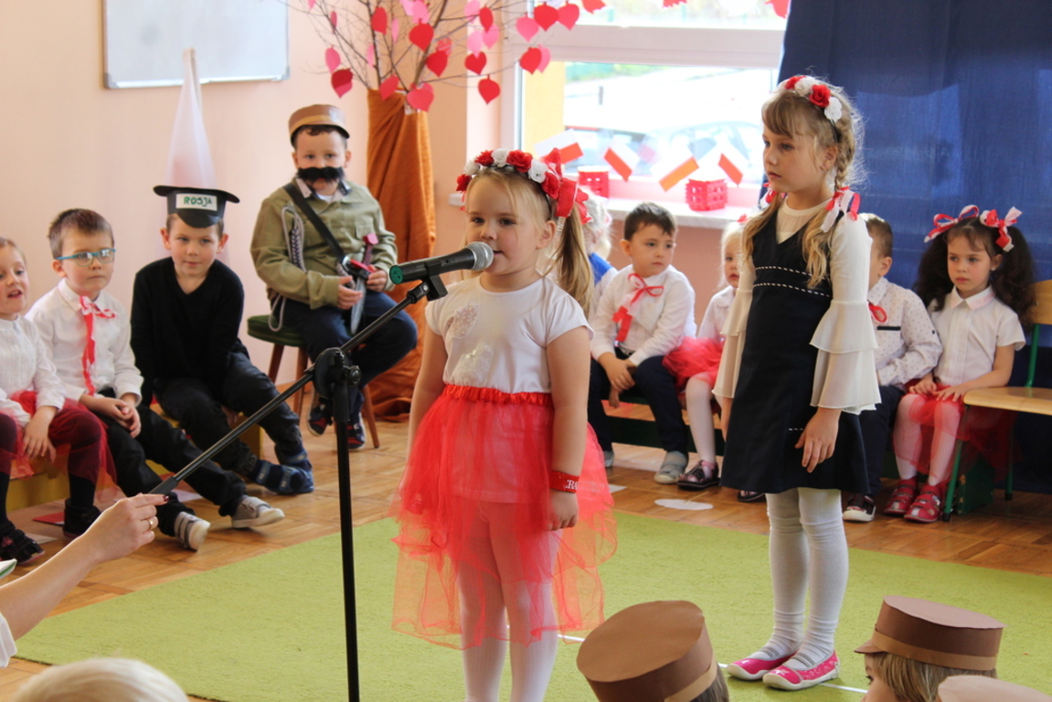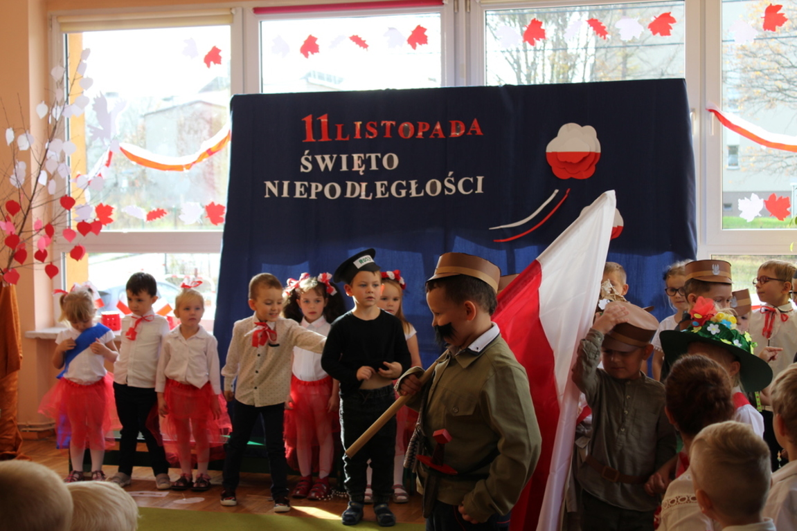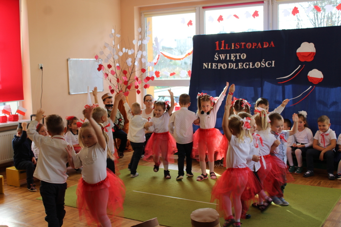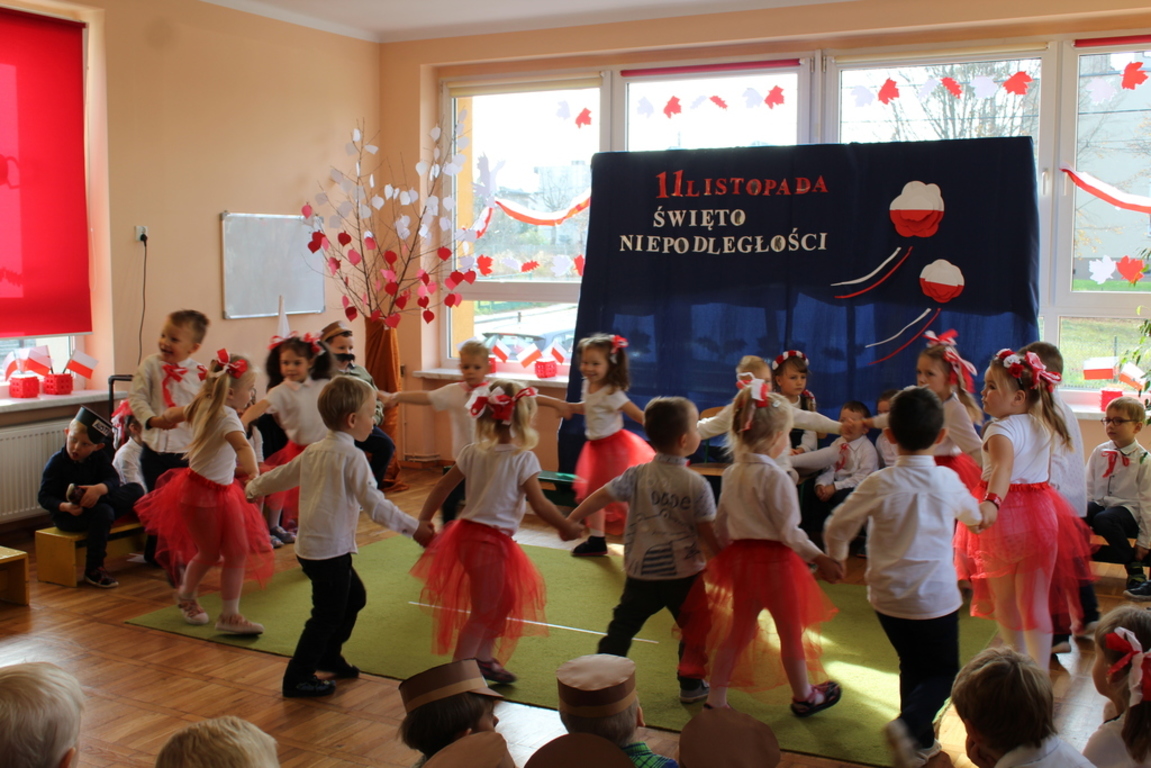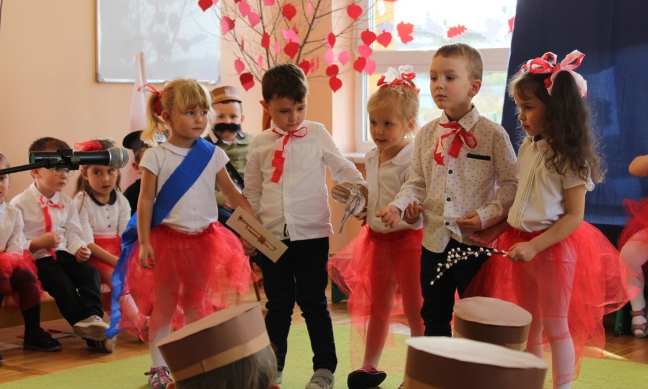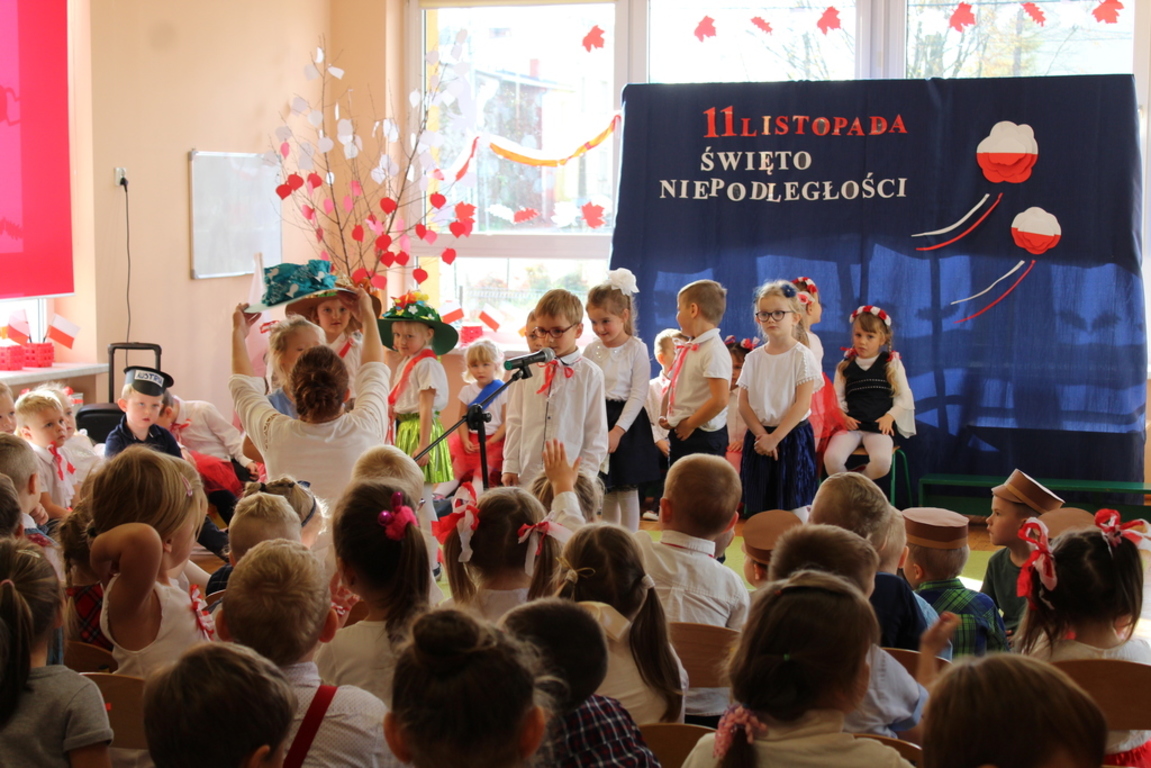 Pamiętając, że nie zawsze mogliśmy cieszyć się wolnością grupy II i IV pod kierunkiem wychowawczyń, Pań Magdaleny Jegerczyk i Anny Skop zaprezentowały program artystyczny podczas którego, zaprezentowana została krótka inscenizacja dotycząca tak ważnego wydarzenia jakim było odzyskanie przez Polskę Niepodległości. Dzieci recytowały również wiersze patriotyczne jak i te tłumaczące sens współczesnej polskości oraz nawiązujące do dostrzegania piękna ojczyzny.
