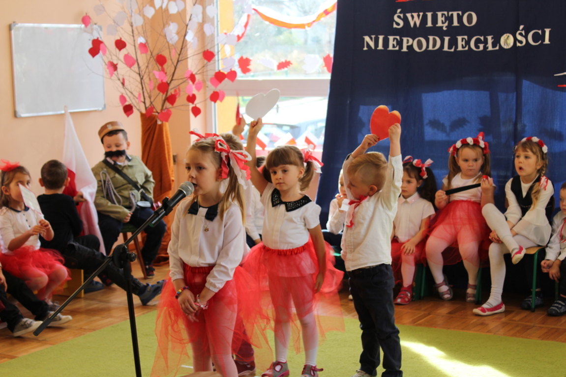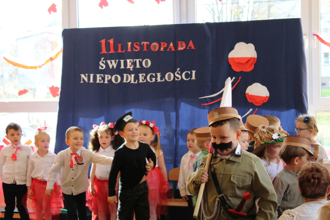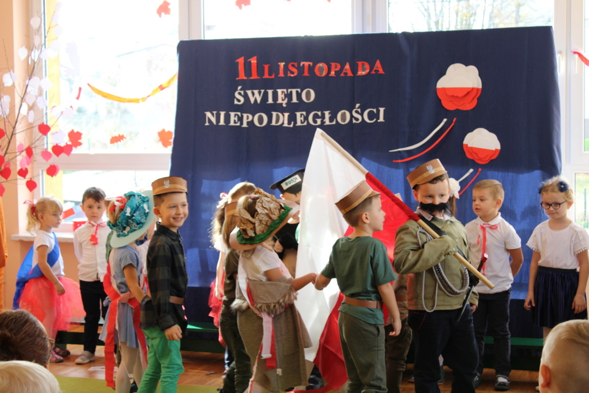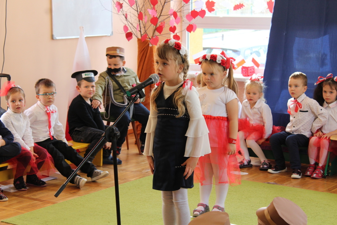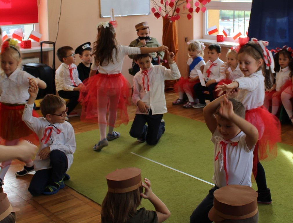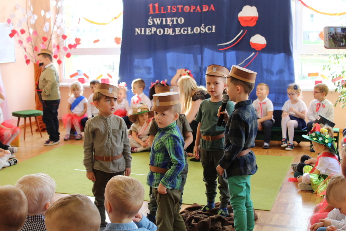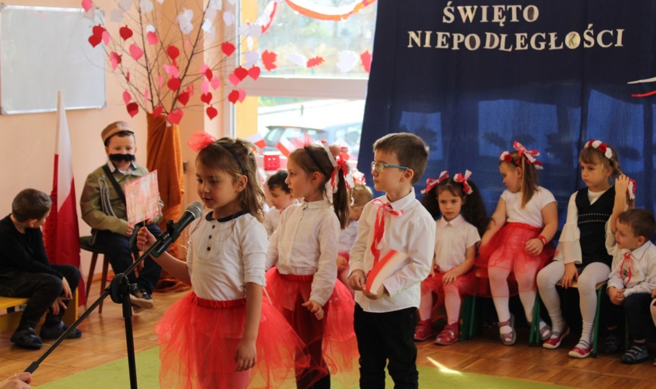 Pamiętając, że nie zawsze mogliśmy cieszyć się wolnością grupy II i IV pod kierunkiem wychowawczyń, Pań Magdaleny Jegerczyk i Anny Skop zaprezentowały program artystyczny podczas którego, zaprezentowana została krótka inscenizacja dotycząca tak ważnego wydarzenia jakim było odzyskanie przez Polskę Niepodległości. Dzieci recytowały również wiersze patriotyczne jak i te tłumaczące sens współczesnej polskości oraz nawiązujące do dostrzegania piękna ojczyzny.