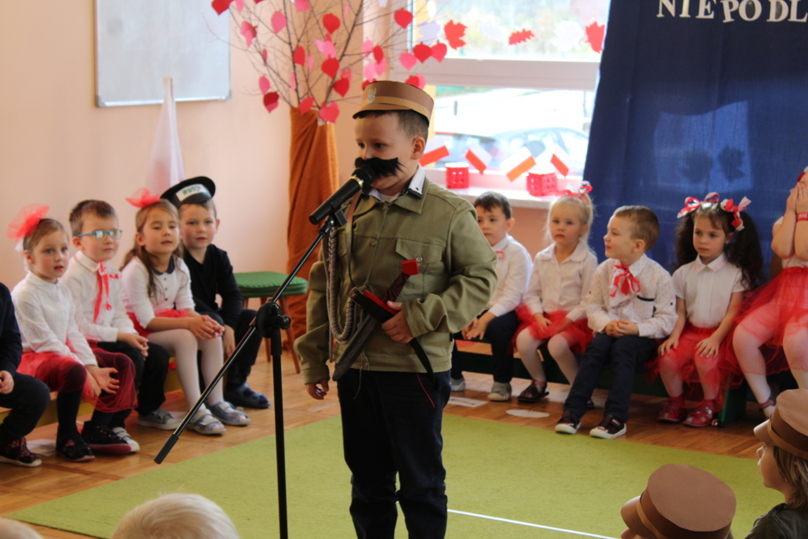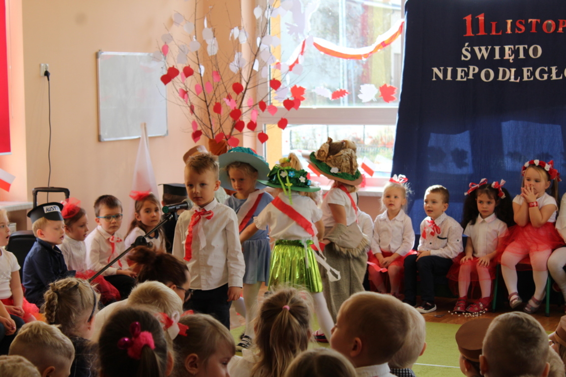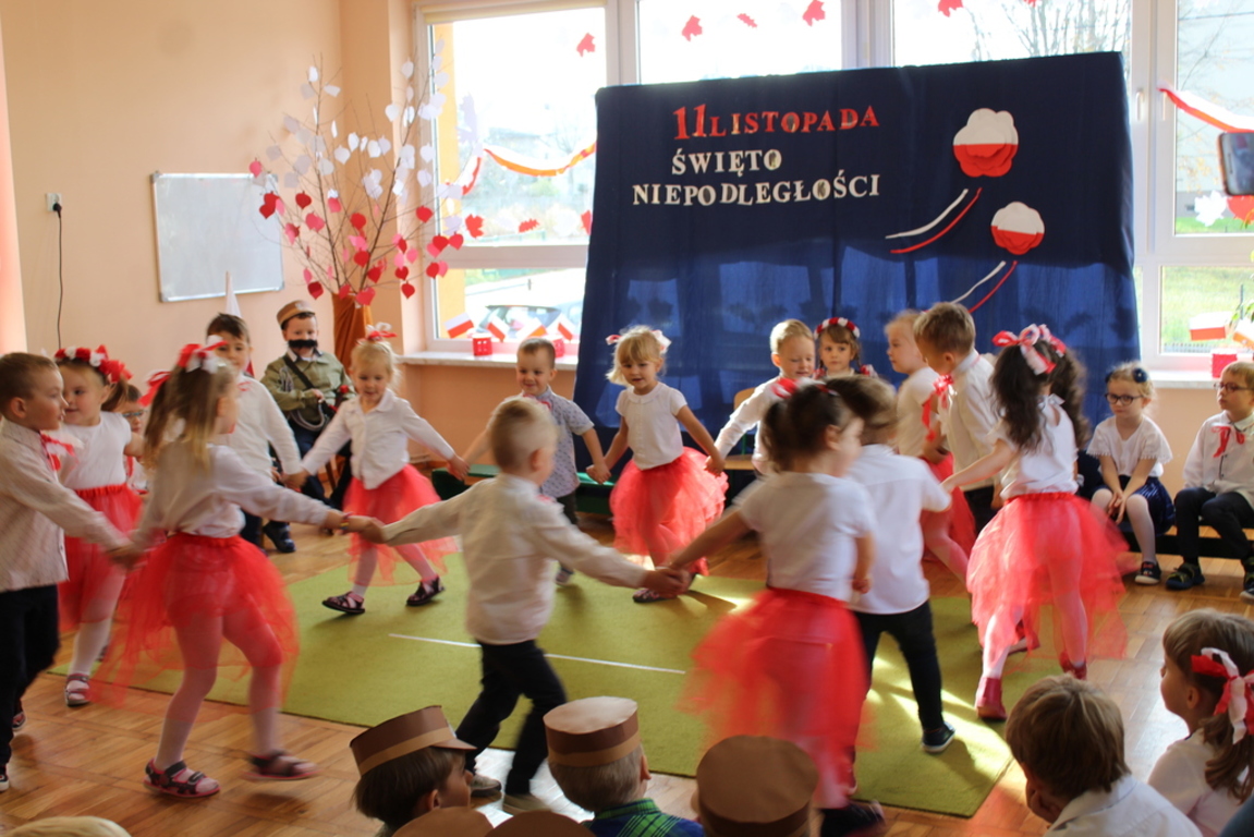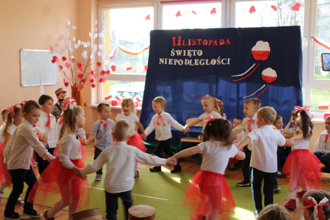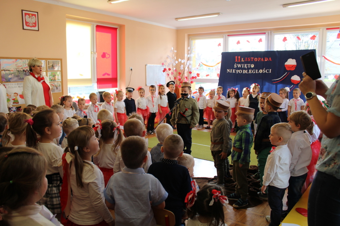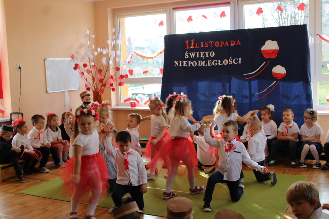 Pamiętając, że nie zawsze mogliśmy cieszyć się wolnością grupy II i IV pod kierunkiem wychowawczyń, Pań Magdaleny Jegerczyk i Anny Skop zaprezentowały program artystyczny podczas którego, zaprezentowana została krótka inscenizacja dotycząca tak ważnego wydarzenia jakim było odzyskanie przez Polskę Niepodległości. Dzieci recytowały również wiersze patriotyczne jak i te tłumaczące sens współczesnej polskości oraz nawiązujące do dostrzegania piękna ojczyzny.