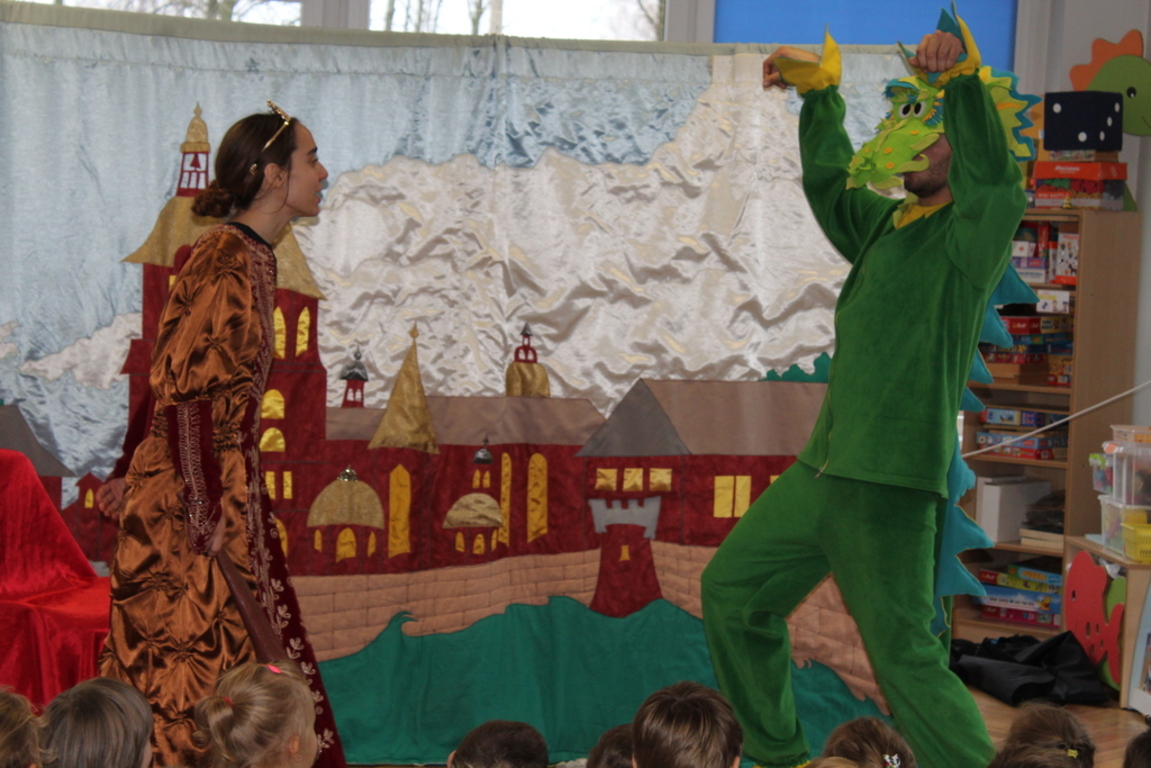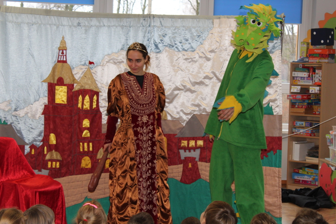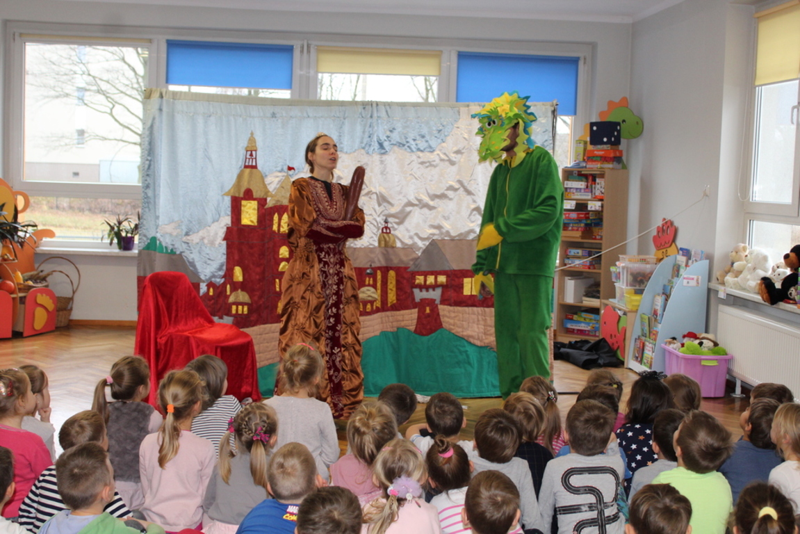 Pierwszego grudnia dzieci miały okazję gościć aktorów Teatru „Skrzat” z Krakowa. Aktorzy przy pomocy rekwizytów oraz barwnych strojów przedstawili dzieciom przygody niegrzecznej księżniczki, jej ojca – króla oraz wspaniałego zielonego przyjaciela – smoka. Dzieci z zaciekawieniem oglądały inscenizację i z poruszeniem reagowały na interesujące i humorystyczne sceny. Dziękujemy za ciekawą lekcję dobrego wychowania.