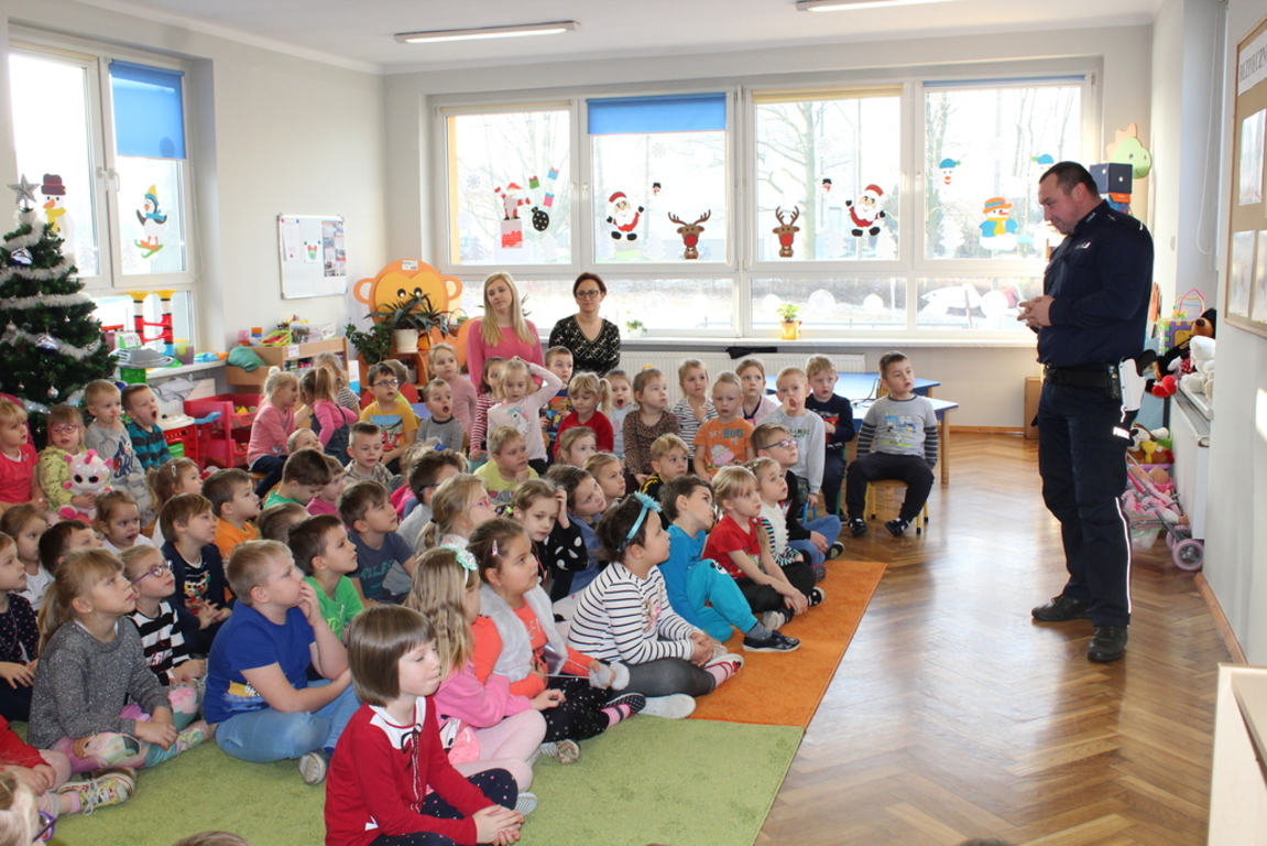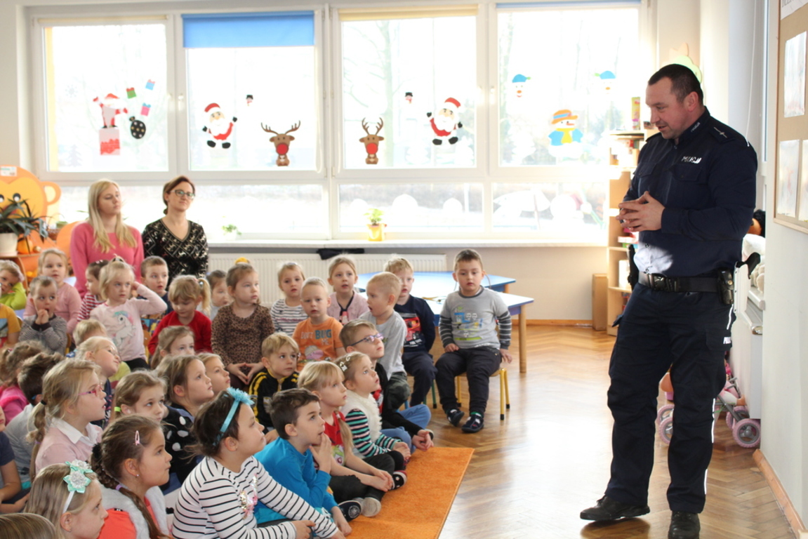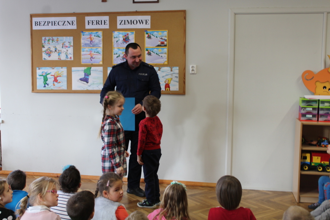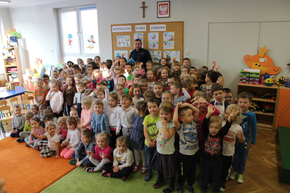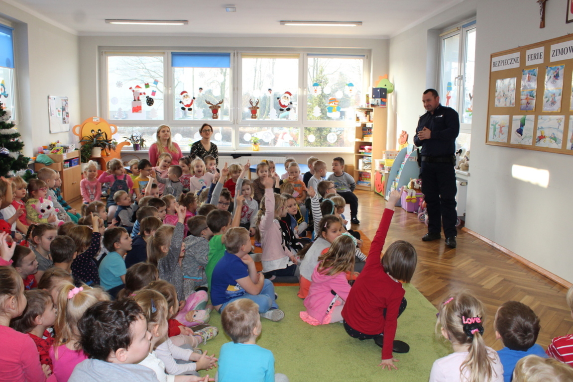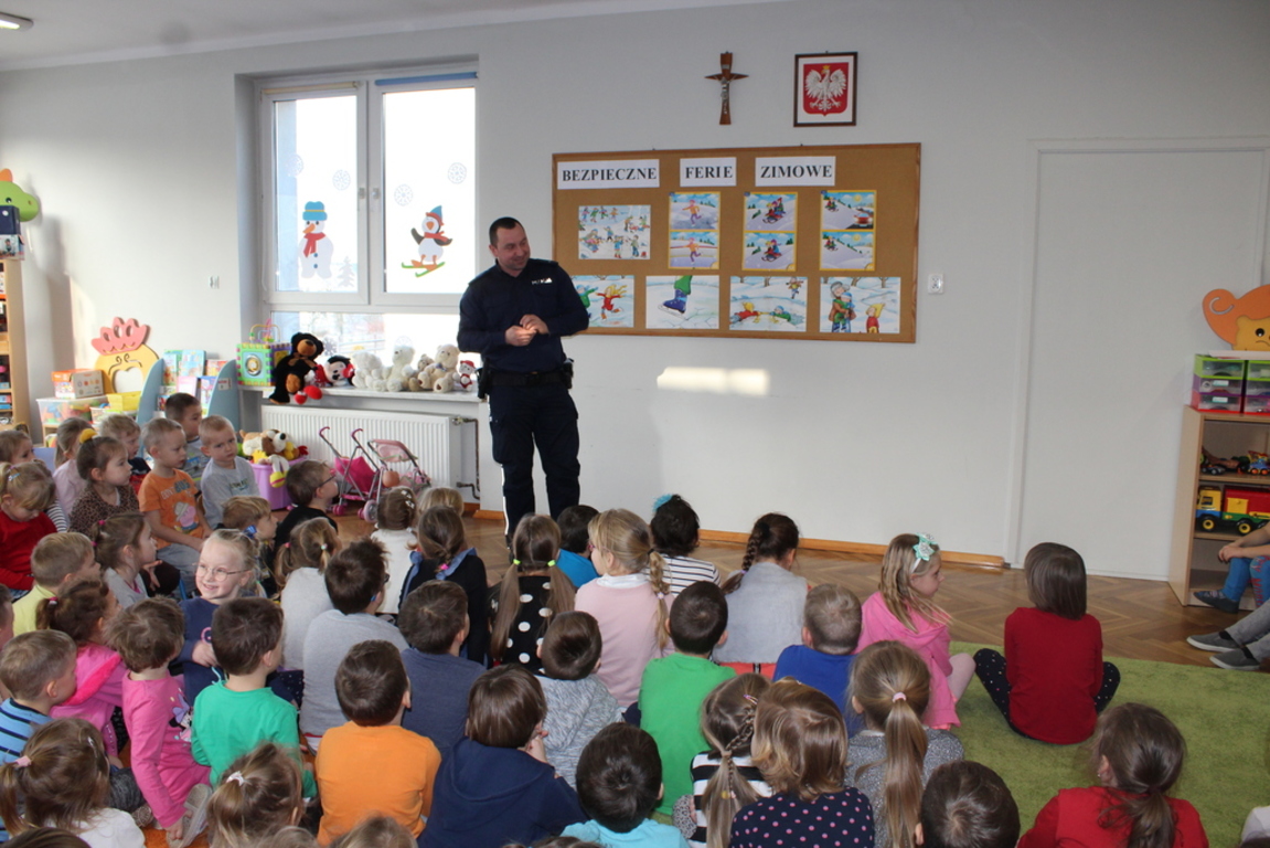 Ferie to szczególny czas, są to nie tylko dni zasłużonego odpoczynku dla dzieci ale również czas zabawy. W tym roku o bezpiecznej zabawie w czasie ferii opowiedział nam mł. asp. Adam Blacha. Dzieci z uwagą wysłuchały ciekawej pogadanki jak i same odpowiadały i zadawały pytania. Myślę, że po tak udanym spotkaniu w komplecie spotkamy sie po feriach.