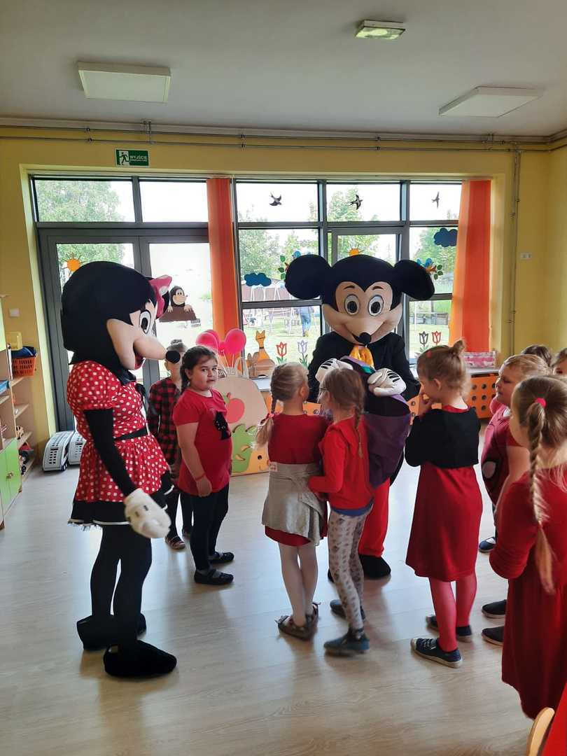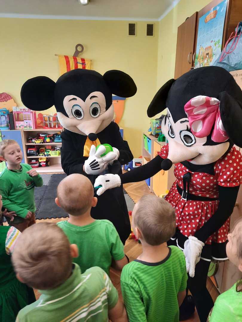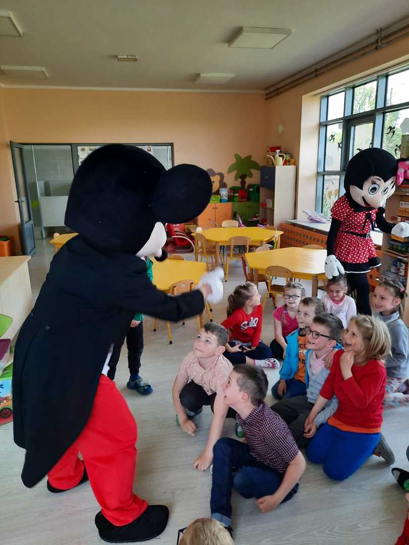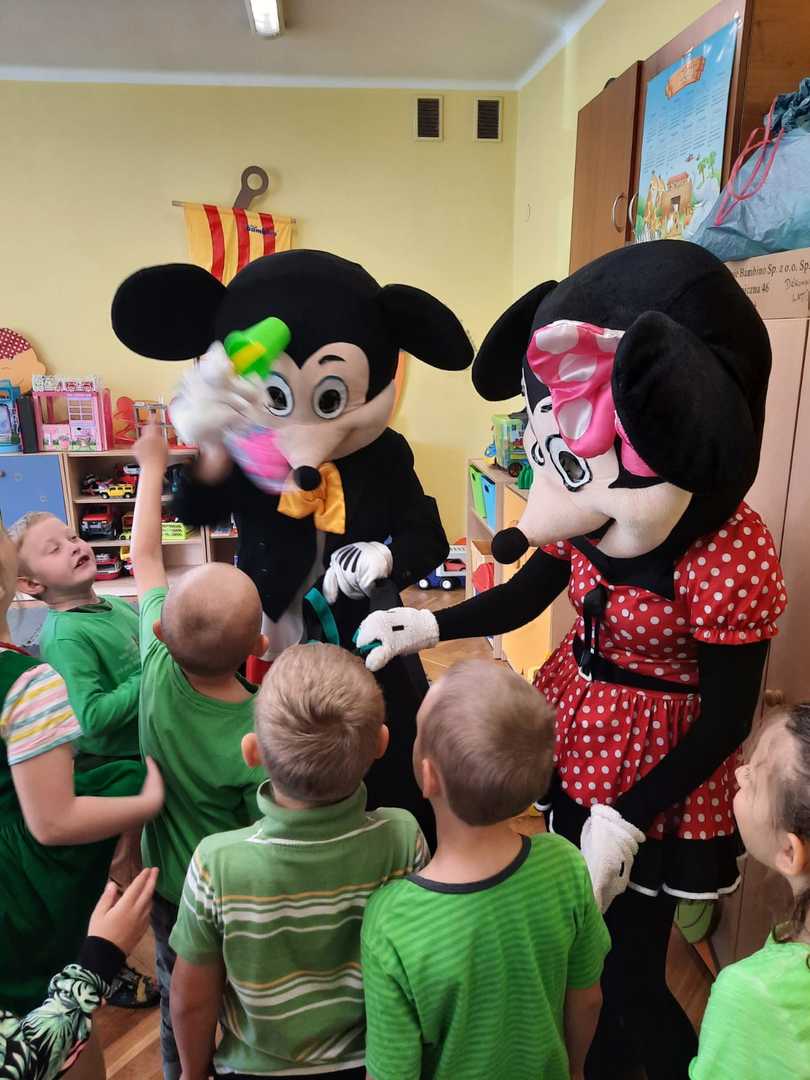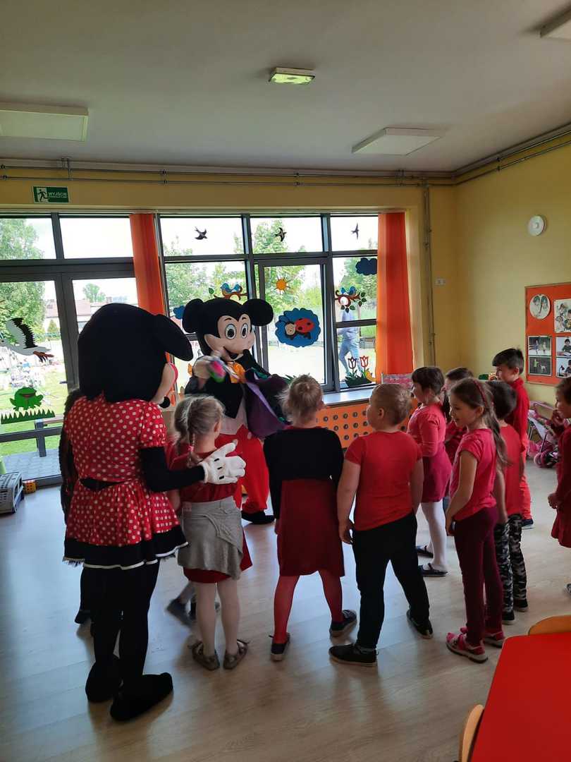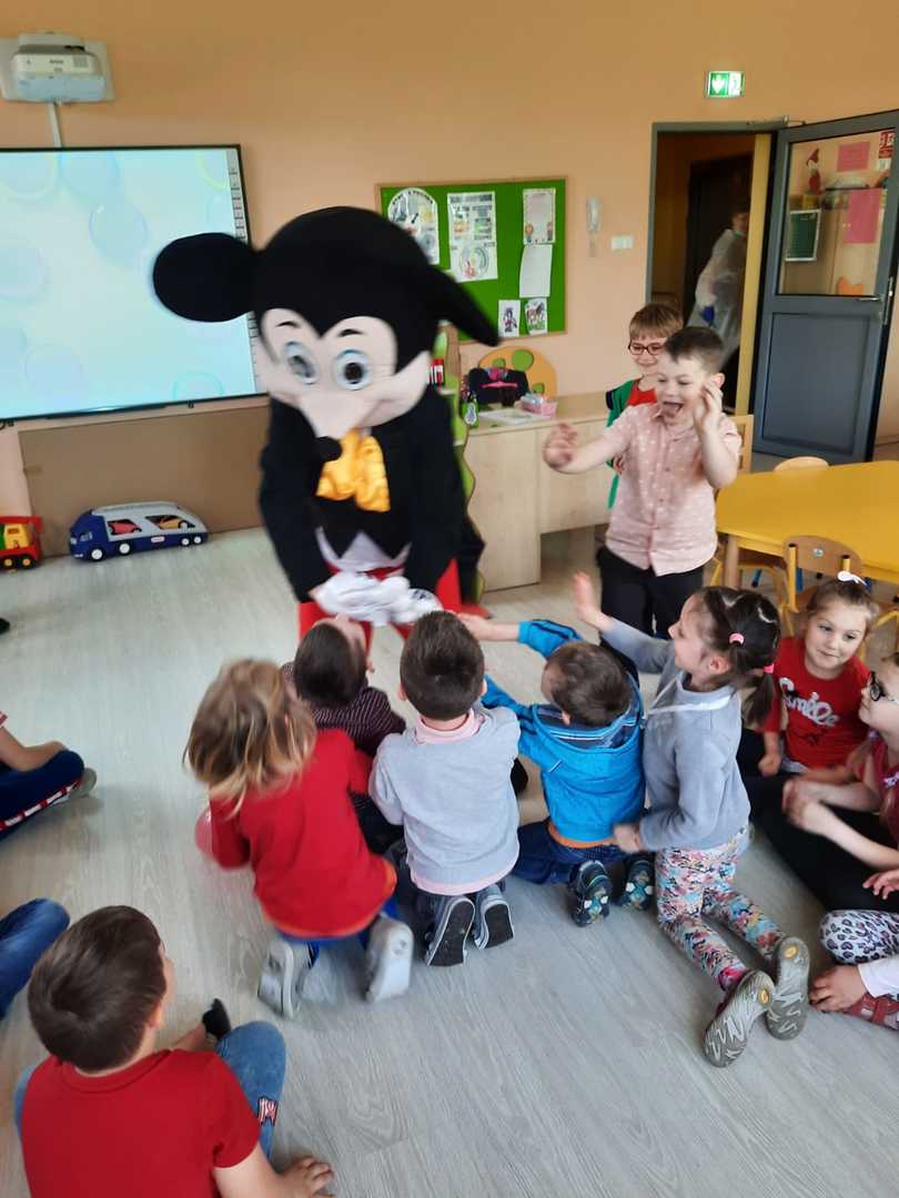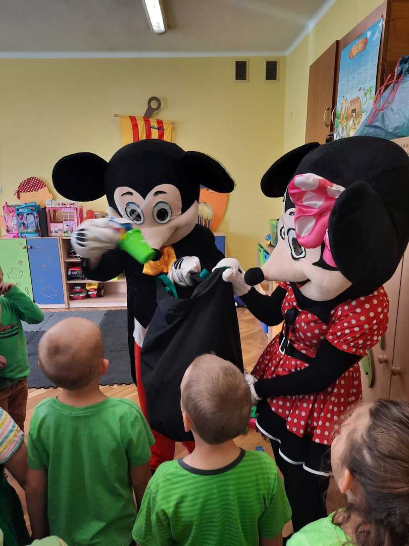 Gościliśmy myszkę Miki i Mini, które umiliły nam ten dzisiejszy dzień, na koniec każde dziecko otrzymało prezent w postaci zestawu do piaskownicy od burmistrza Woźnik Michała Aloszko, któremu dziękujemy