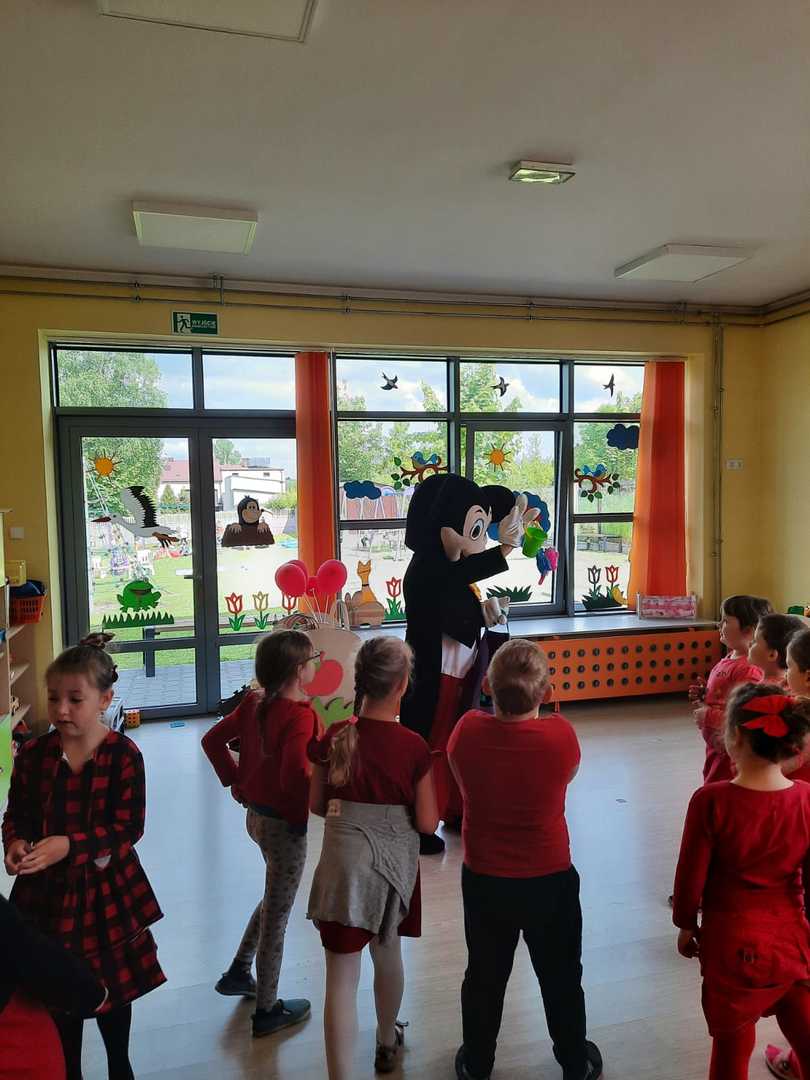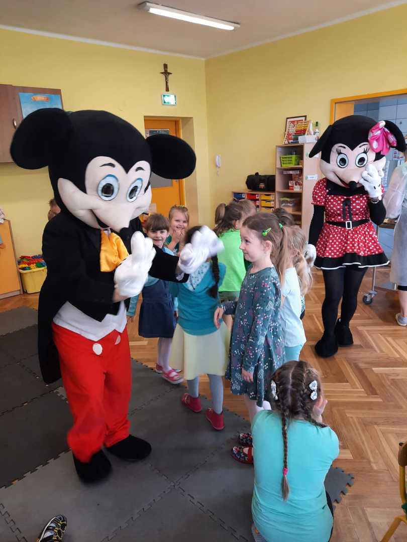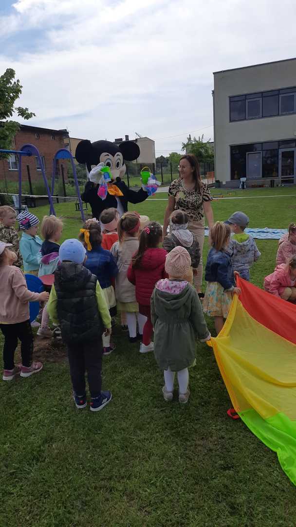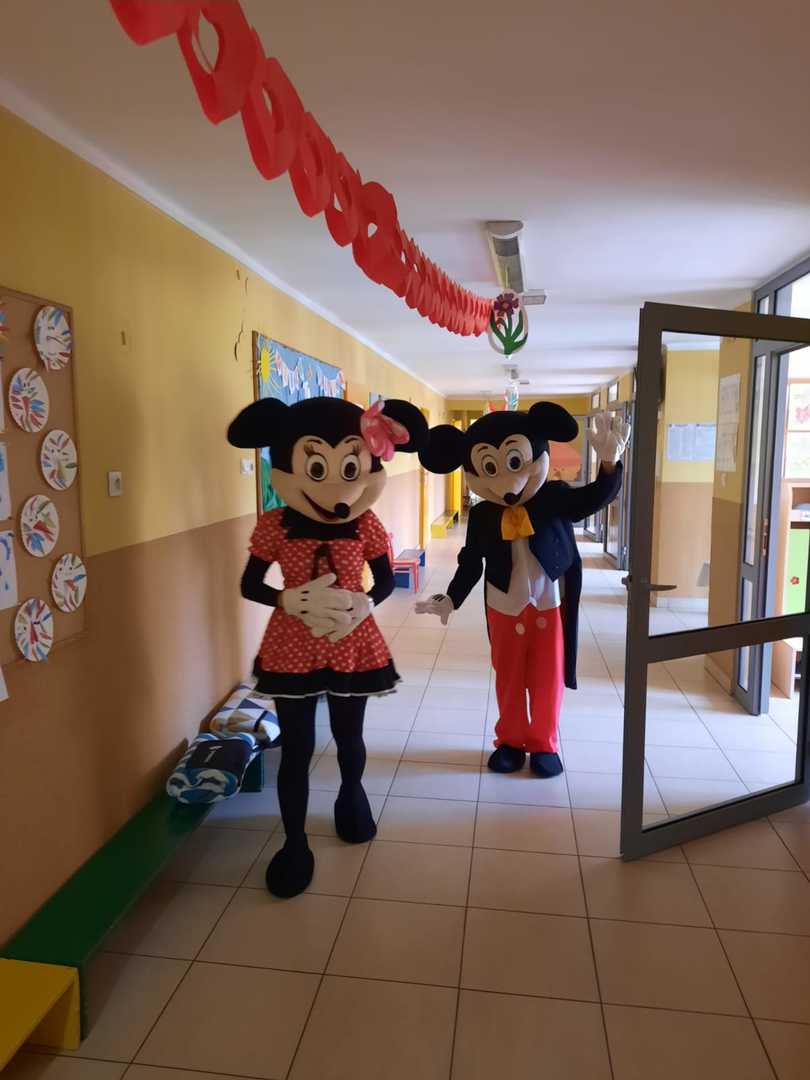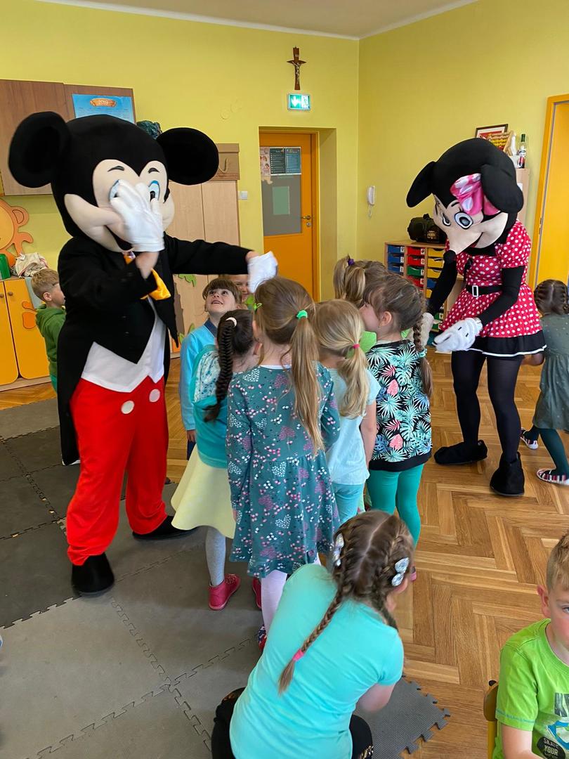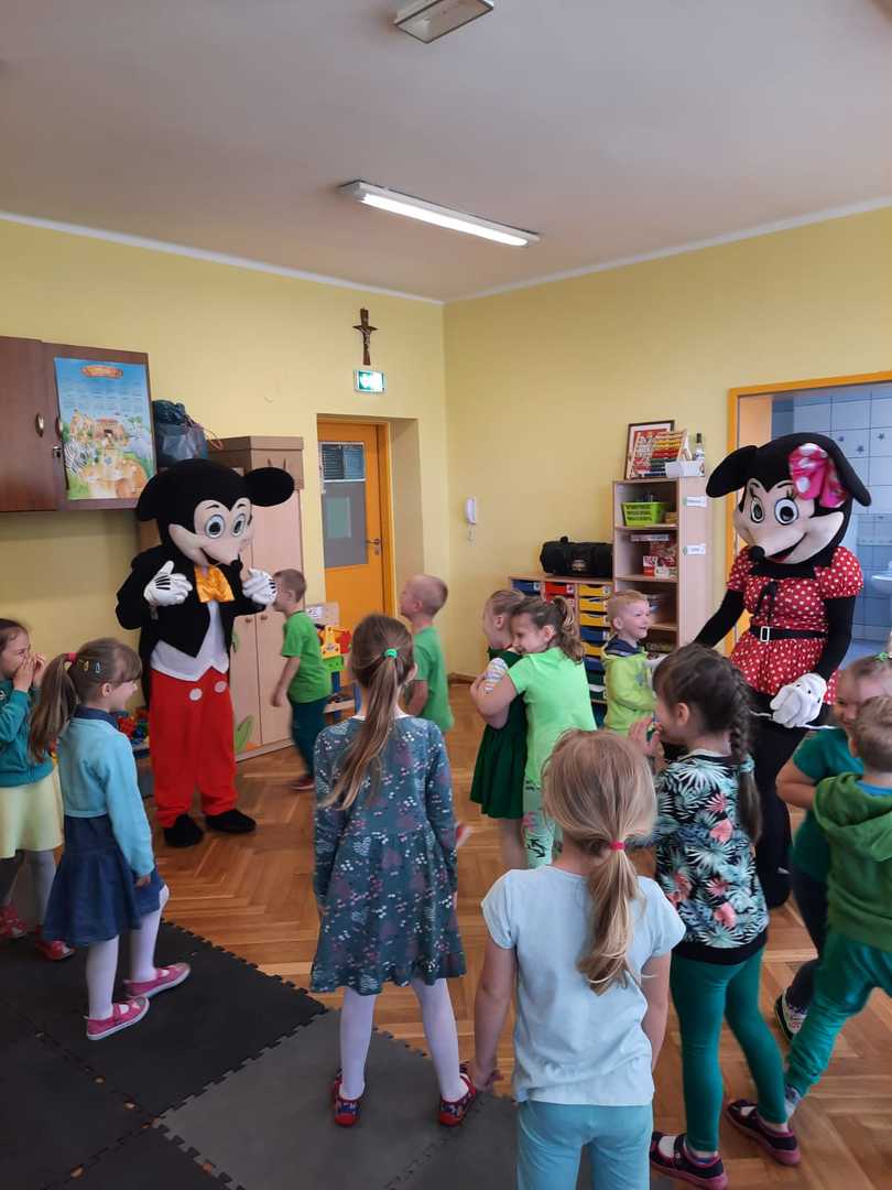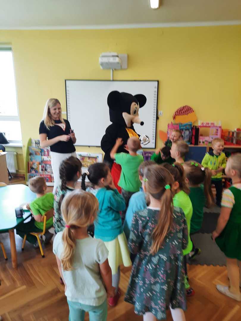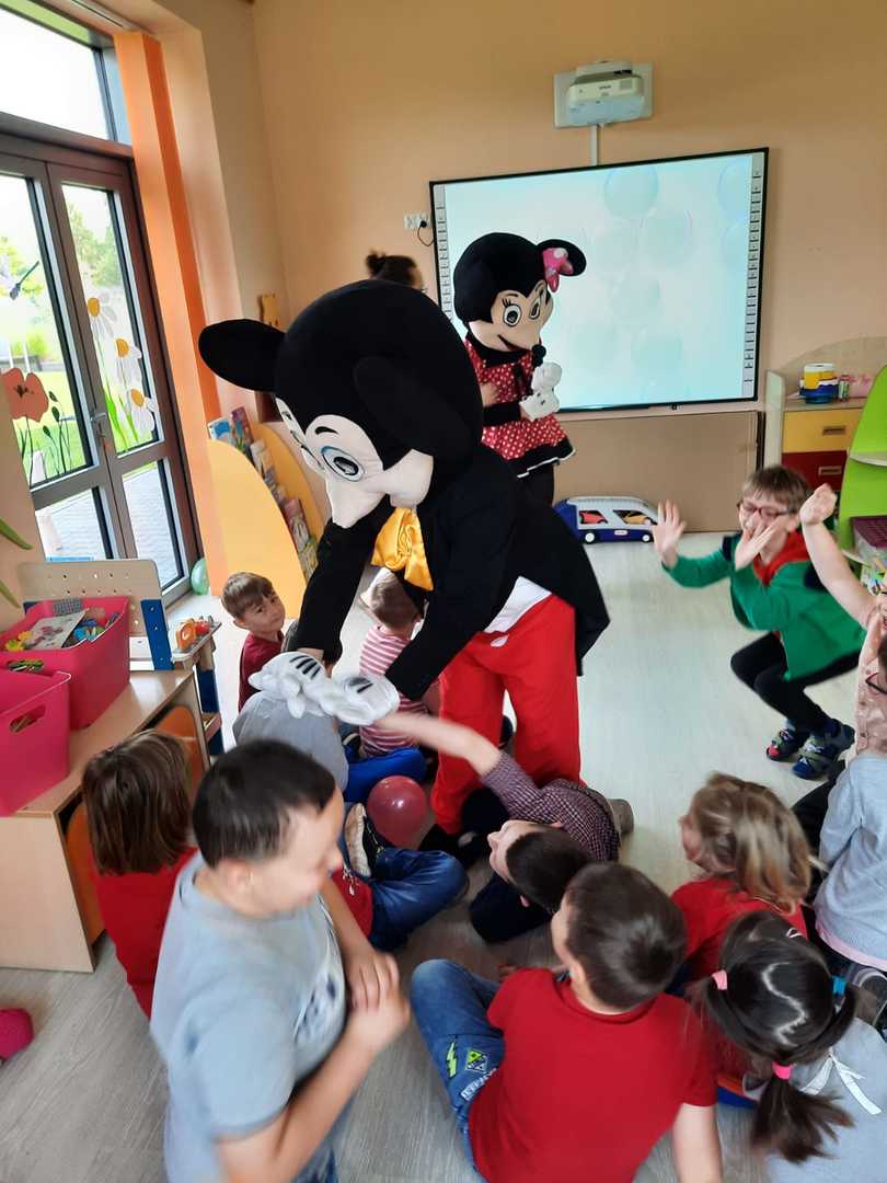 Gościliśmy myszkę Miki i Mini, które umiliły nam ten dzisiejszy dzień, na koniec każde dziecko otrzymało prezent w postaci zestawu do piaskownicy od burmistrza Woźnik Michała Aloszko, któremu dziękujemy