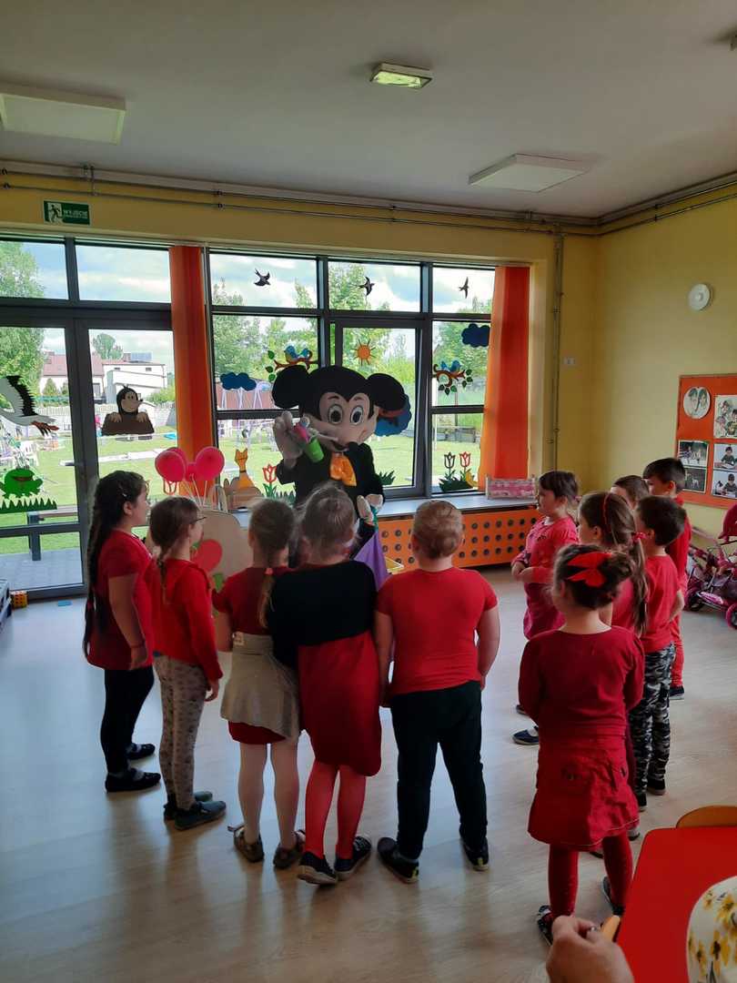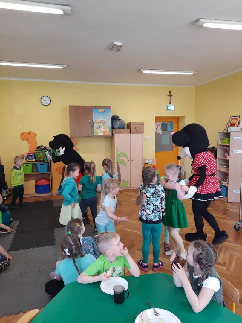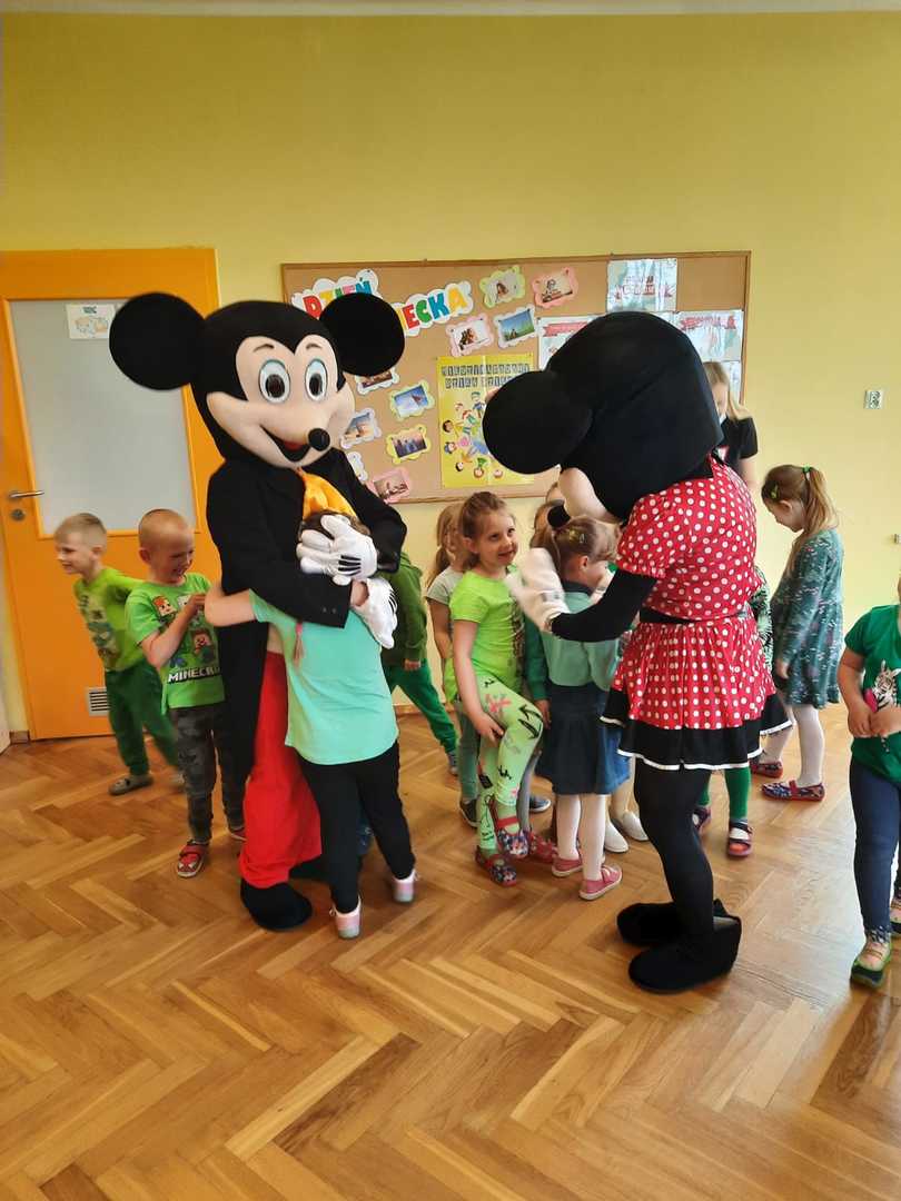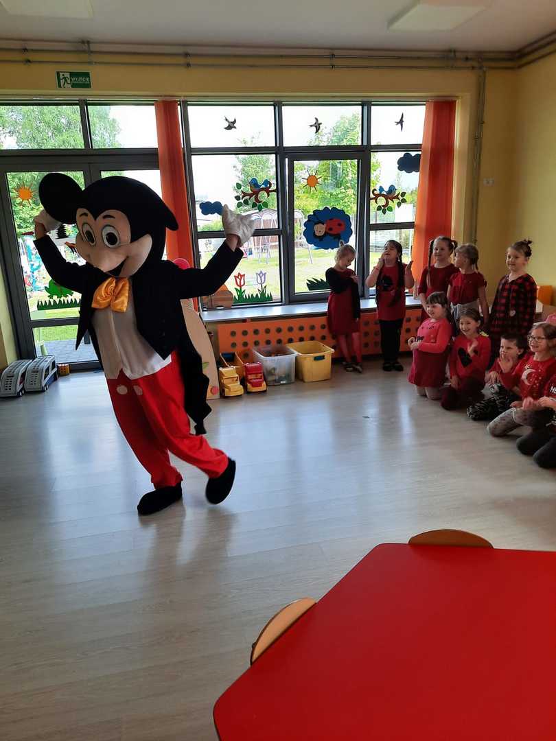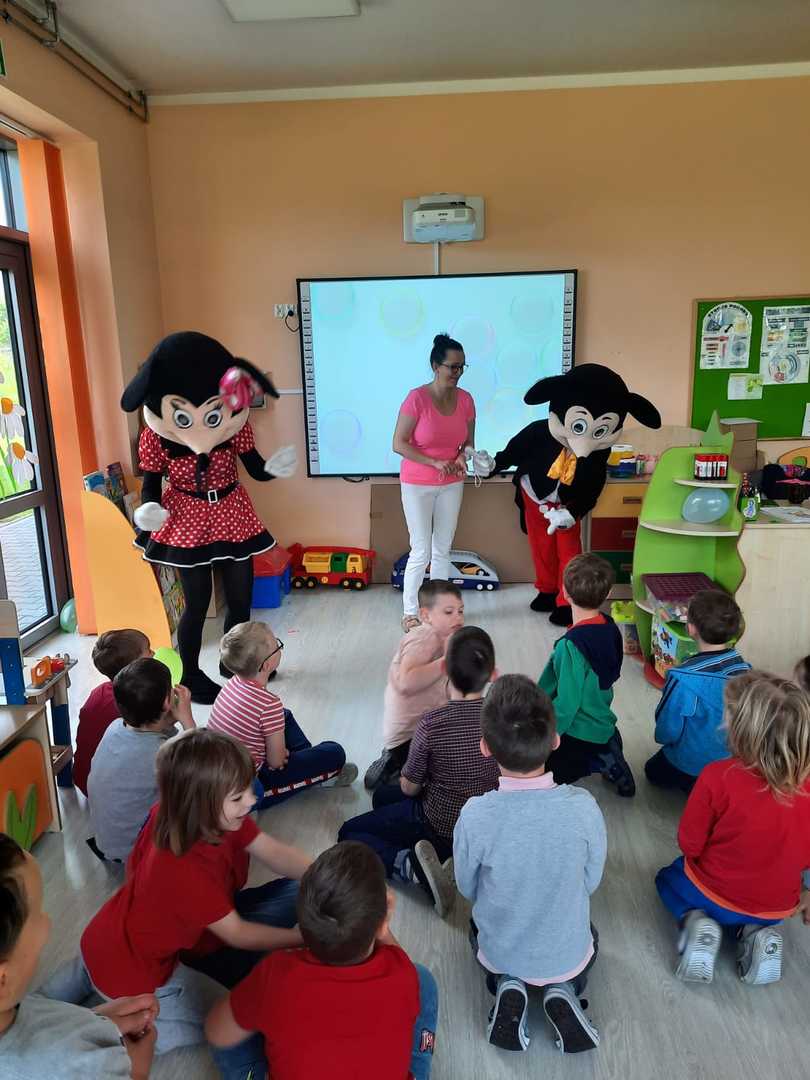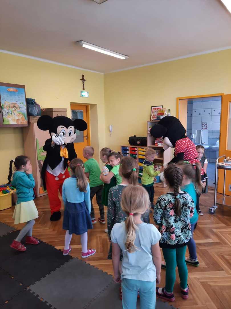 Gościliśmy myszkę Miki i Mini, które umiliły nam ten dzisiejszy dzień, na koniec każde dziecko otrzymało prezent w postaci zestawu do piaskownicy od burmistrza Woźnik Michała Aloszko, któremu dziękujemy