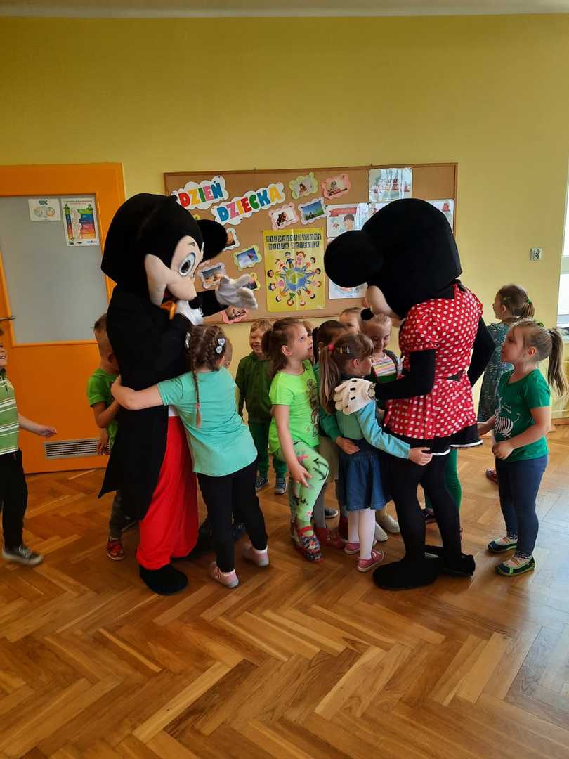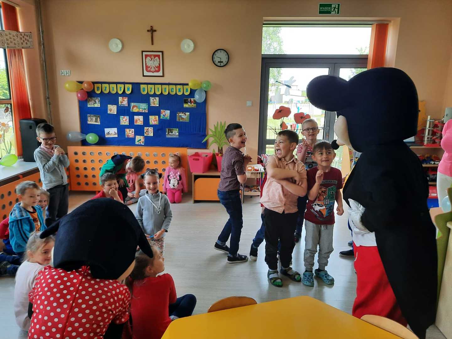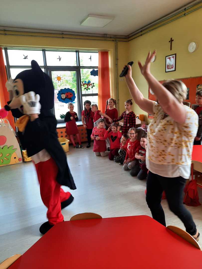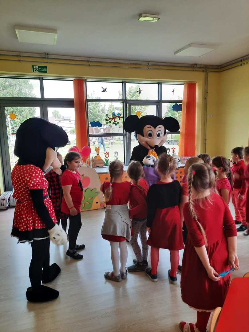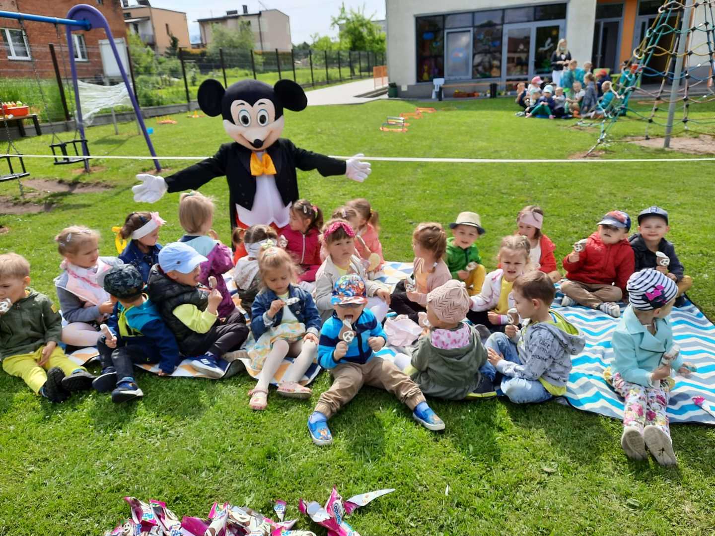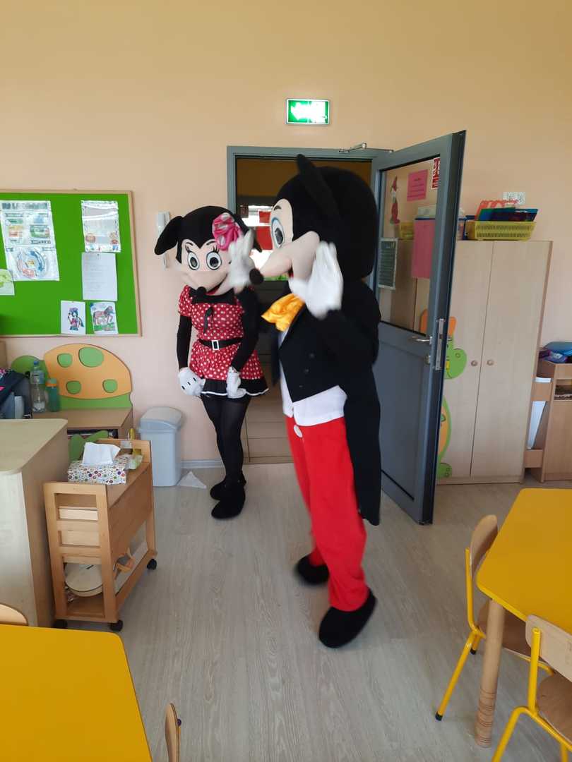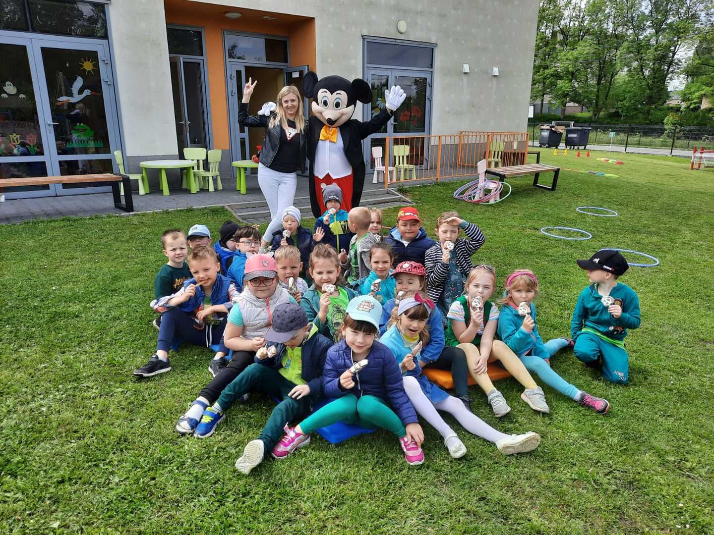 Gościliśmy myszkę Miki i Mini, które umiliły nam ten dzisiejszy dzień, na koniec każde dziecko otrzymało prezent w postaci zestawu do piaskownicy od burmistrza Woźnik Michała Aloszko, któremu dziękujemy