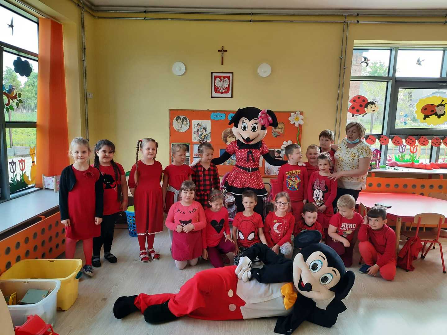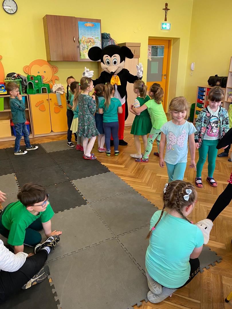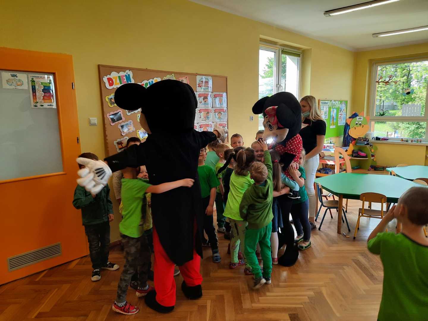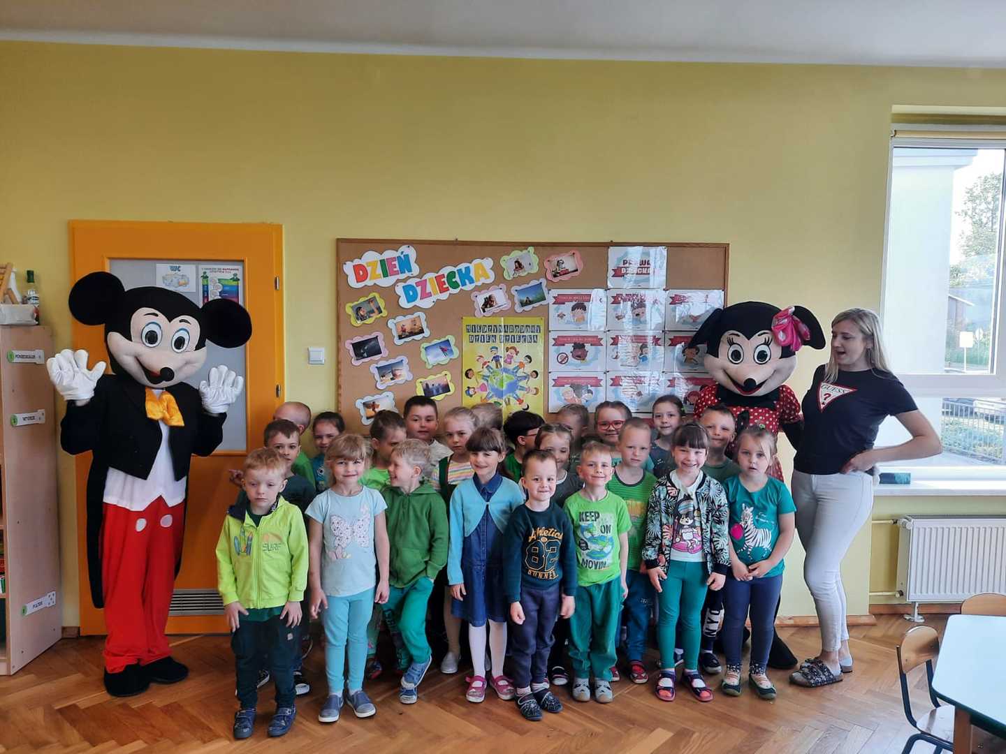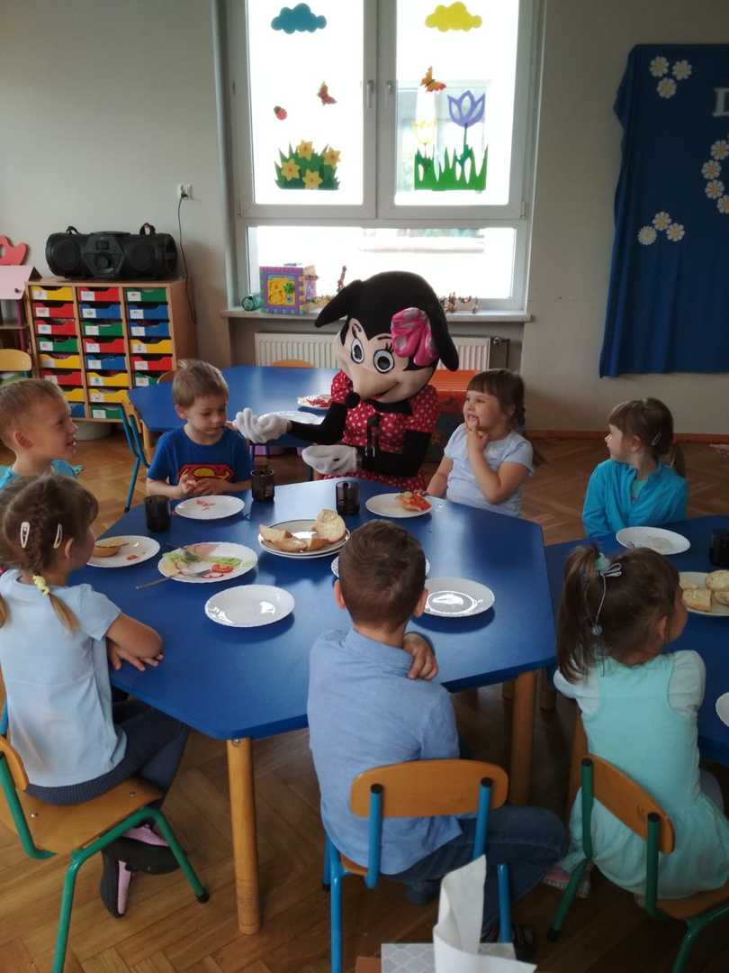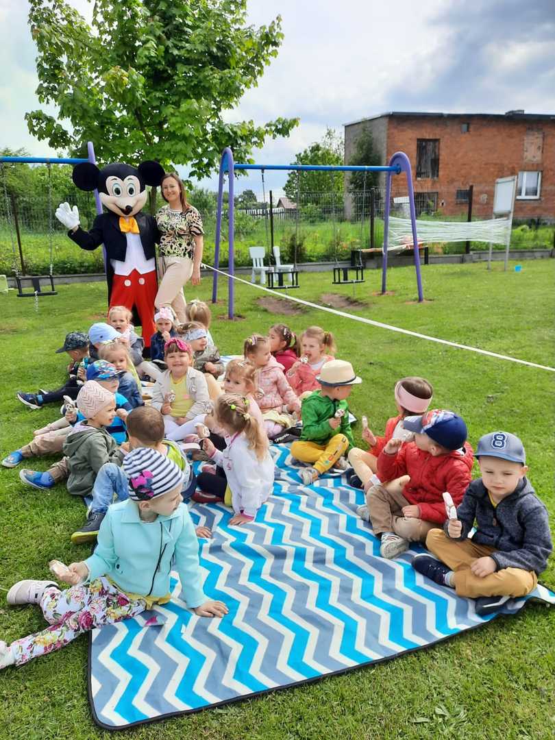 Gościliśmy myszkę Miki i Mini, które umiliły nam ten dzisiejszy dzień, na koniec każde dziecko otrzymało prezent w postaci zestawu do piaskownicy od burmistrza Woźnik Michała Aloszko, któremu dziękujemy
