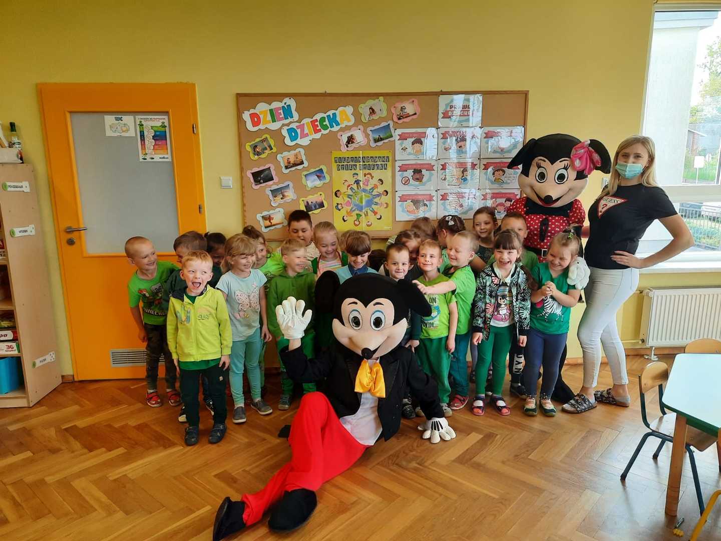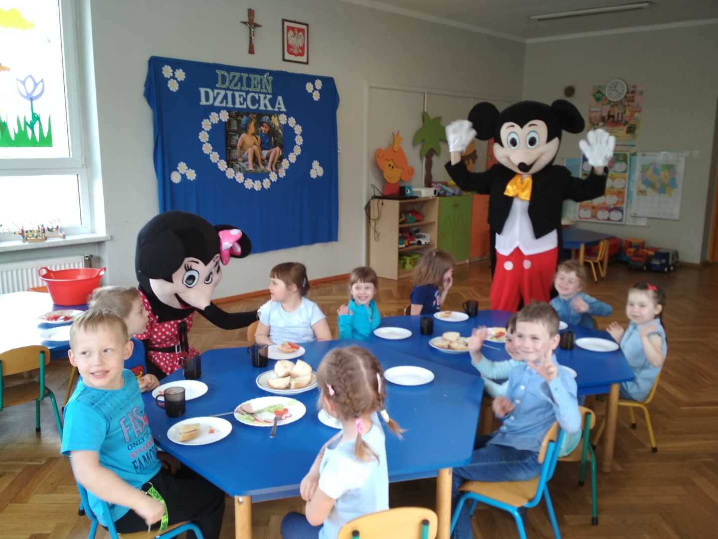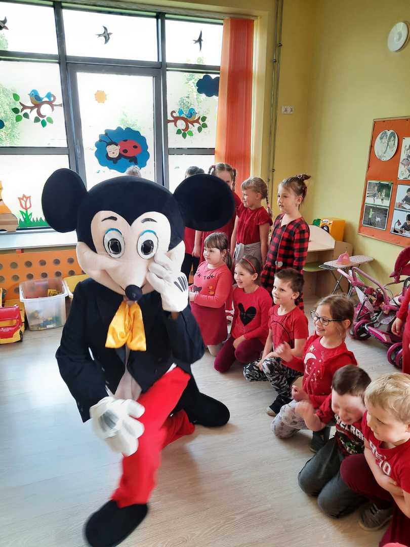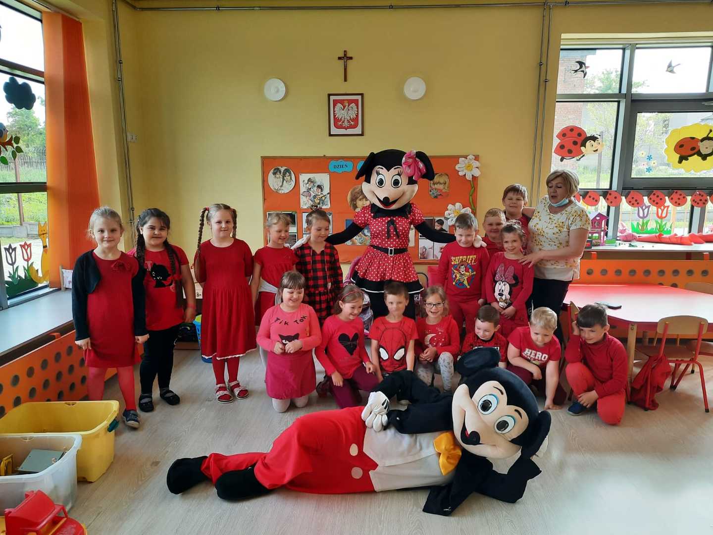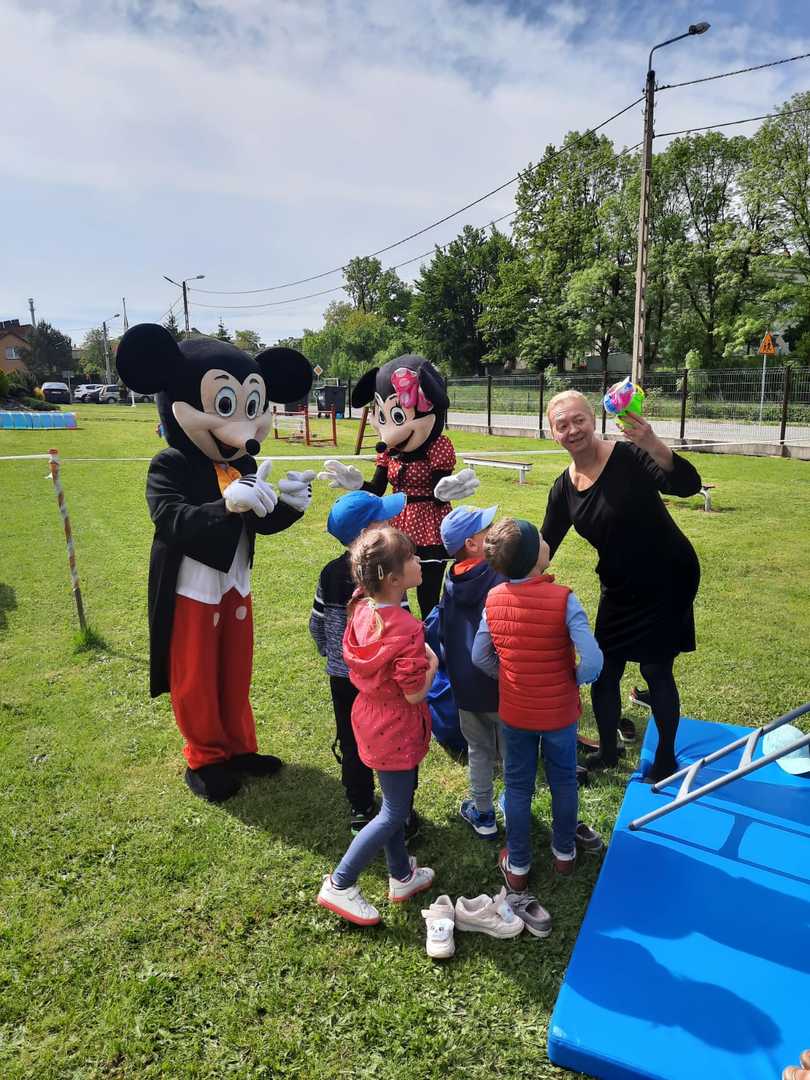 Gościliśmy myszkę Miki i Mini, które umiliły nam ten dzisiejszy dzień, na koniec każde dziecko otrzymało prezent w postaci zestawu do piaskownicy od burmistrza Woźnik Michała Aloszko, któremu dziękujemy