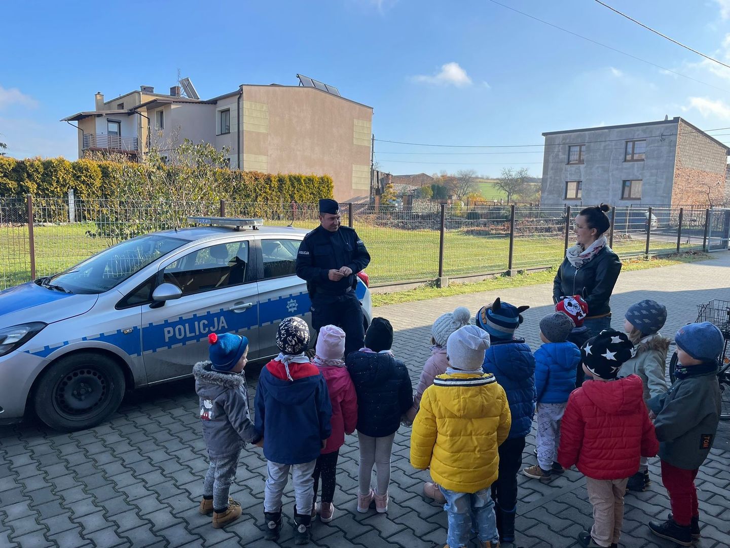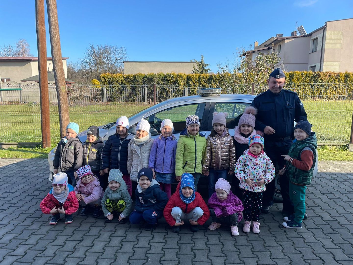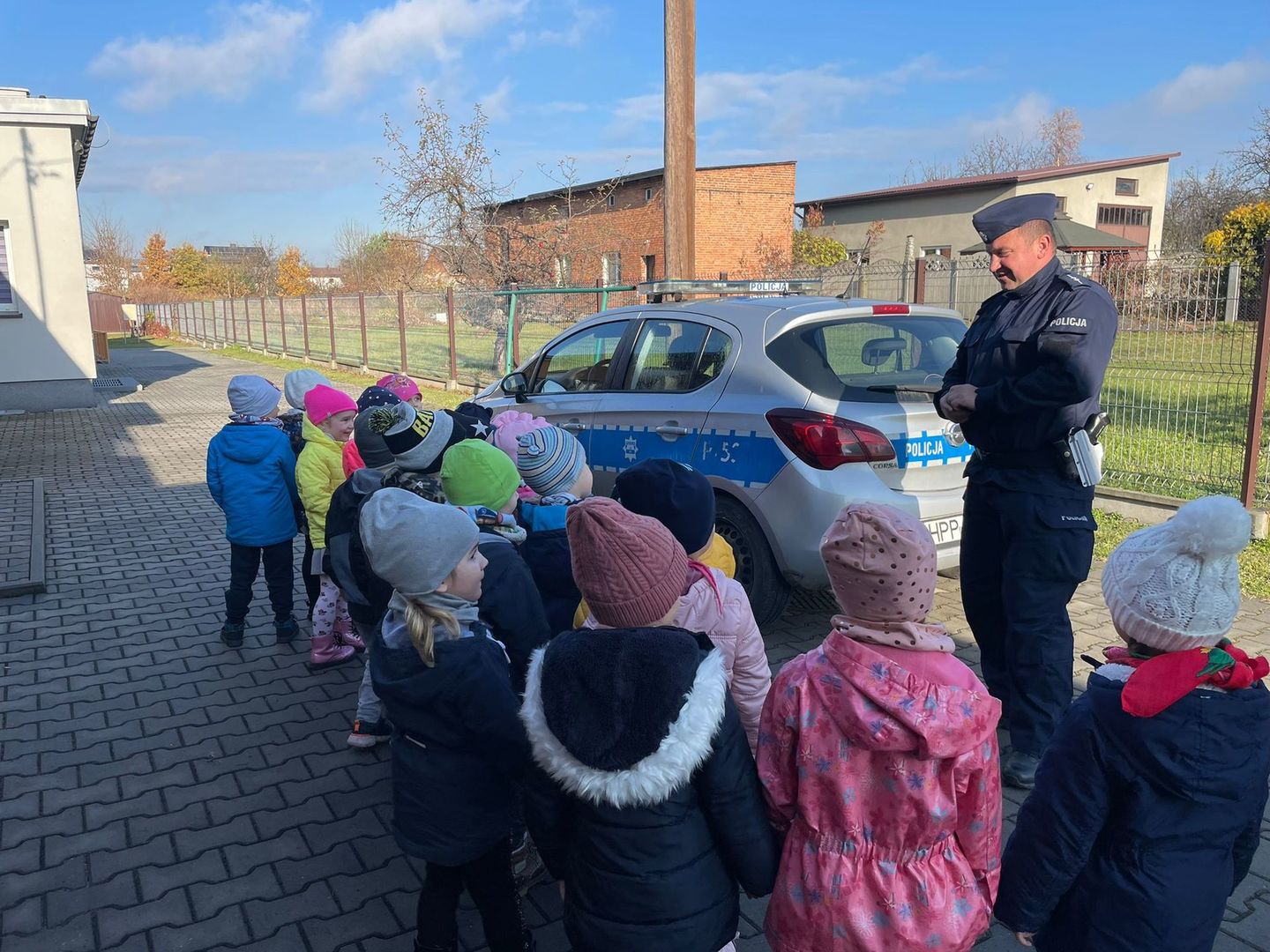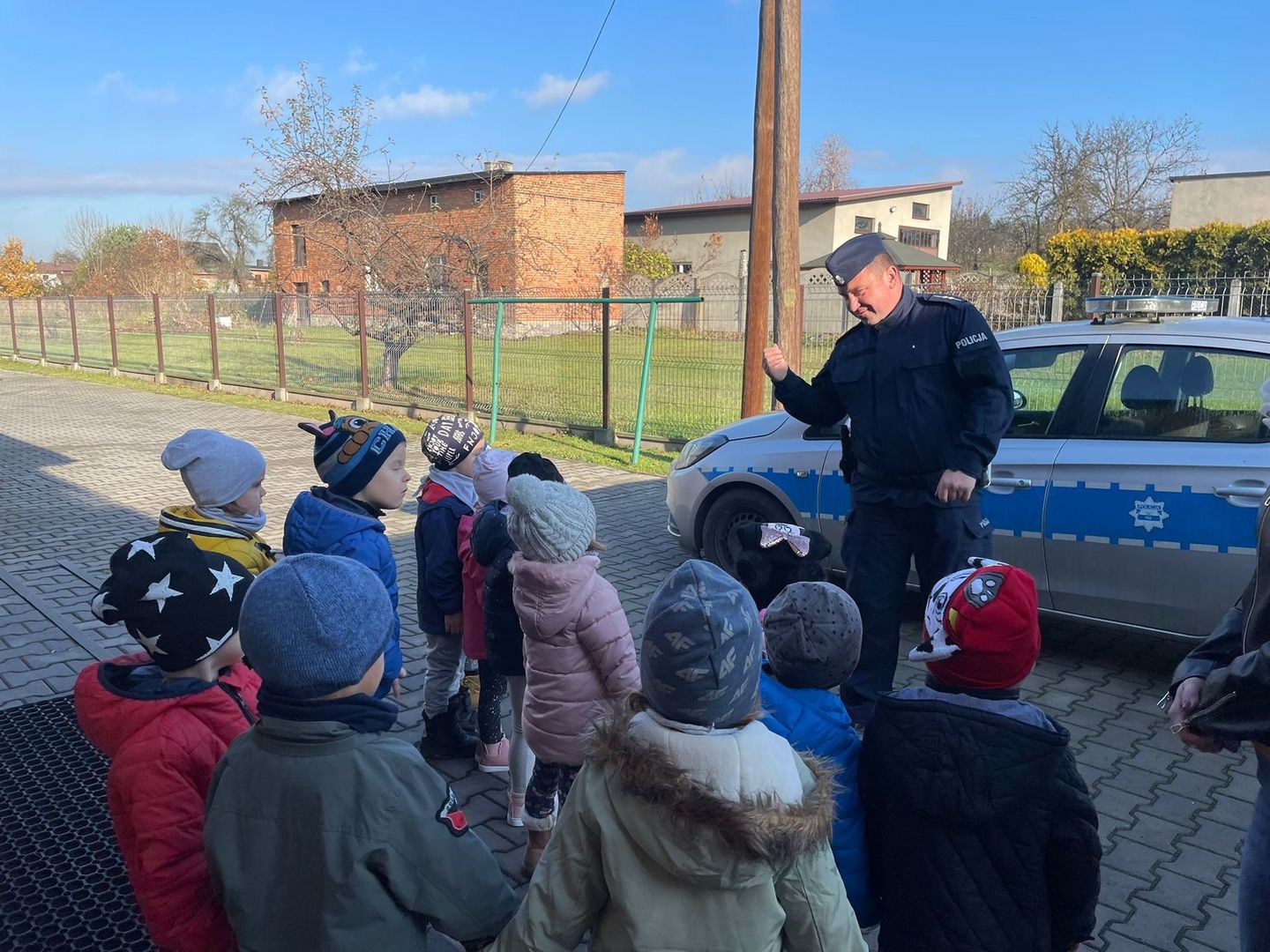 02 listopada 2021r na terenie przedszkola odbyło się spotkanie z policjantem asp. Adamem Blachą z Komisariatu Policji w Woźnikach. Tematem spotkania było utrwalenie zasad ruchu drogowego oraz przypomnienie zagadnień dotyczących bezpieczeństwa dzieci w przedszkolu i w domu. Pan policjant, w formie praktycznej, przypomniał podstawowe zasady przechodzenia przez jezdnię. Dzieci z dużym zainteresowaniem słuchały rad i wskazówek zaproszonego gościa. Na zakończenie chętne dzieci mogły usiąść w radiowozie. Dziękujemy i zapraszamy ponownie.