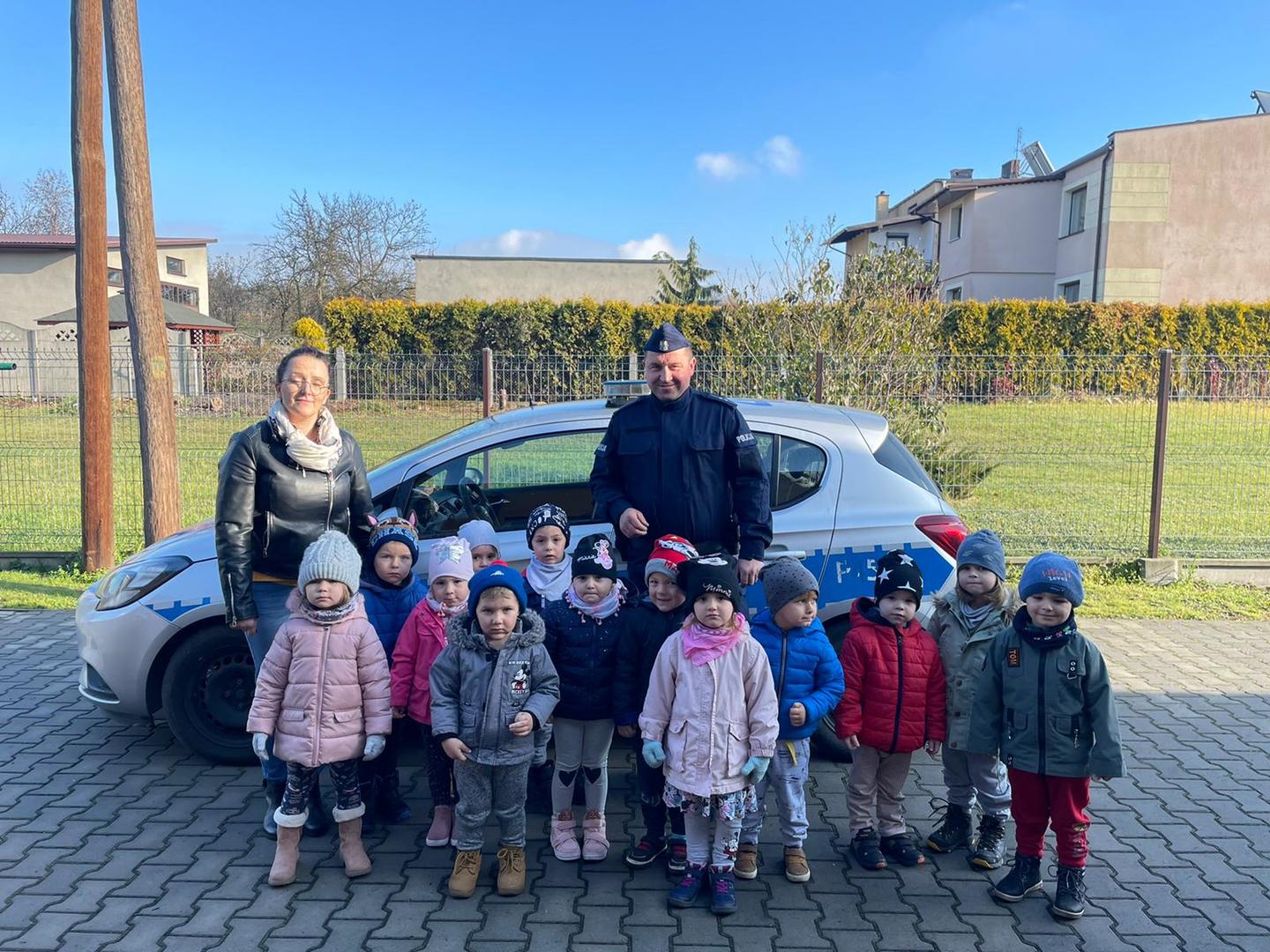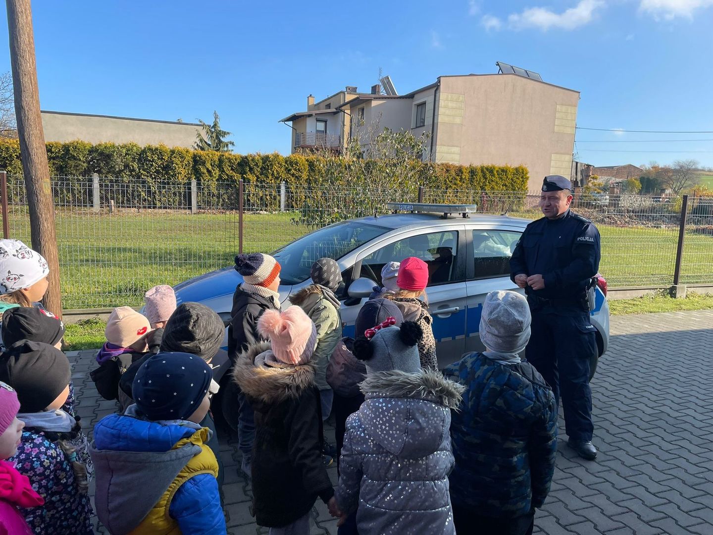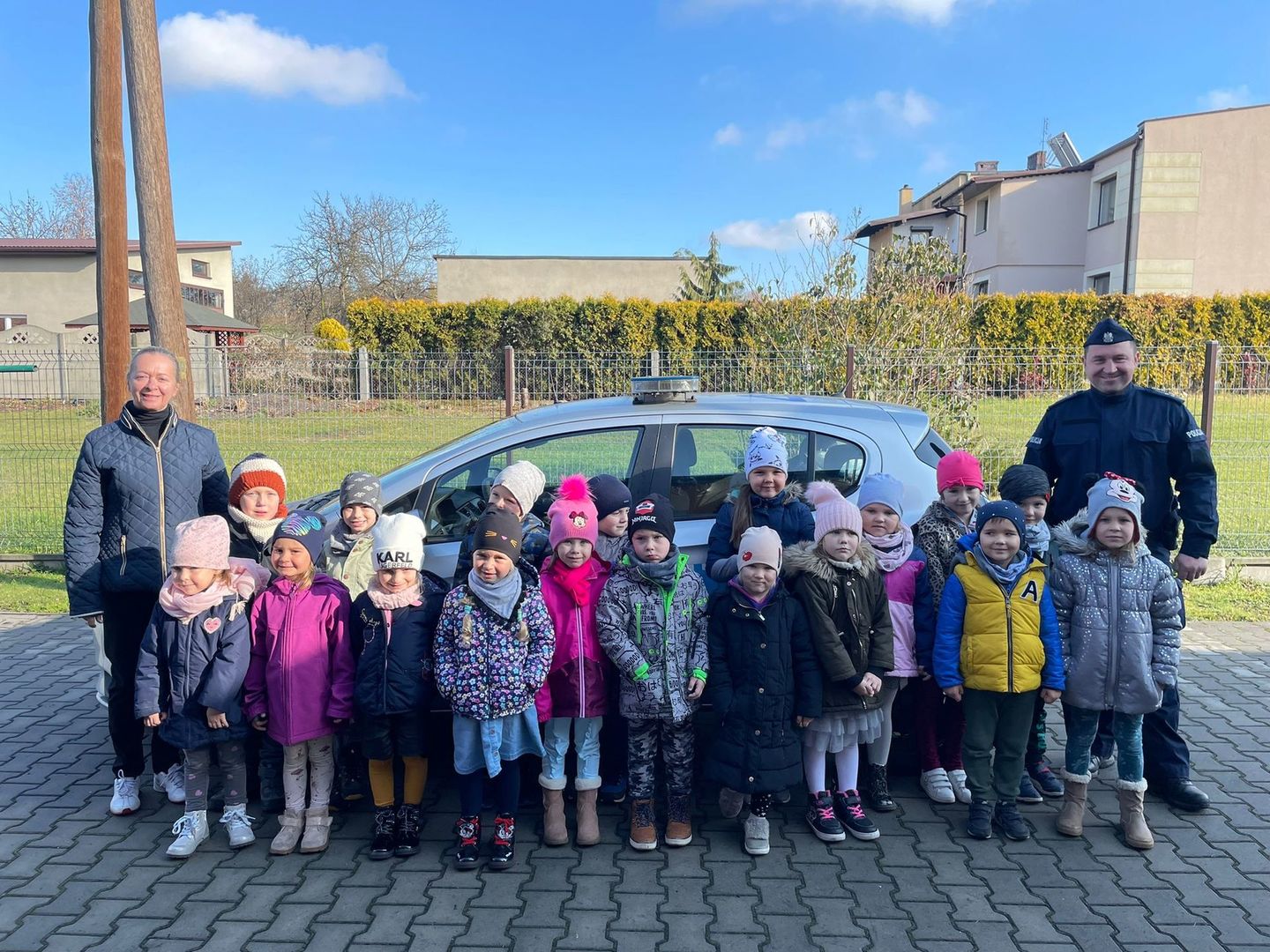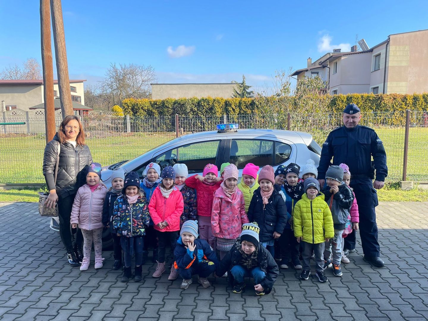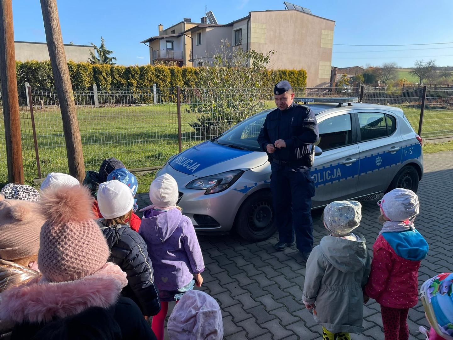 02 listopada 2021r na terenie przedszkola odbyło się spotkanie z policjantem asp. Adamem Blachą z Komisariatu Policji w Woźnikach. Tematem spotkania było utrwalenie zasad ruchu drogowego oraz przypomnienie zagadnień dotyczących bezpieczeństwa dzieci w przedszkolu i w domu. Pan policjant, w formie praktycznej, przypomniał podstawowe zasady przechodzenia przez jezdnię. Dzieci z dużym zainteresowaniem słuchały rad i wskazówek zaproszonego gościa. Na zakończenie chętne dzieci mogły usiąść w radiowozie. Dziękujemy i zapraszamy ponownie.
