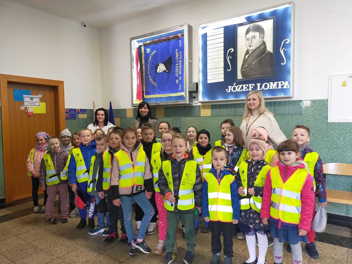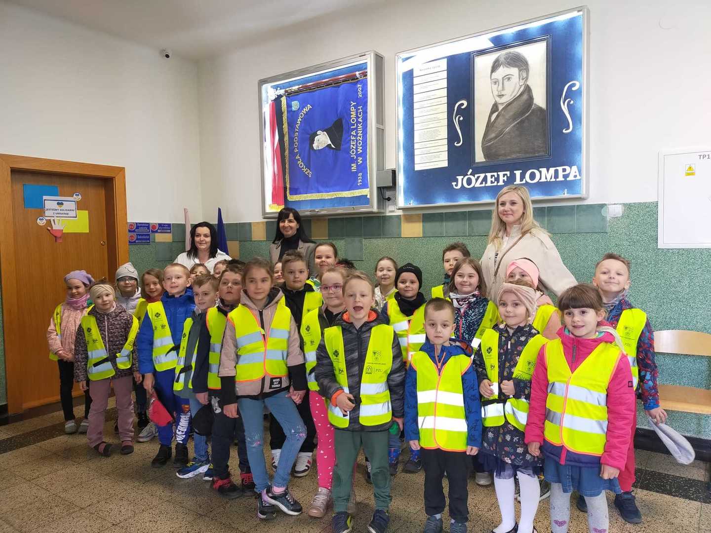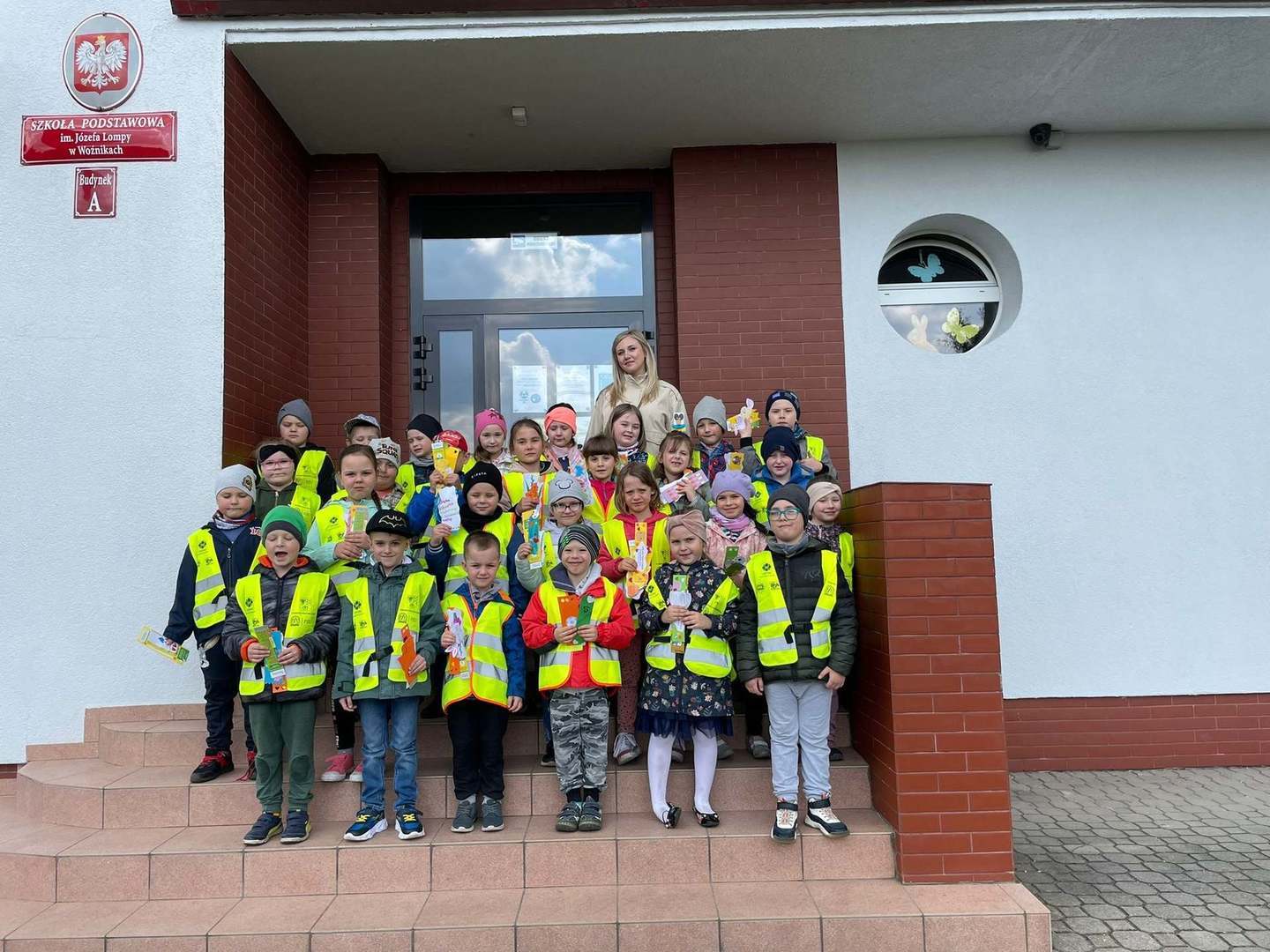 Dnia 28 kwietnia, przedszkolaki z najstarszych grup przedszkolnych odwiedziły Szkołę Podstawową im. Józefa Lompy w Woźnikach. Celem naszej wizyty było bliższe poznanie szkoły, do której dzieci będą uczęszczać w najbliższym czasie. U progu szkoły przywitała nas pani Wicedyrektor Renata Flakus, która była naszym przewodnikiem w tym dniu. Wycieczkę rozpoczęliśmy od obejrzenia najważniejszych pomieszczeń szkolnych, w pierwszej kolejności udaliśmy się do gabinetu pani Dyrektor Szkoły – Lilianny Lakomy-Brząkała, która pokazała nam swój gabinet oraz sekretariat, a także obdarowała nas słodkim poczęstunkiem. Następnie odwiedziliśmy kuchnię oraz stołówkę, gdzie już niedługo będziemy zajadać pyszne obiady. Zobaczyliśmy, jak wyglądają sale do których uczęszczają uczniowie klas I , II oraz III. Mieliśmy również możliwość odwiedzenia sali komputerowej. W każdej sali lekcyjnej uczniowie przywitali nas piosenką, zostaliśmy również obdarowani zakładkami do książek, które na pewno wkrótce bardzo nam się przydadzą. Zajrzeliśmy jeszcze do Biblioteki, gdzie pani Agnieszka Tyka opowiedziała nam wiele ciekawych rzeczy na temat tego miejsca. Na koniec pobytu w szkole poszliśmy na boisko oraz plac zabaw, na którym świetnie się bawiliśmy, po czym pełni wrażeń wróciliśmy do przedszkola.