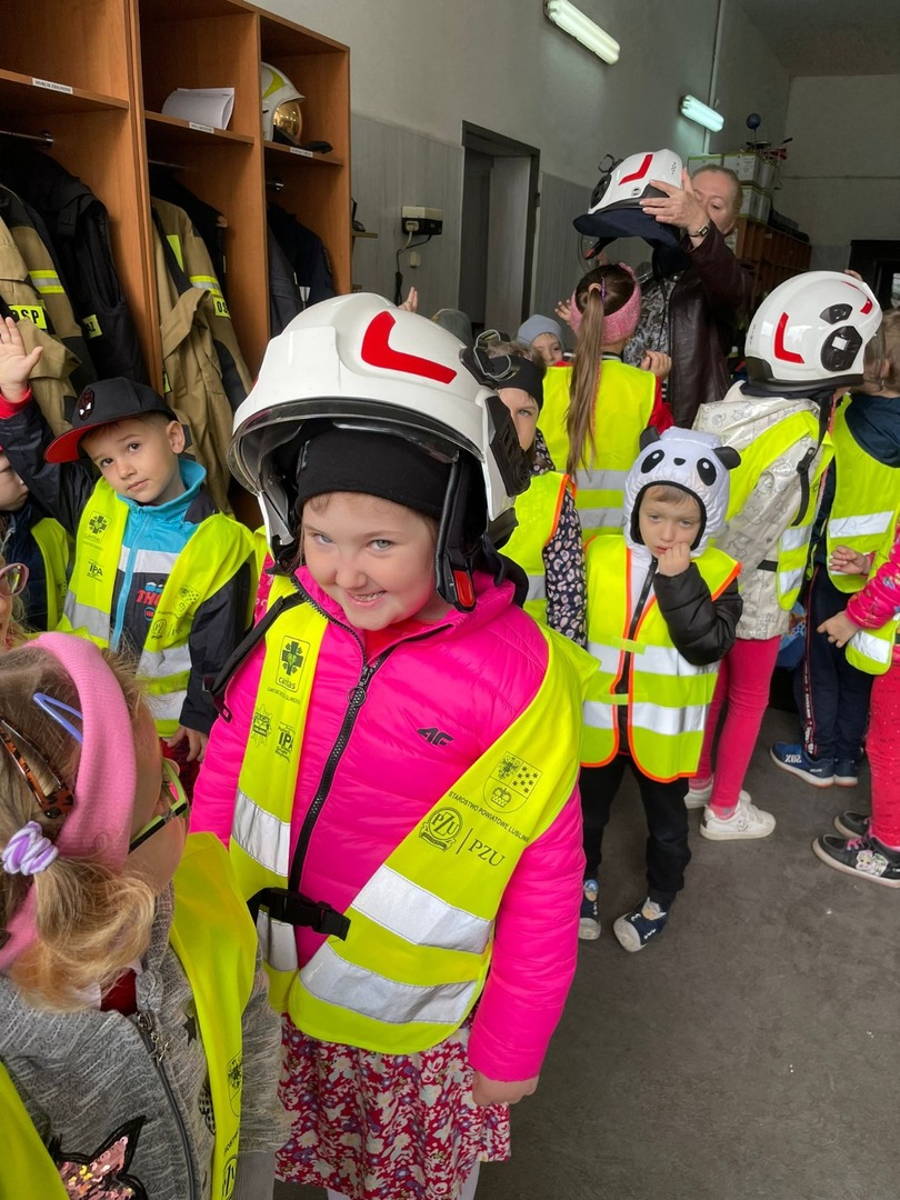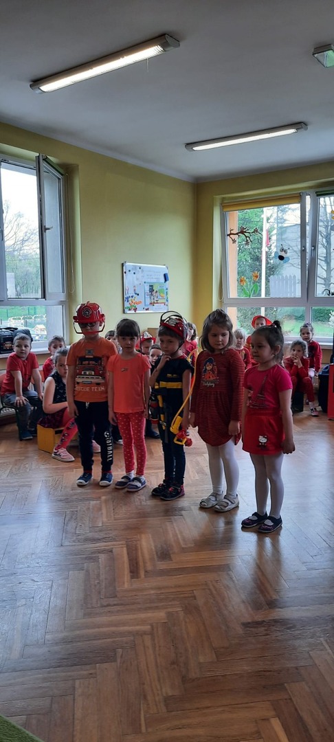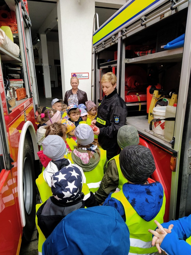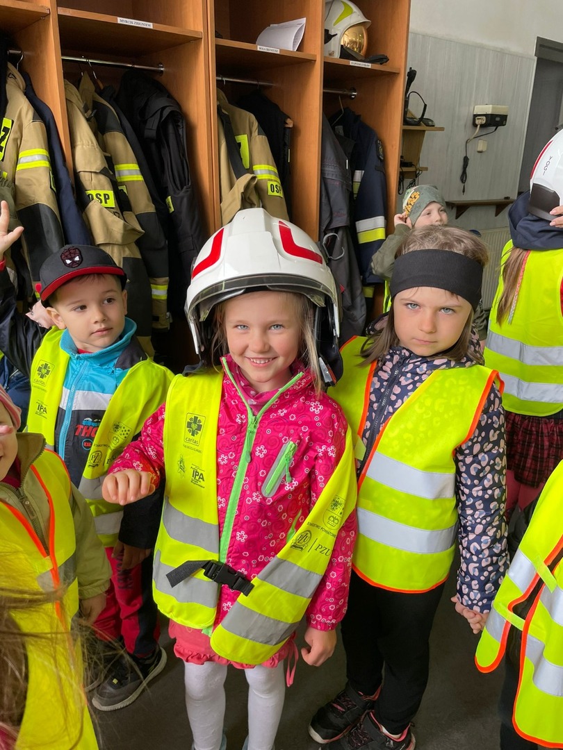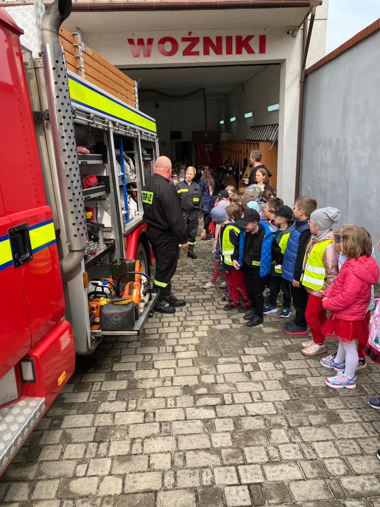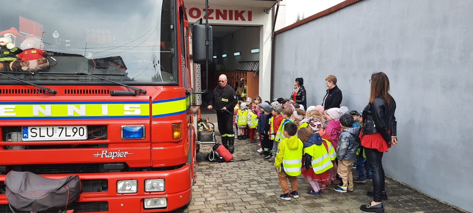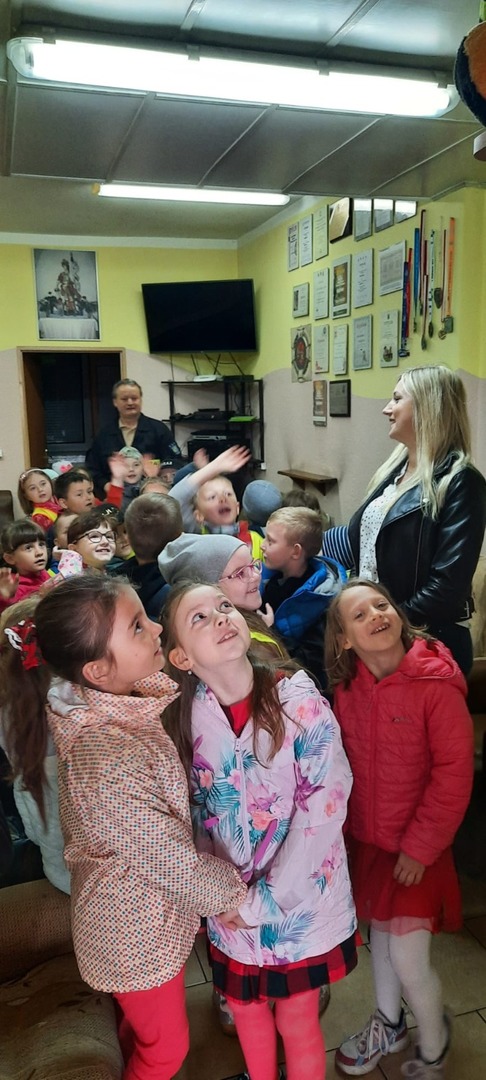 Dzisiejszy dzień był dla nas pełny wrażeń, wszystko za sprawą tego, że wybraliśmy się do jednostki OSP w Woźnikach, gdzie przywitał nas Prezes jednostki pan Krzysztof Nowacki, który oprowadził nas po jednostce opowiadając o pracy strażaka. Przedszkolaki z ogromnym zainteresowaniem słuchały opowieści o trudnej, odpowiedzialnej i niebezpiecznej pracy strażaka, jak i zadawały pytania. Utrwaliły znajomość numeru alarmowego - 112. Dużo radości sprawiło dzieciom przymierzanie hełmu i odzieży ochronnej używanej w akcjach ratowniczo-gaśniczych. Ponadto oglądały wozy strażackie, poznały wyposażenie i sprzęt, służący do udzielania pomocy nie tylko w przypadku pożarów, ale również wypadków drogowych i innych trudnych sytuacji wymagających interwencji strażaków. Następnie wróciliśmy do przedszkola, gdzie dzieci z grup IV i V zaprezentowały program artystyczny dla naszych gości.