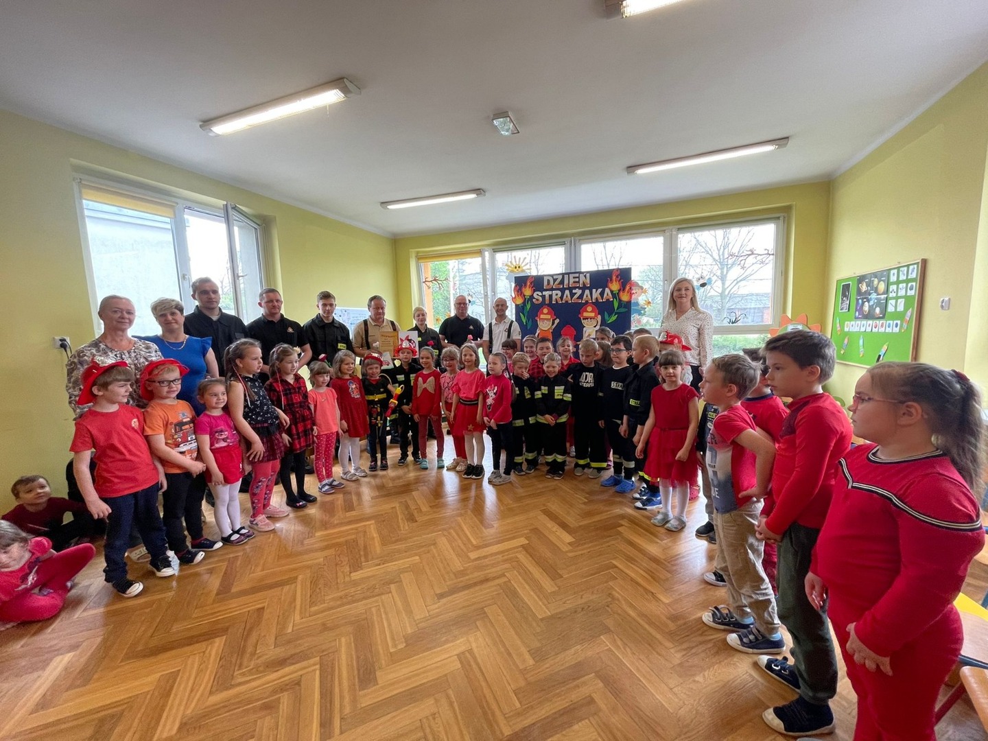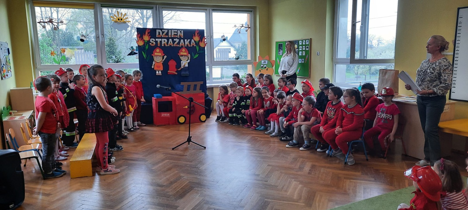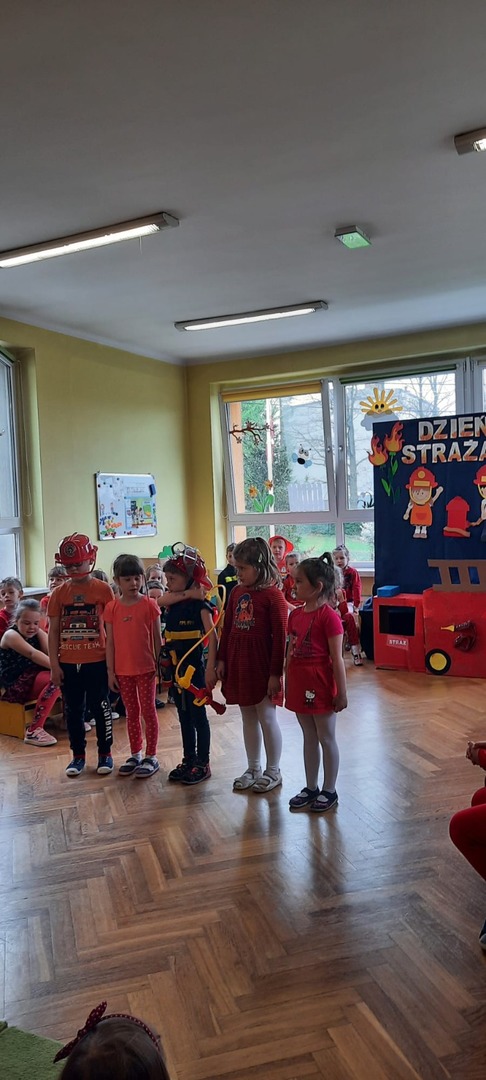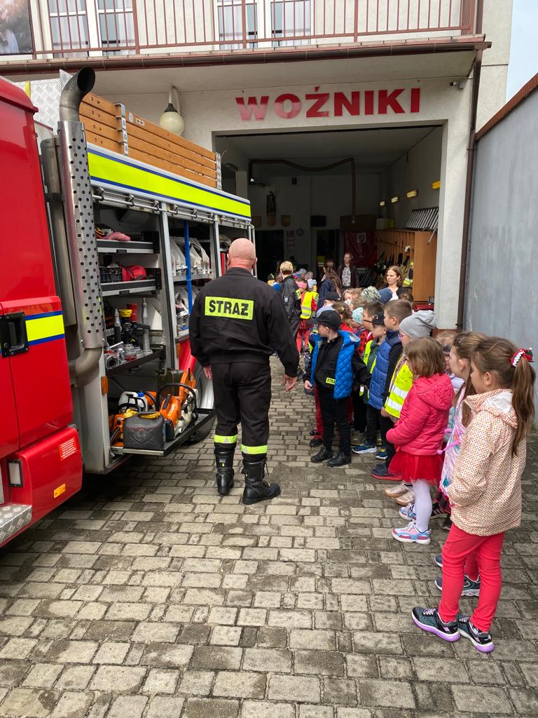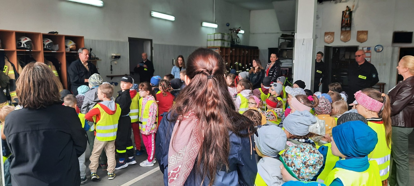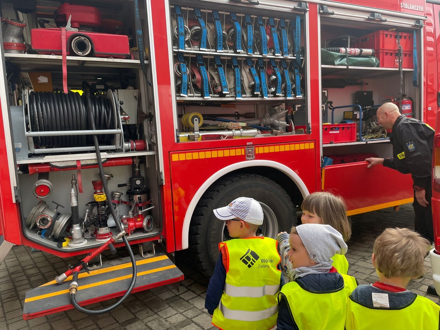 Dzisiejszy dzień był dla nas pełny wrażeń, wszystko za sprawą tego, że wybraliśmy się do jednostki OSP w Woźnikach, gdzie przywitał nas Prezes jednostki pan Krzysztof Nowacki, który oprowadził nas po jednostce opowiadając o pracy strażaka. Przedszkolaki z ogromnym zainteresowaniem słuchały opowieści o trudnej, odpowiedzialnej i niebezpiecznej pracy strażaka, jak i zadawały pytania. Utrwaliły znajomość numeru alarmowego - 112. Dużo radości sprawiło dzieciom przymierzanie hełmu i odzieży ochronnej używanej w akcjach ratowniczo-gaśniczych. Ponadto oglądały wozy strażackie, poznały wyposażenie i sprzęt, służący do udzielania pomocy nie tylko w przypadku pożarów, ale również wypadków drogowych i innych trudnych sytuacji wymagających interwencji strażaków. Następnie wróciliśmy do przedszkola, gdzie dzieci z grup IV i V zaprezentowały program artystyczny dla naszych gości.