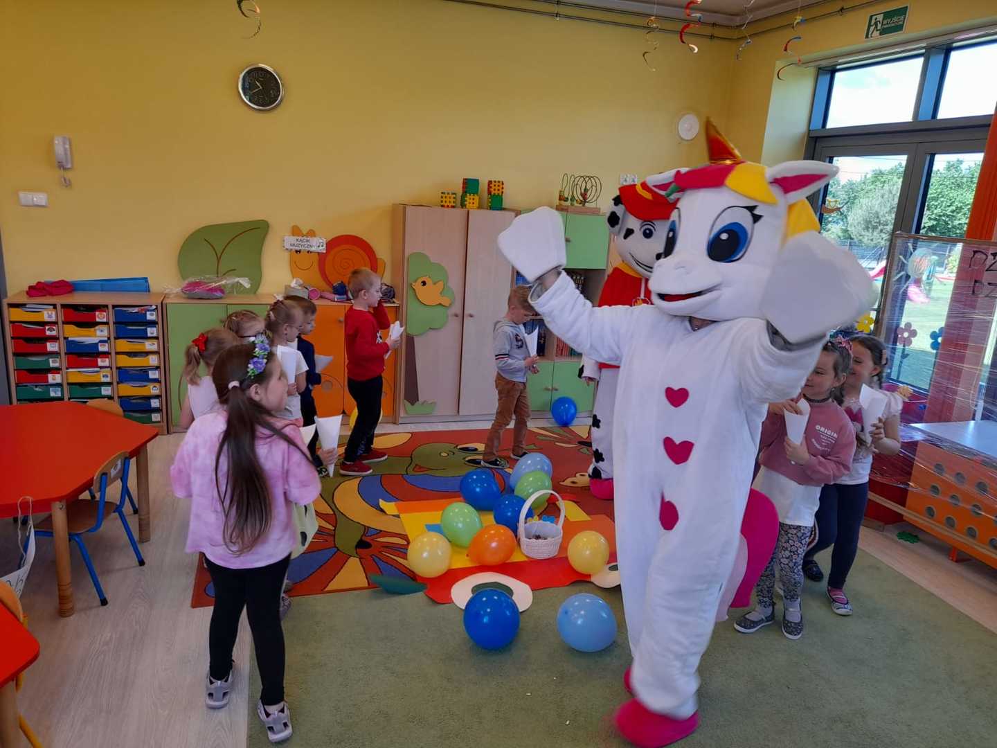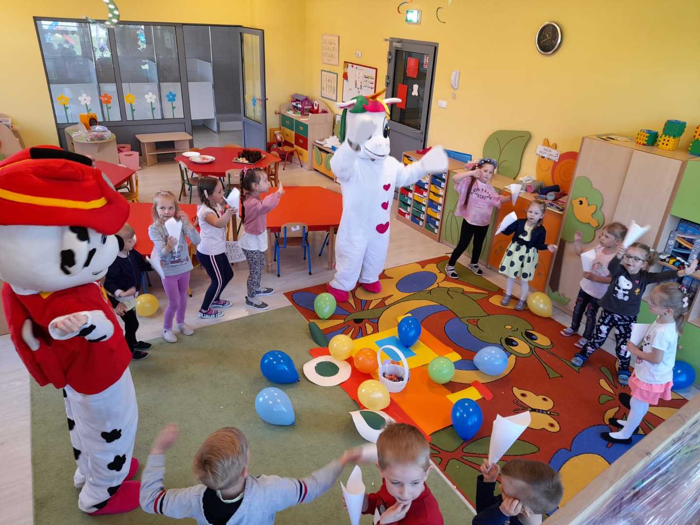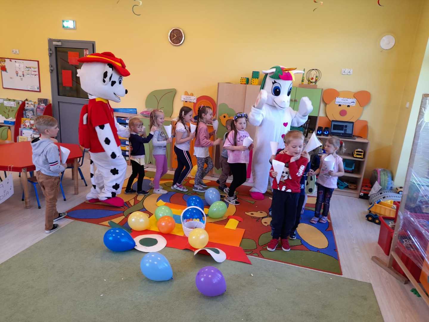 To oczywiście nie były jedyne atrakcje tego dnia. Po wspólnej zabawie dzieci odwiedziły bajkowe postacie z którymi oprócz wspólnej zabawy mogły skosztować popcornu, lodów. Towarzyszące w tym dniu okrzyki radości na pewno świadczyły o dobrej zabawie.