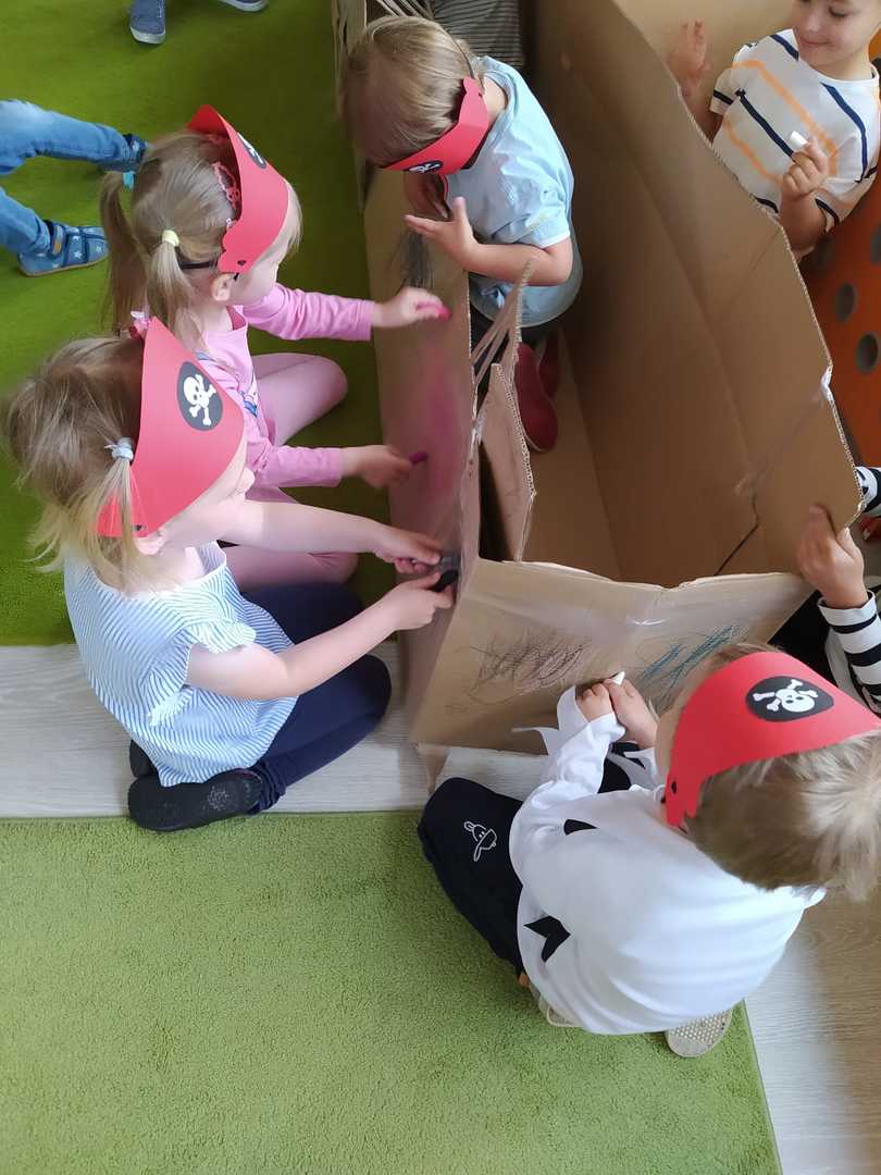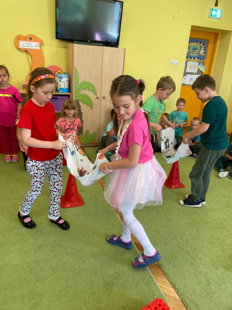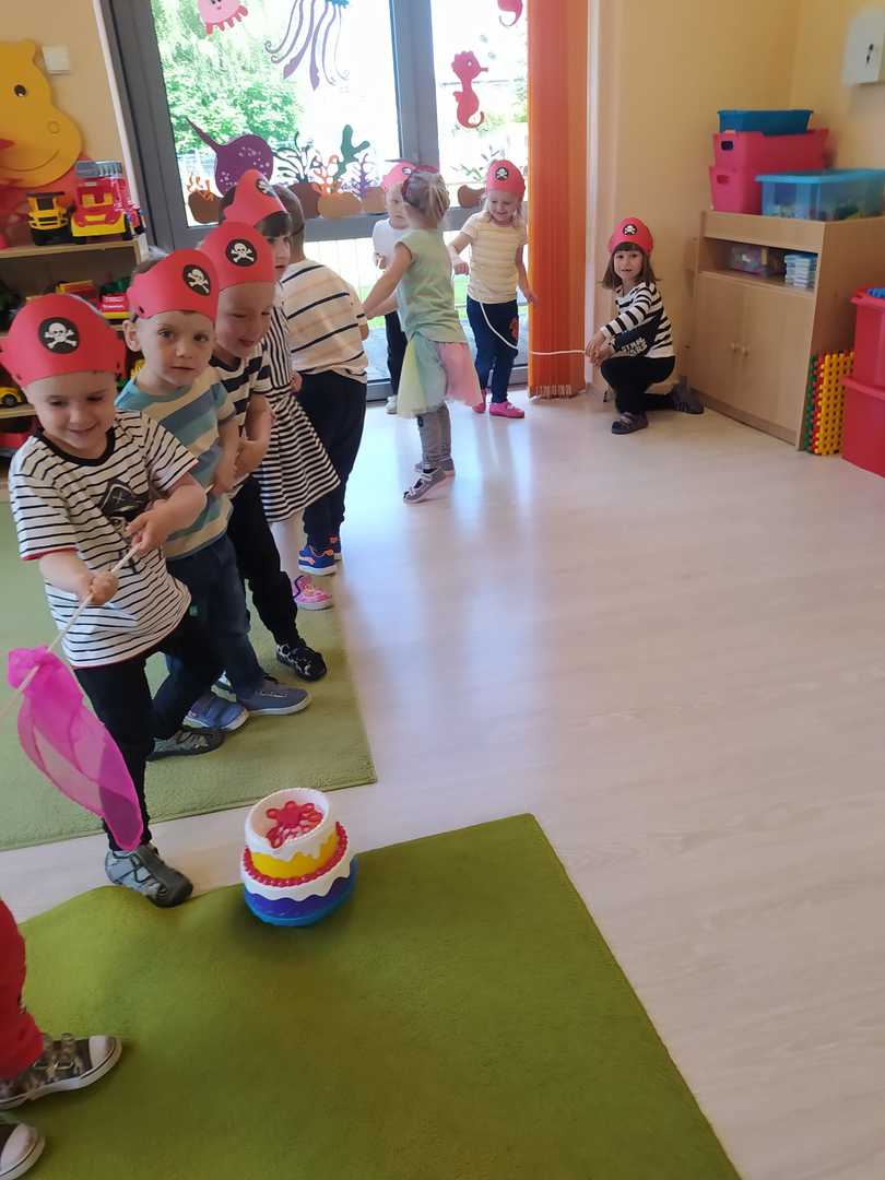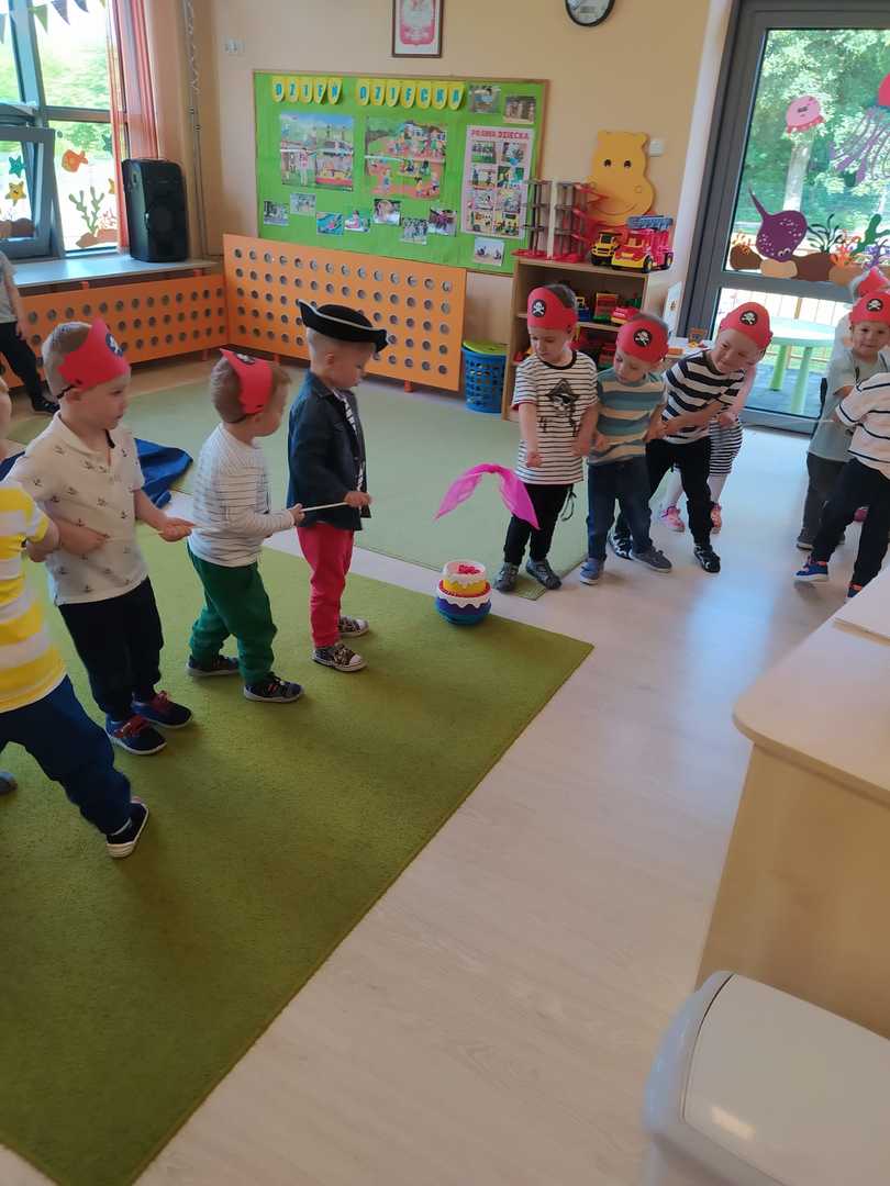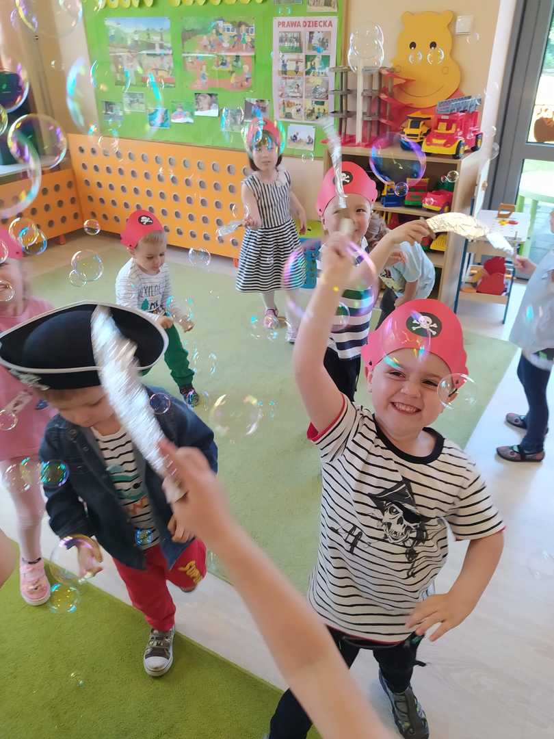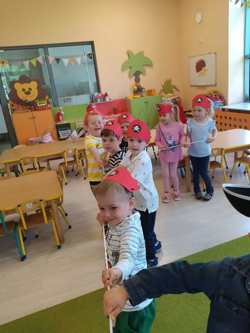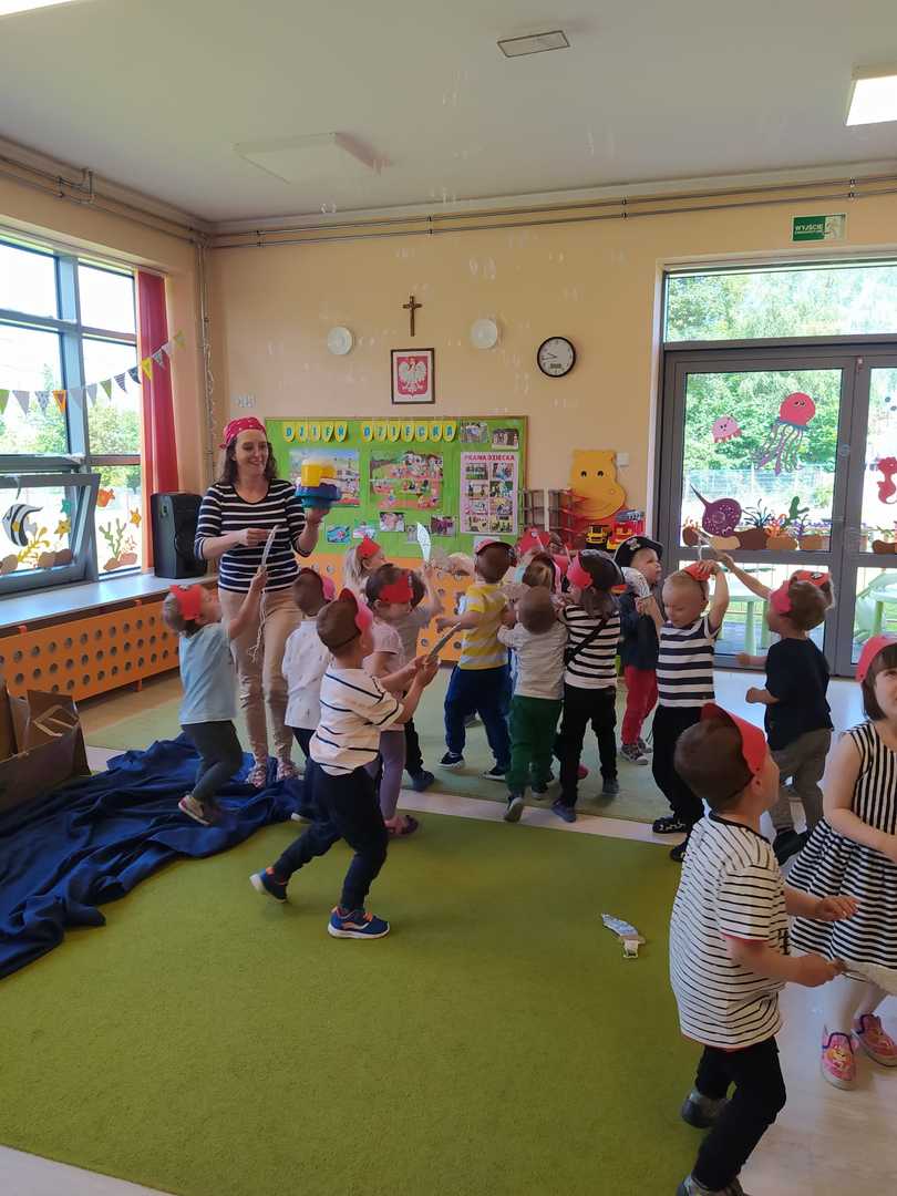 W każdej grupie w czasie zabawy towarzyszyło hasło przewodnie. „Jeżyki” bawiąc się w piratów poszukiwali skarbów. „Niedźwiadki” wyruszyły do krainy marzeń a „Wiewiórki” zamieniły się w cukierników. „Zajączki” wzięły udział w Olimpiadzie sportowej a „Liski” bawiły się wyśmienicie jako mali kucharze.