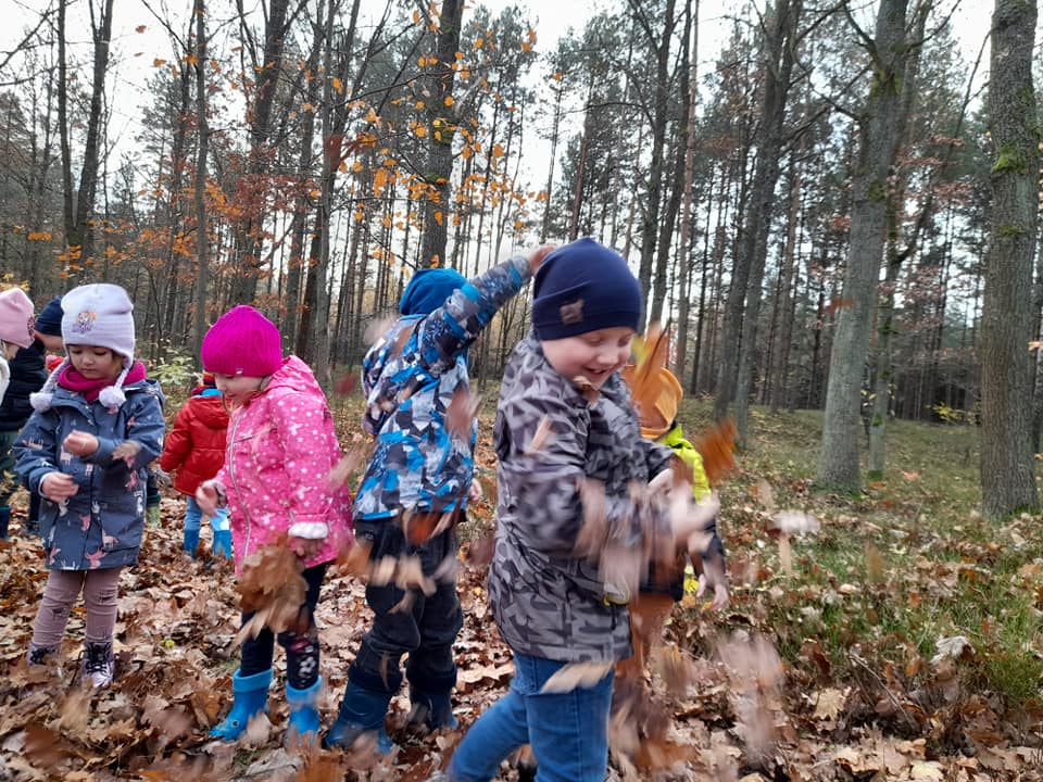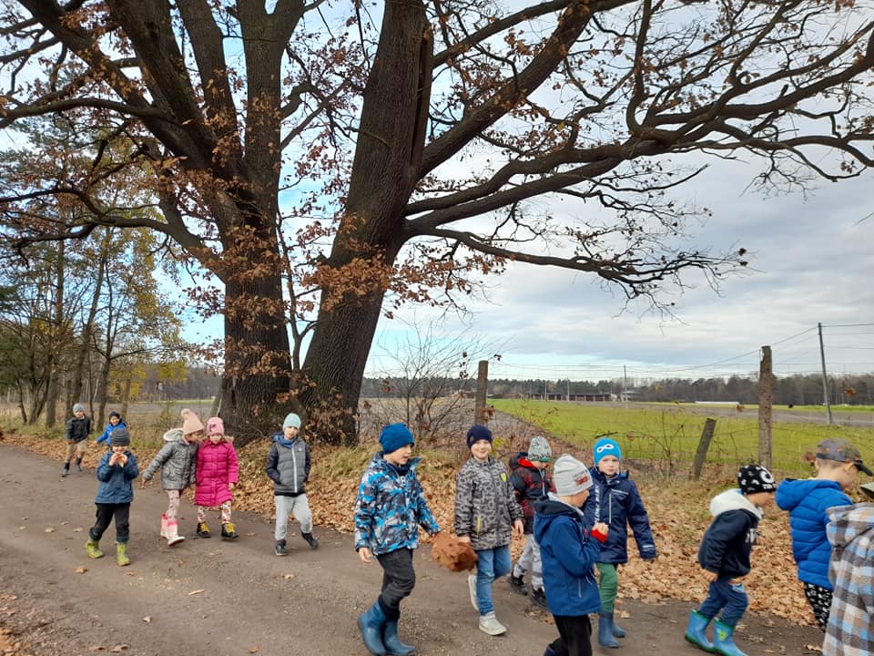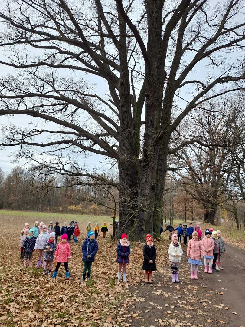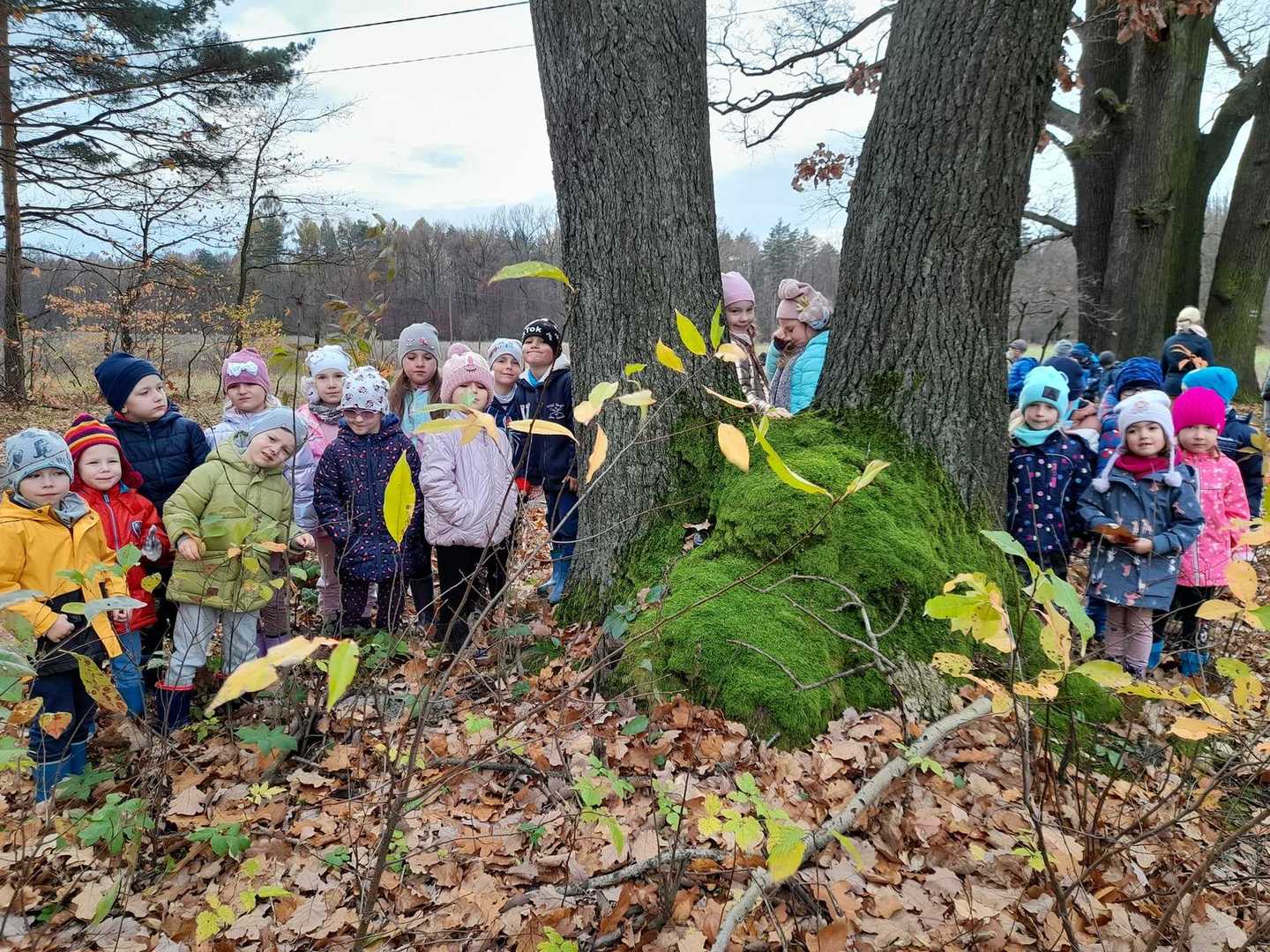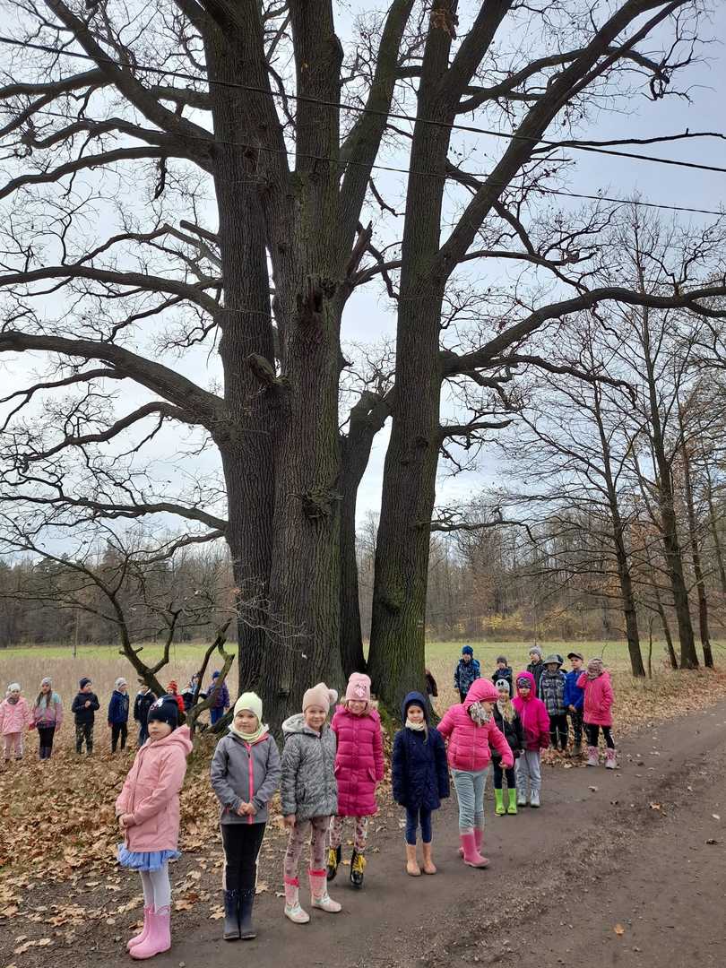 Już nadeszła złota jesień i zmieniła wszystko w lesie. Liście złote i czerwone Lecą wiatrem uniesione. Dąb w brązowym płaszczu stoi, zimna wcale się nie boi,