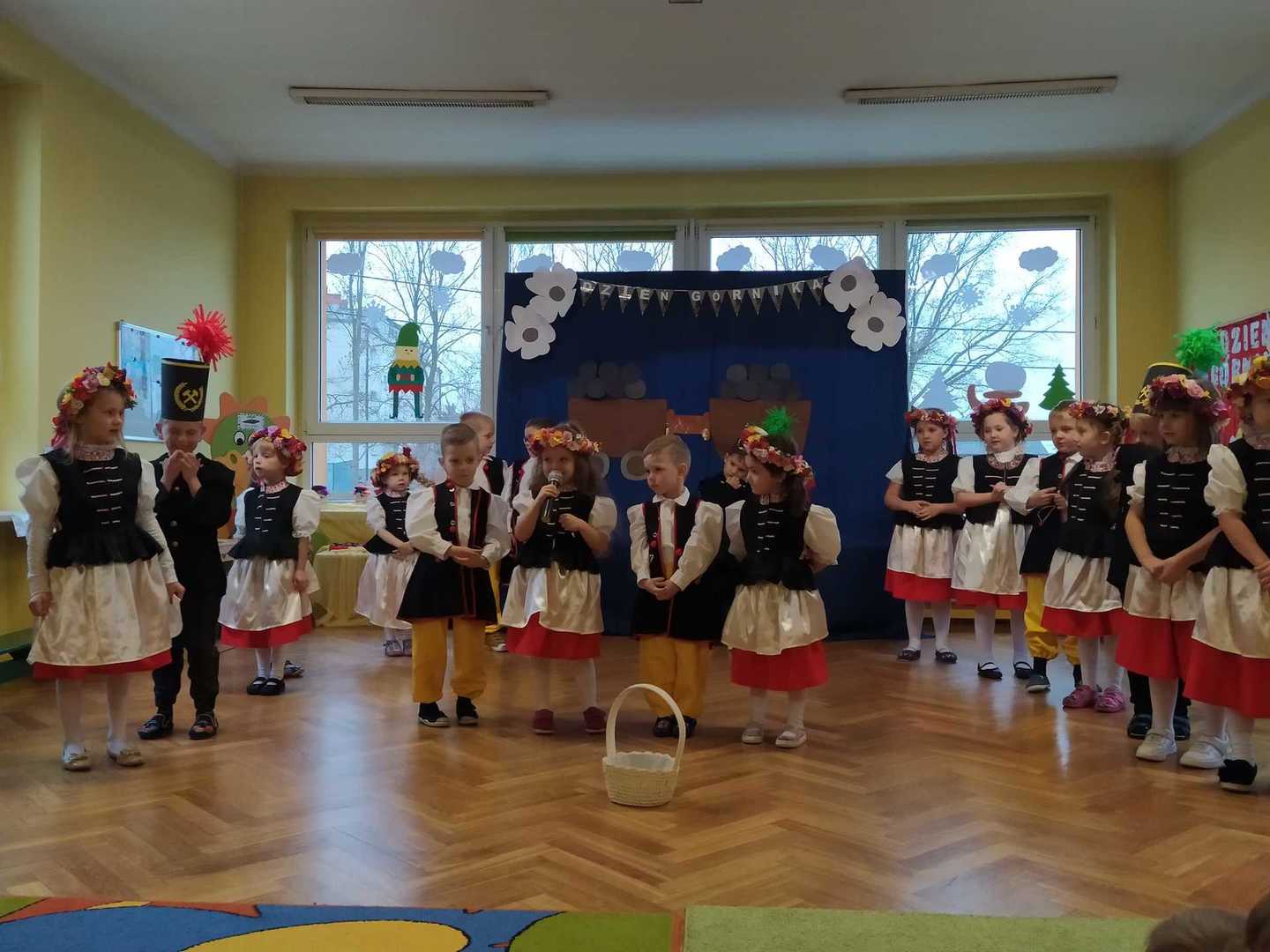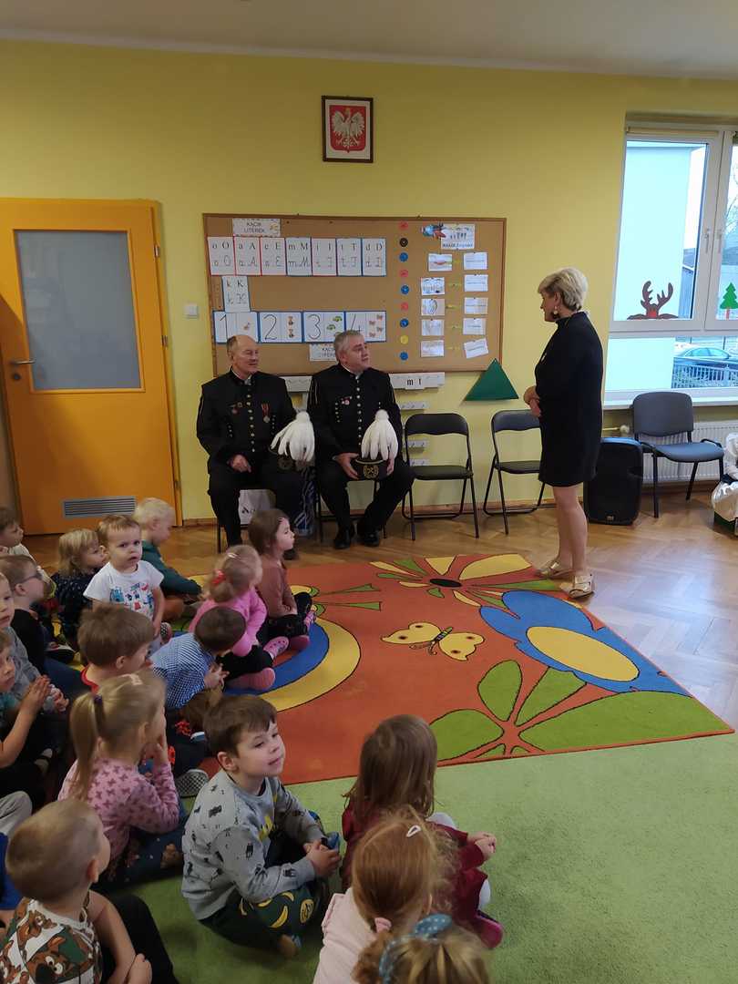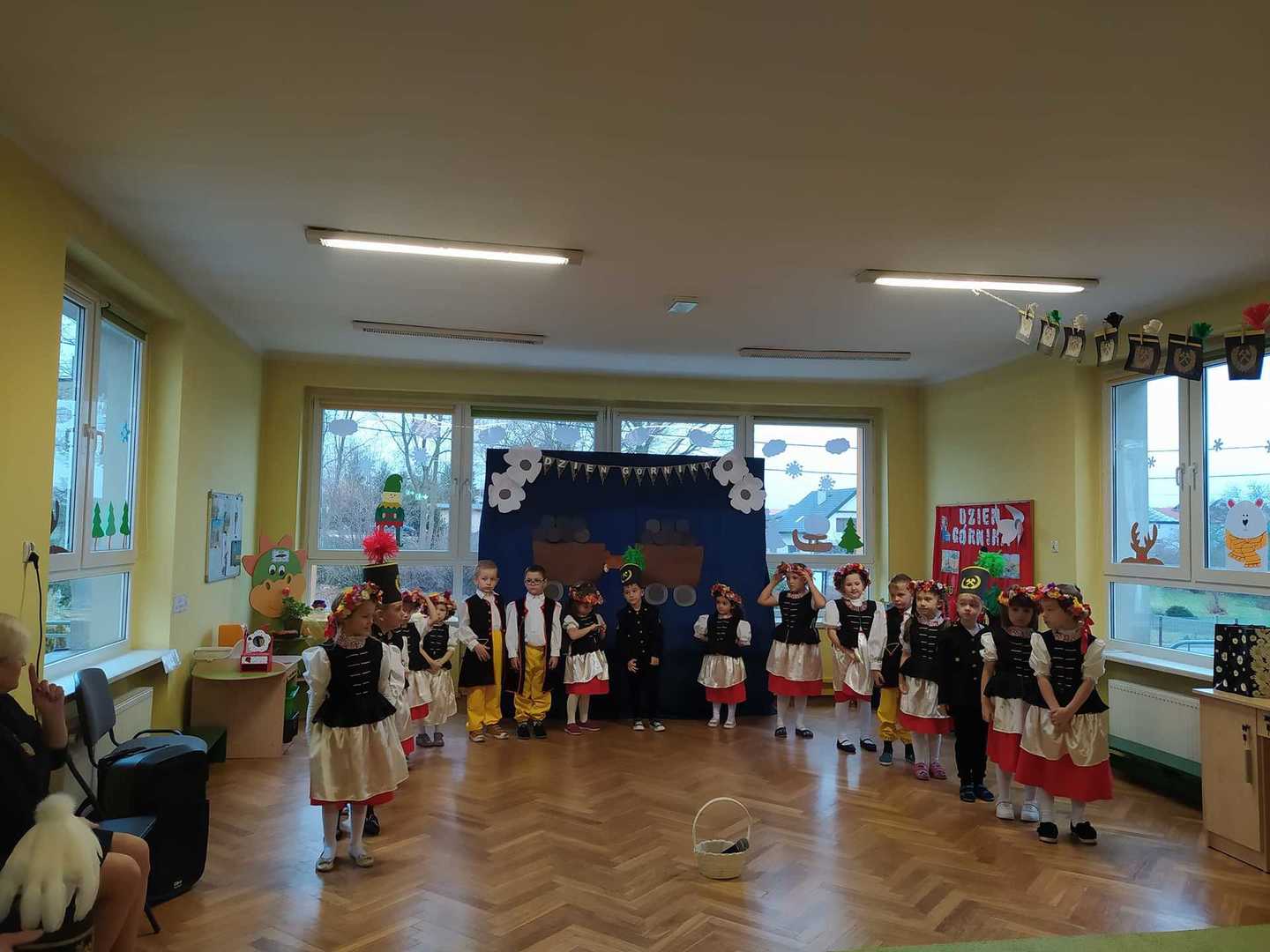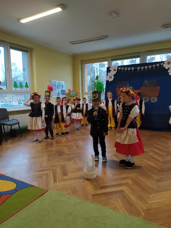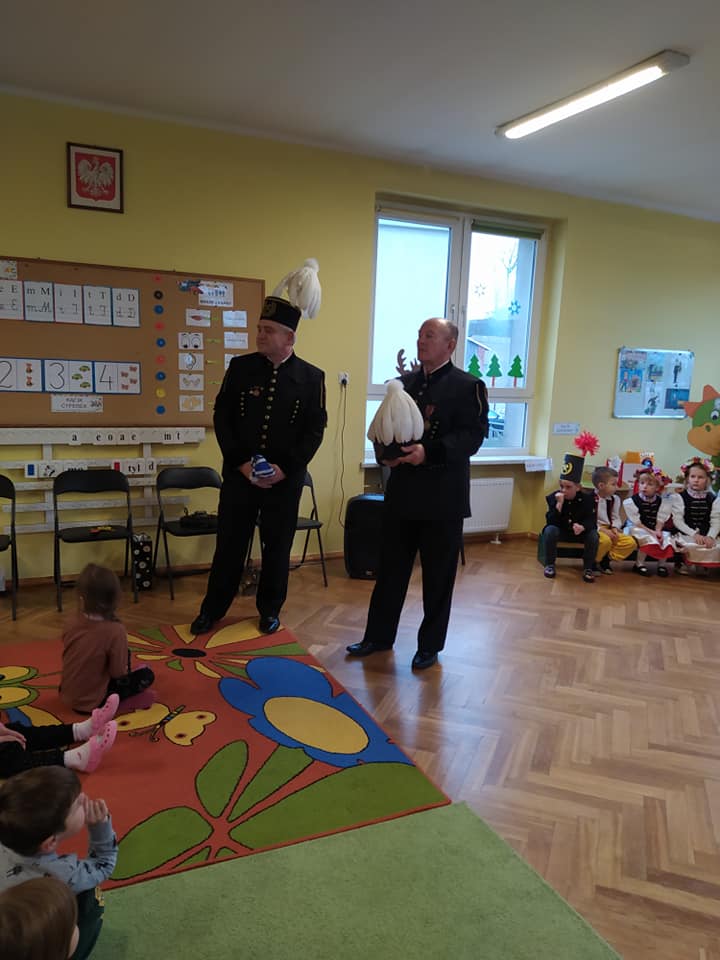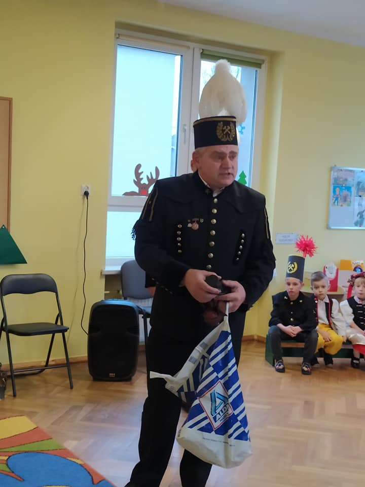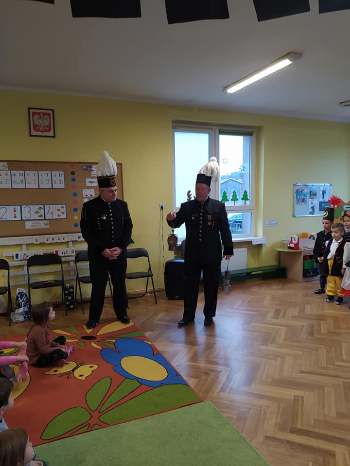 Dzieci z grupy niedźwiadków przywitały naszych Gości tańcami śląskimi, wierszami i piosenkami. Górnicy opowiedzieli nam o tym, jak bardzo trudna i niebezpieczna jest praca w kopalni. Zaprezentowali galowy górniczy mundur i odznaczenia. Dzieci z zainteresowaniem i uwagą słuchały Gości.Zadawały mnóstwo pytań. Na koniec podziękowały za przybycie.