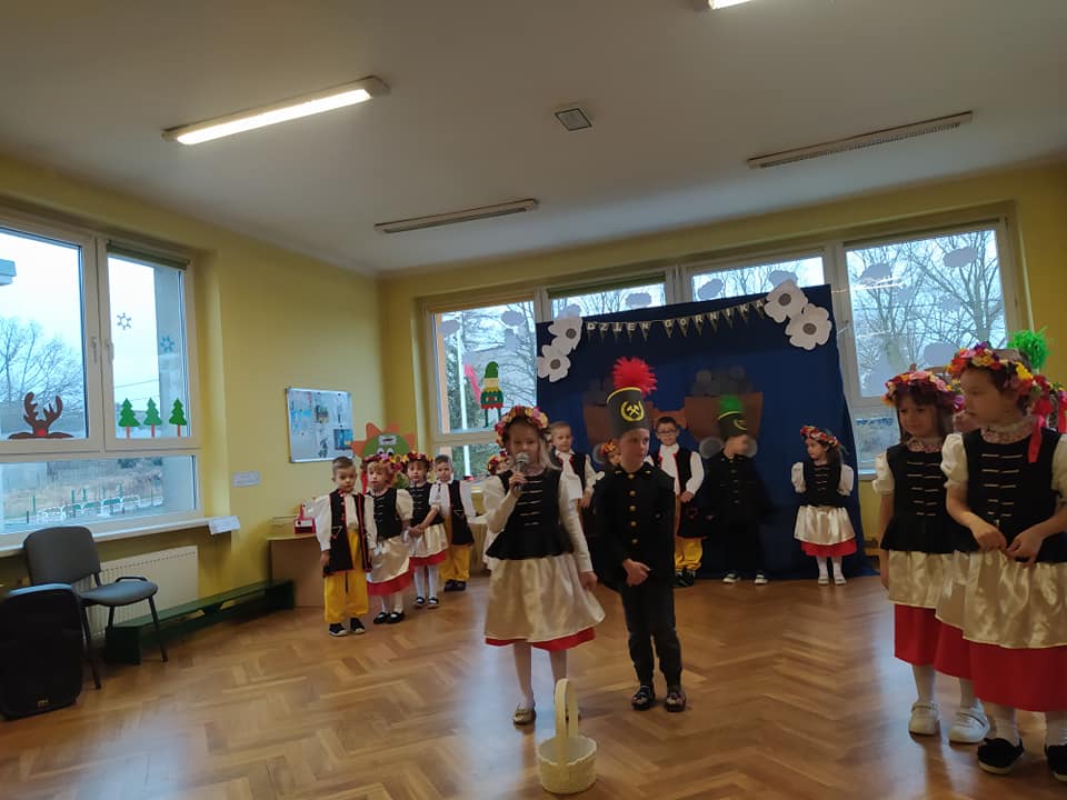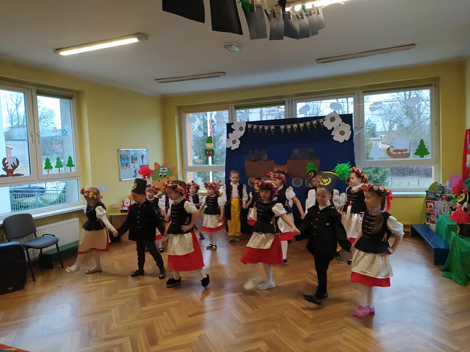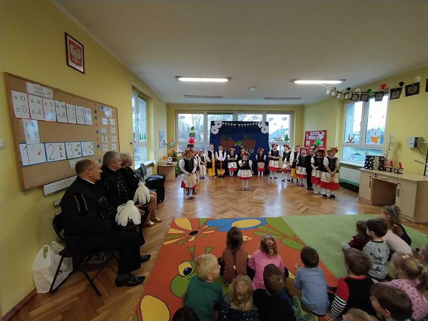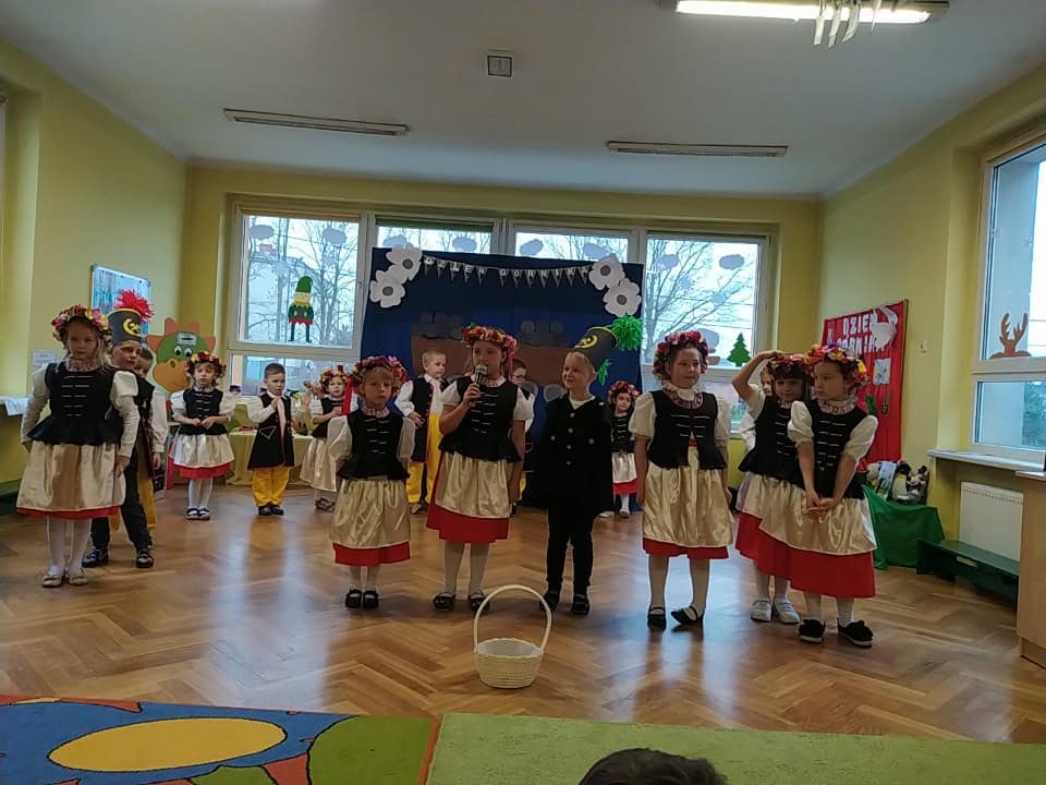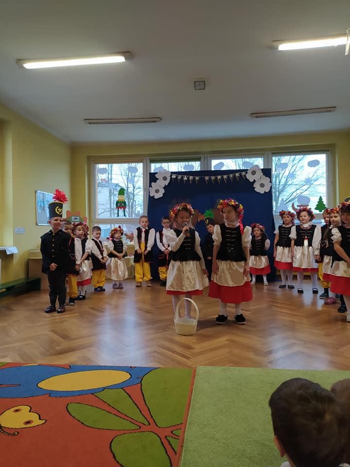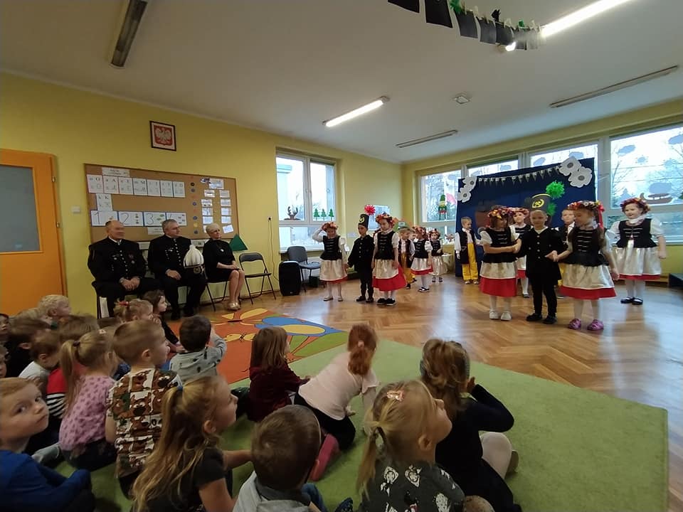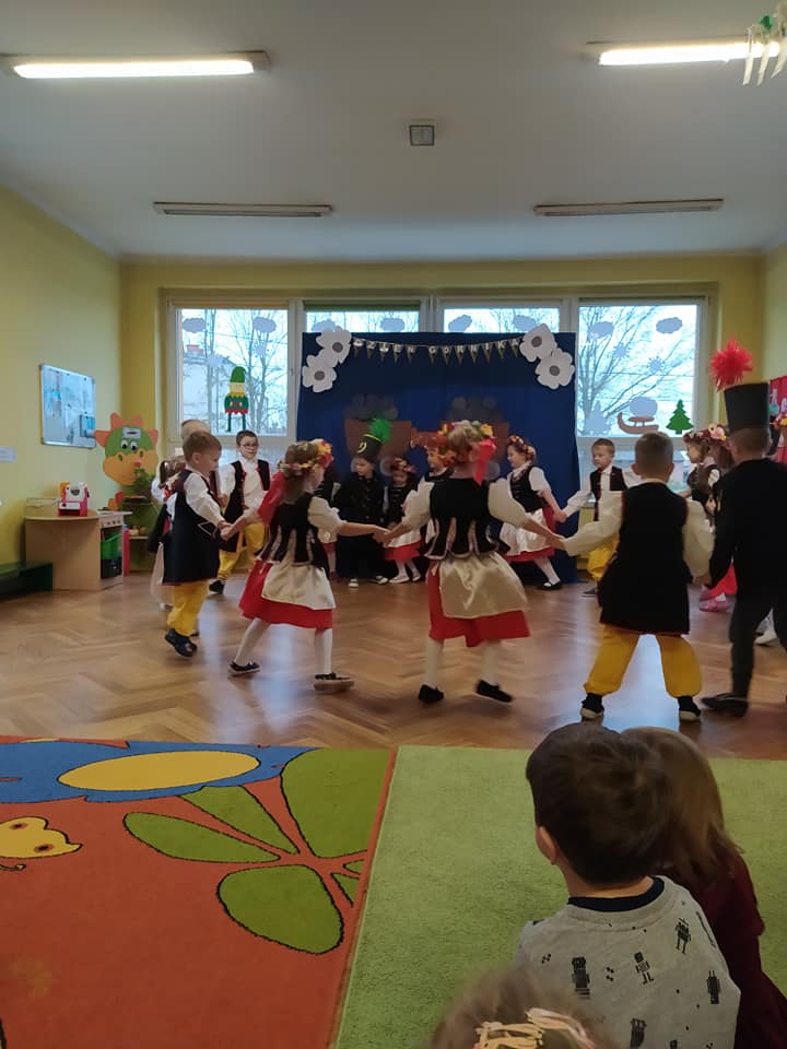Dzieci z grupy niedźwiadków przywitały naszych Gości tańcami śląskimi, wierszami i piosenkami. Górnicy opowiedzieli nam o tym, jak bardzo trudna i niebezpieczna jest praca w kopalni. Zaprezentowali galowy górniczy mundur i odznaczenia. Dzieci z zainteresowaniem i uwagą słuchały Gości.Zadawały mnóstwo pytań. Na koniec podziękowały za przybycie.
