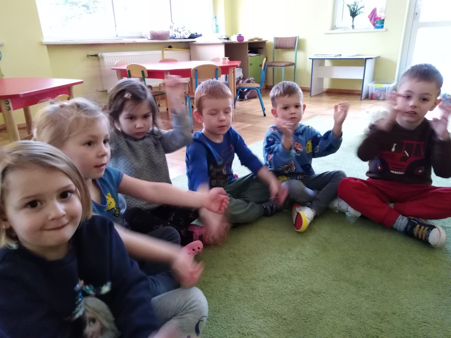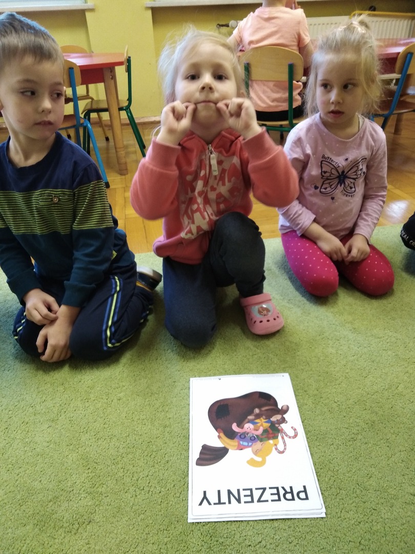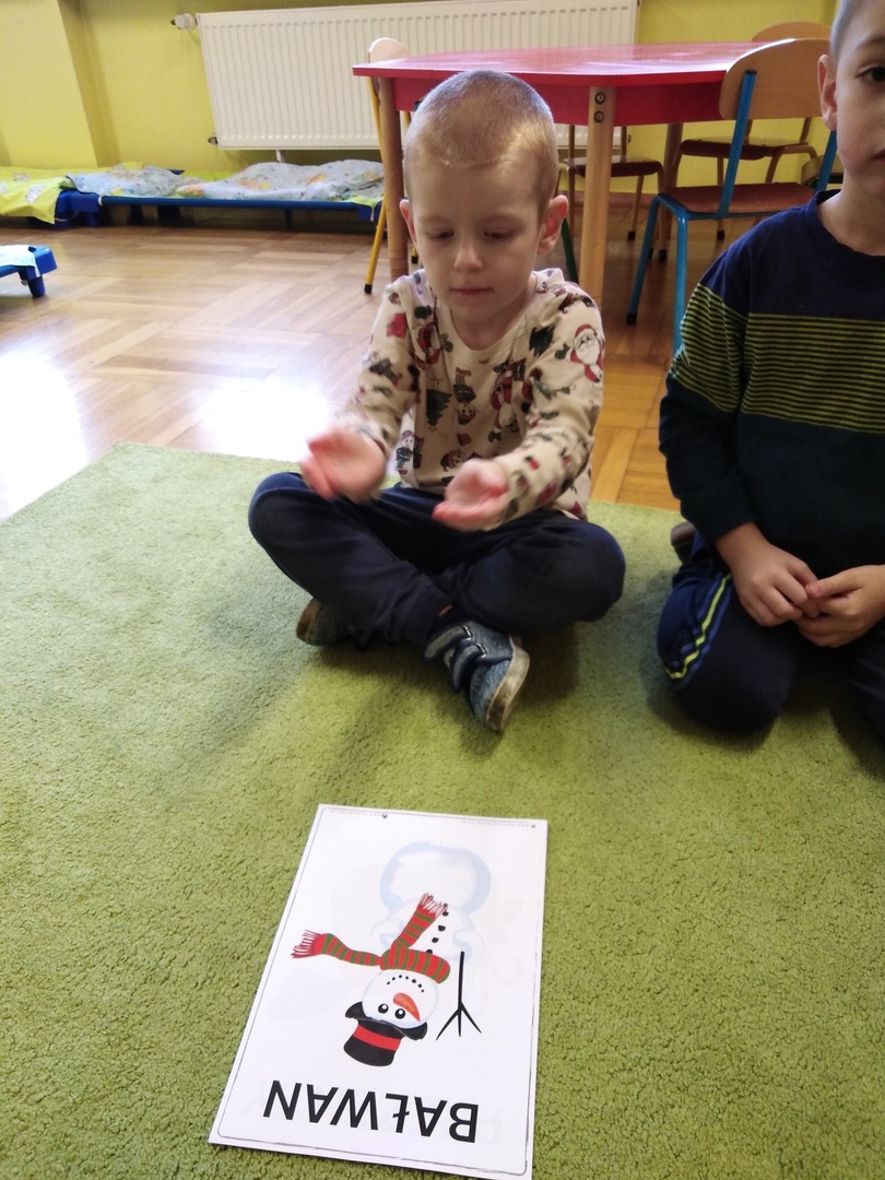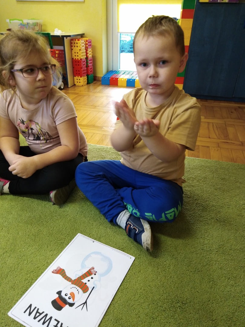 -brały udział w zabawach ruchowych „Prezenty” i „Bałwanki”, które ćwiczyły reakcję na zmienne tempo muzyki, reakcję na sygnał,kształtowały sprawność ruchową i motorykę całego ciała utrwalając jednocześnie poznane znaki języka migowego;