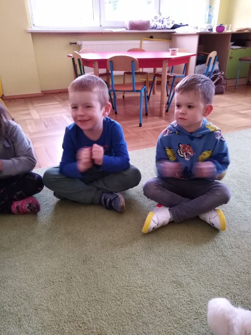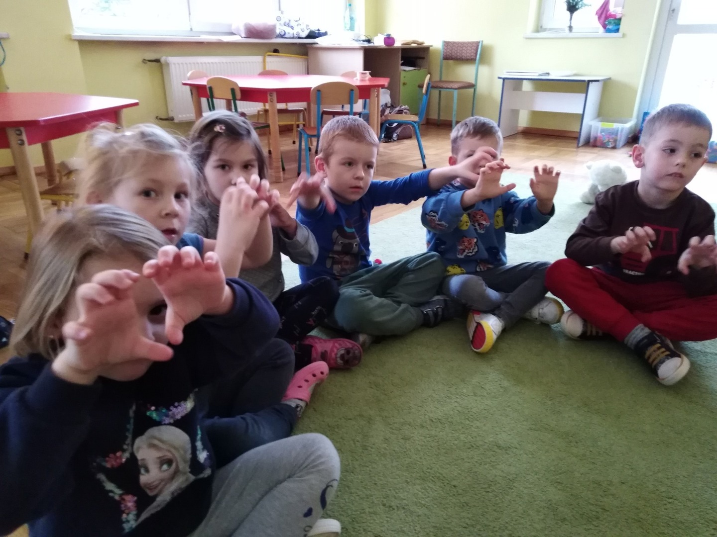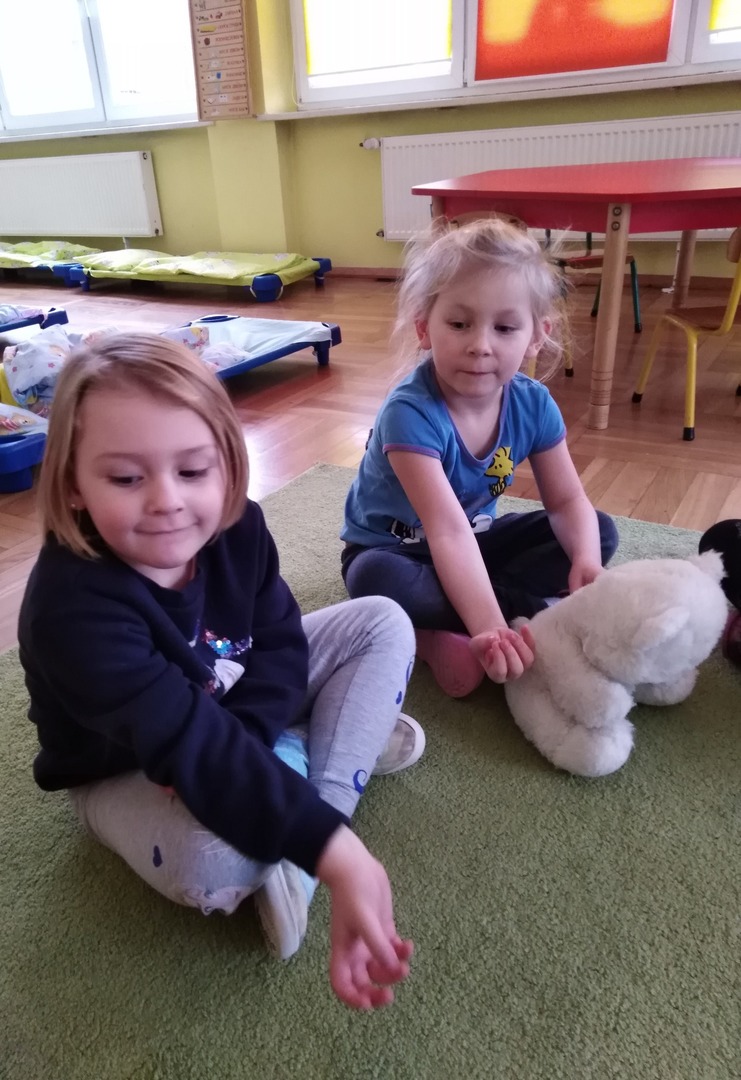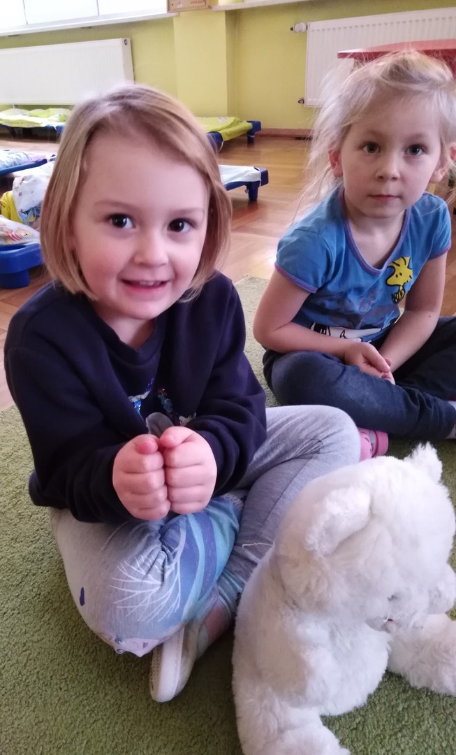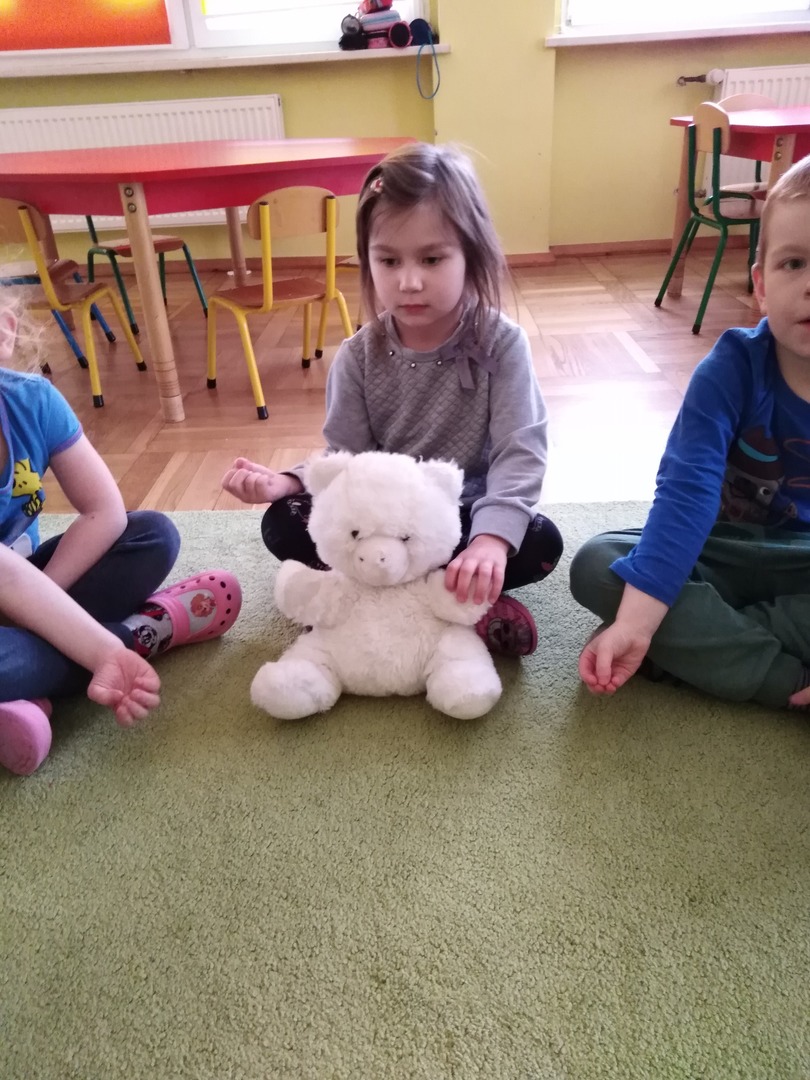 - bawiły się w „Powitanie z misiem polarnym” ćwicząc uwagę słuchową i poznając nazwy pór roku w języku migowym;