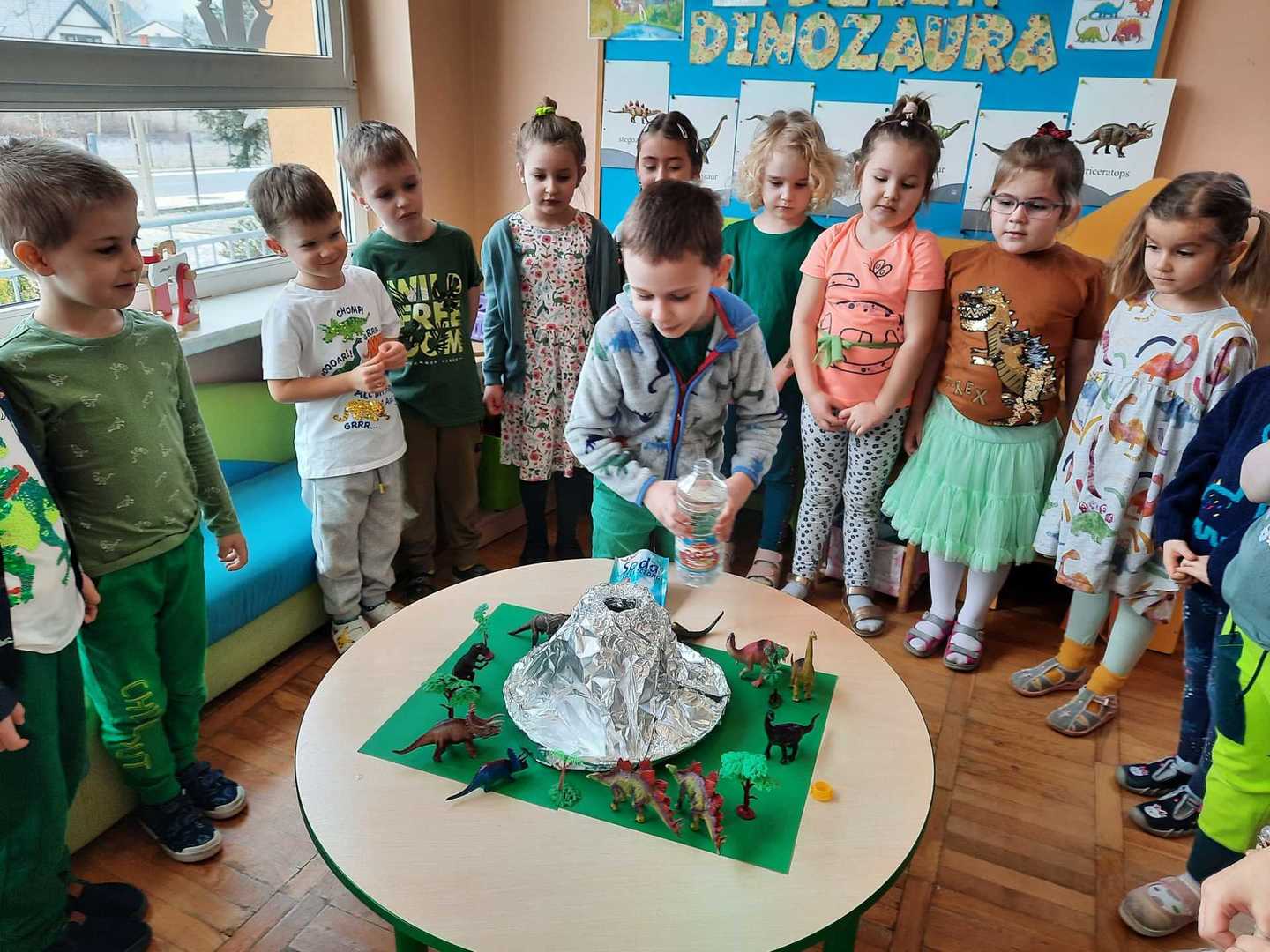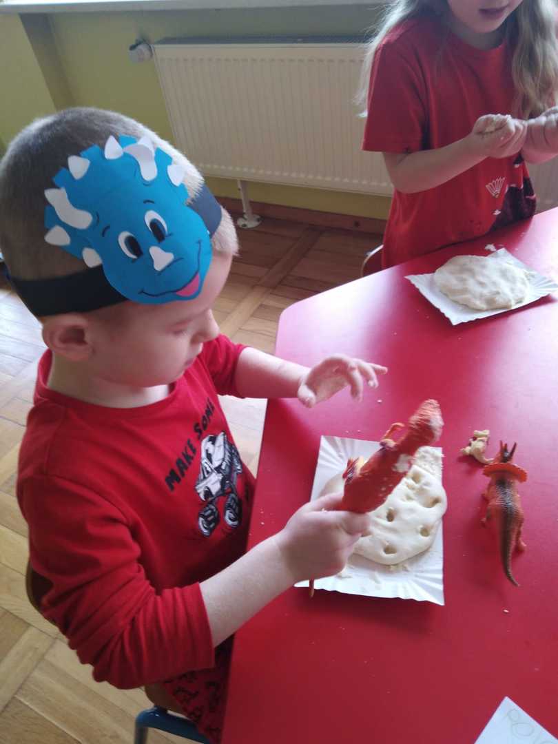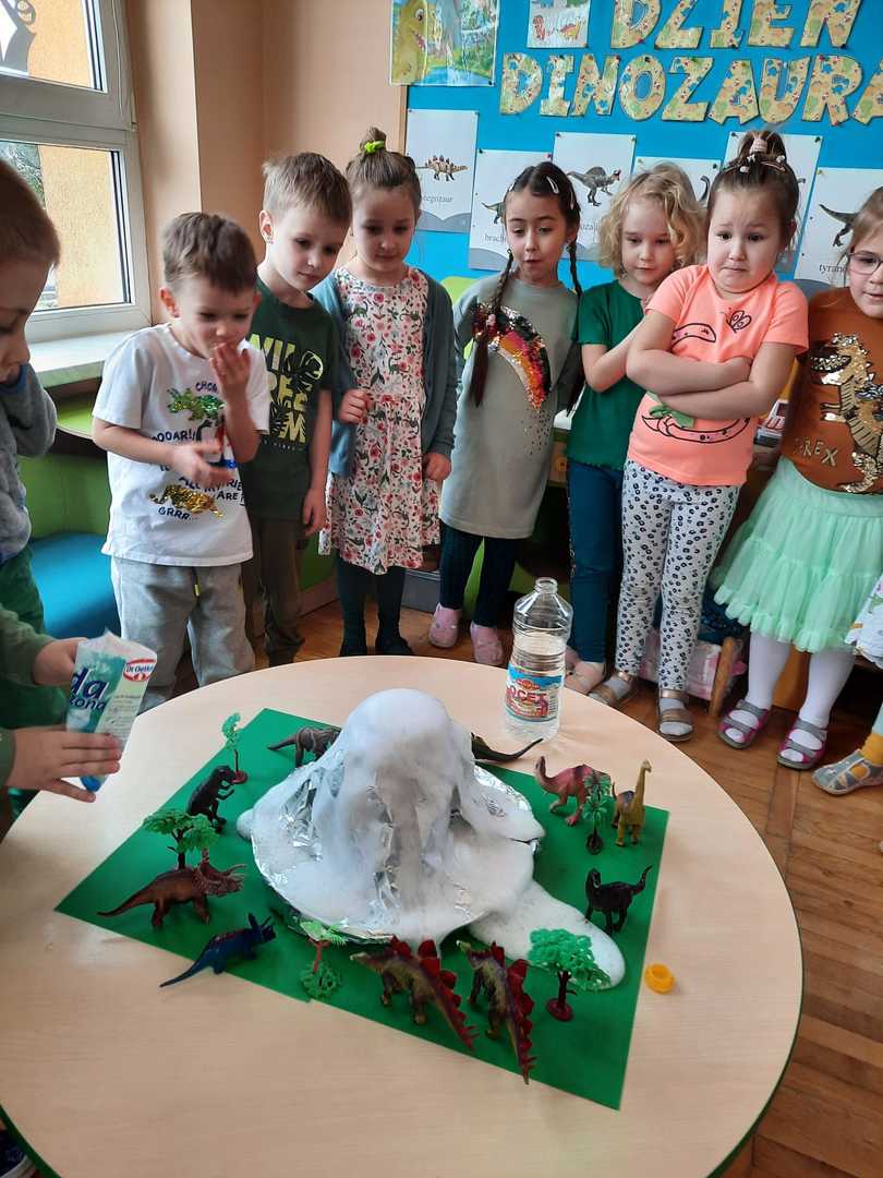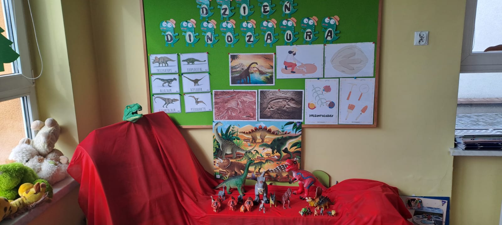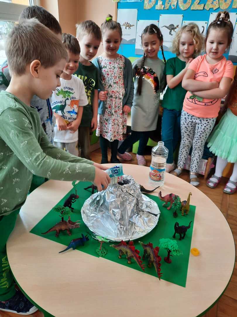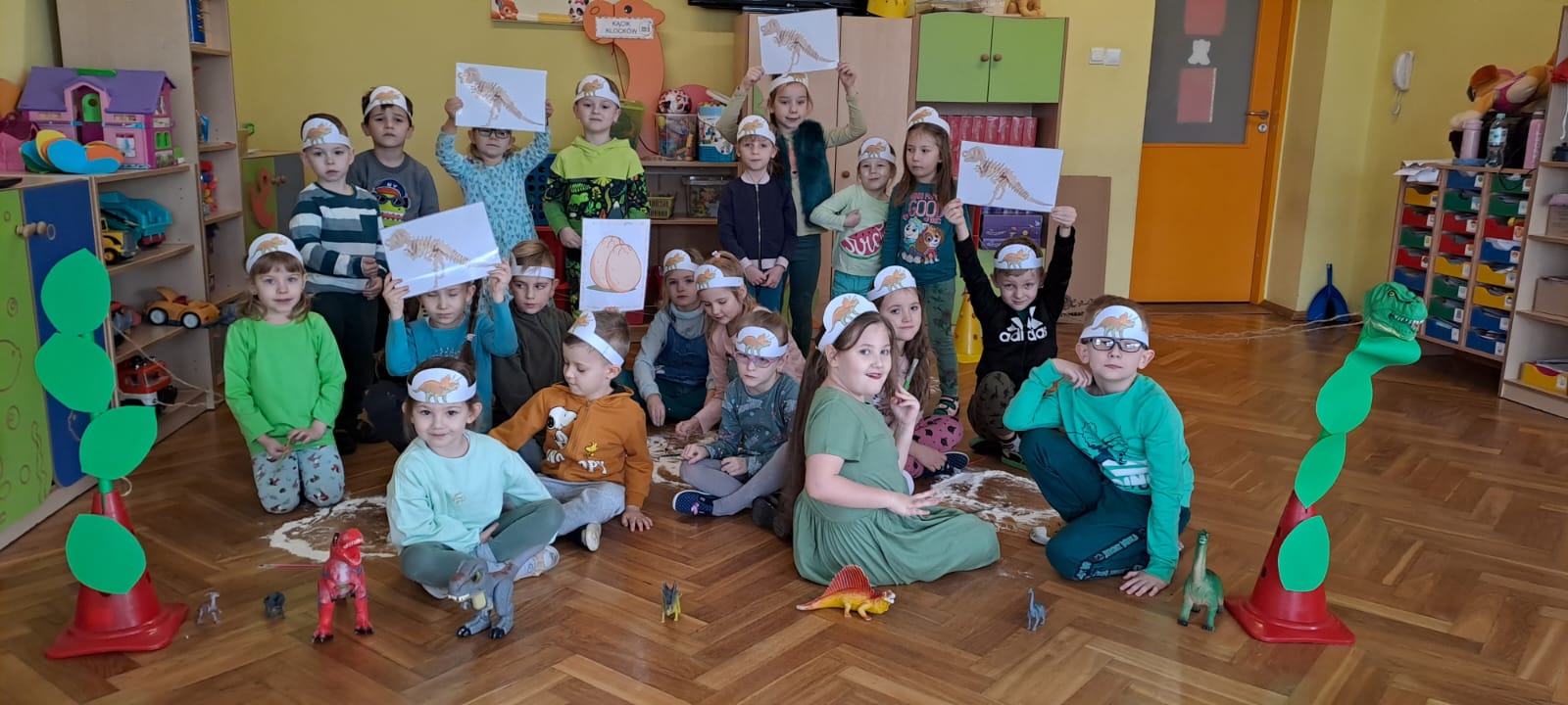Dziś obchodziliśmy święto znanych, prehistorycznych stworzeń - Dzień Dinozaura. Dzieci poznały historię dinozaurów, dowiedziały się kiedy żyły, czym się żywiły i jak wyglądały. Rozmawialiśmy na temat pracy paleontologa i wspólnie dokonaliśmy ,,wykopalisk" dzięki którym zobaczyliśmy jak wyglądają szkielety niektórych dinozaurów. W zorganizowanych kącikach można było podziwiać diplodoki tyranozaury, triceratopsy, pterodaktyle itp. Nie zabrakło również ciekawych zabawach ruchowych oraz plastycznych związanych z tematyką zajęć. Duże zainteresowanie wzbudziły zajęcia badawcze, dzięki którym dzieci mogły poznać działanie wulkanu.