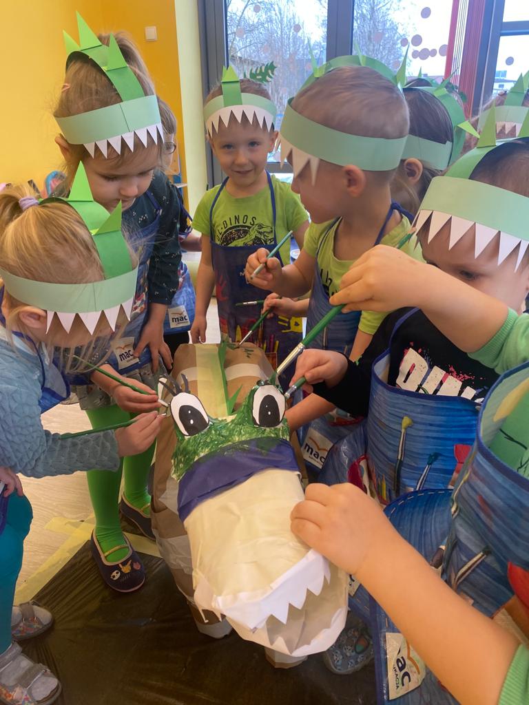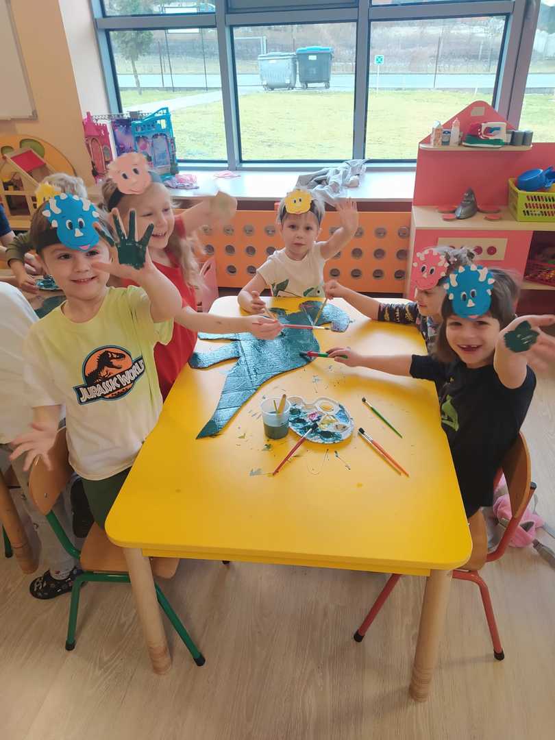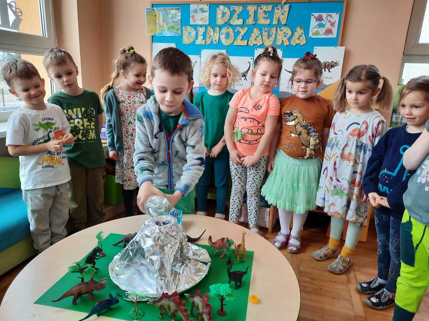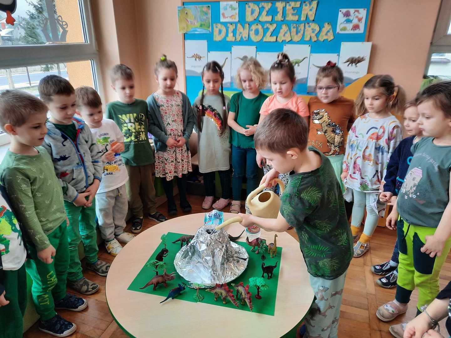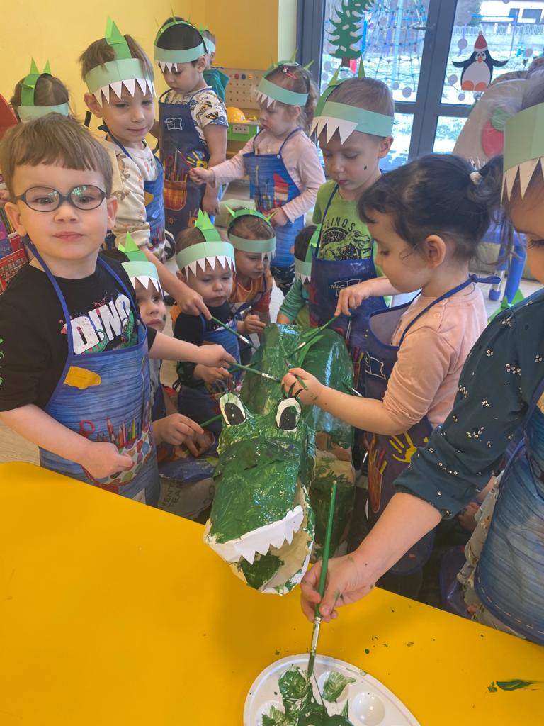 Dziś obchodziliśmy święto znanych, prehistorycznych stworzeń - Dzień Dinozaura. Dzieci poznały historię dinozaurów, dowiedziały się kiedy żyły, czym się żywiły i jak wyglądały. Rozmawialiśmy na temat pracy paleontologa i wspólnie dokonaliśmy ,,wykopalisk" dzięki którym zobaczyliśmy jak wyglądają szkielety niektórych dinozaurów. W zorganizowanych kącikach można było podziwiać diplodoki tyranozaury, triceratopsy, pterodaktyle itp. Nie zabrakło również ciekawych zabawach ruchowych oraz plastycznych związanych z tematyką zajęć. Duże zainteresowanie wzbudziły zajęcia badawcze, dzięki którym dzieci mogły poznać działanie wulkanu.