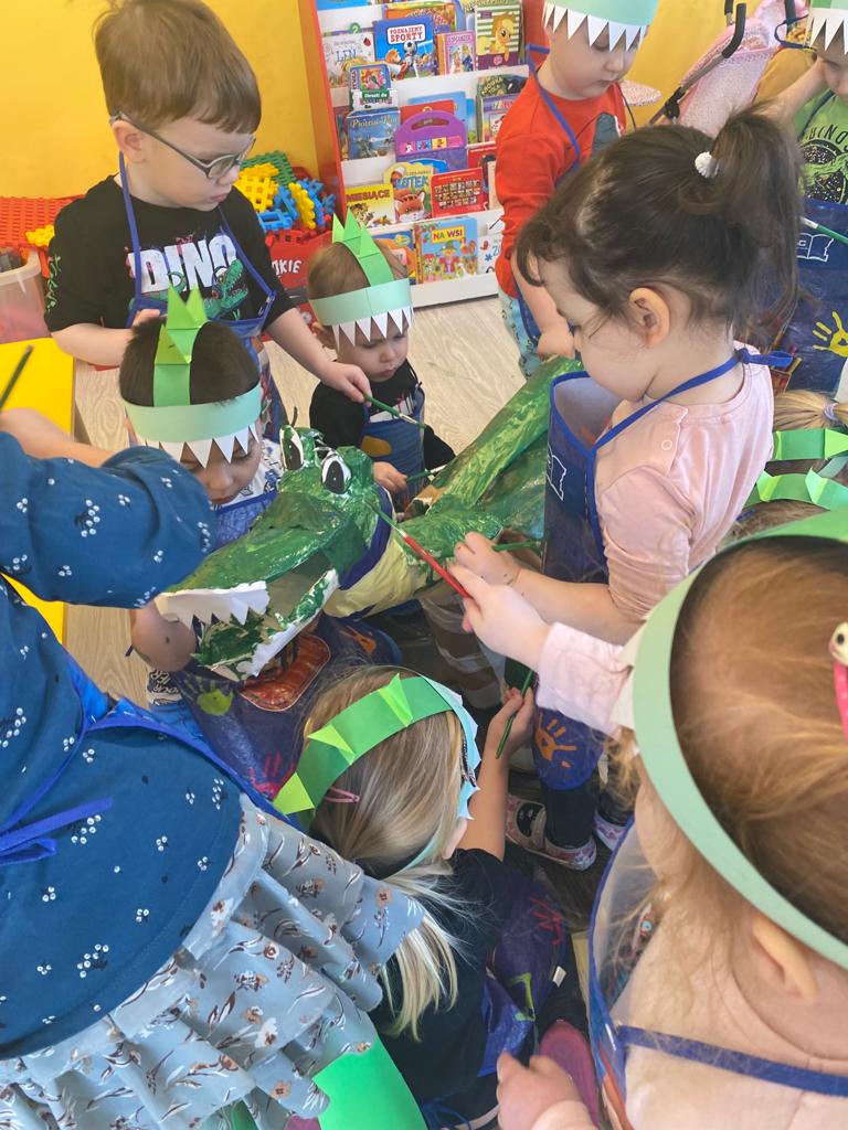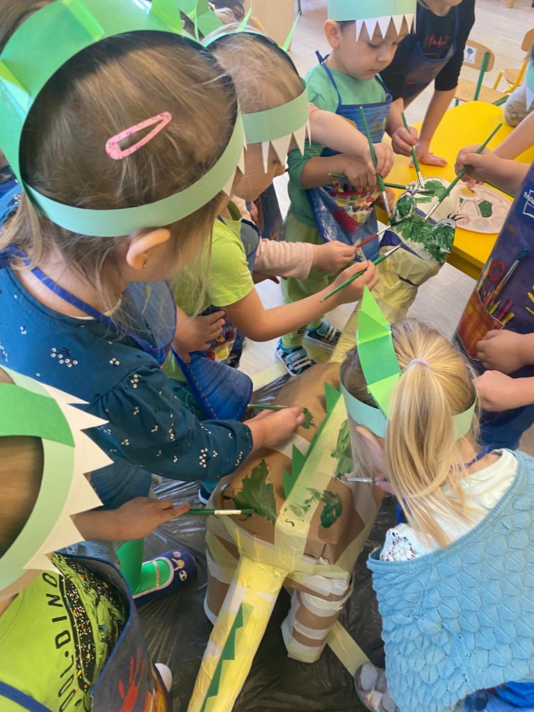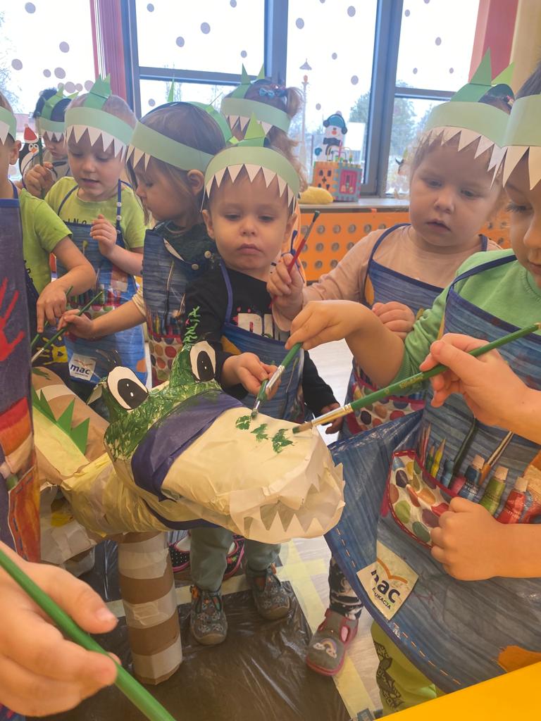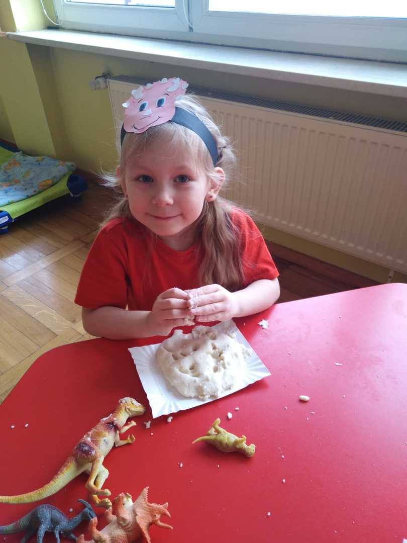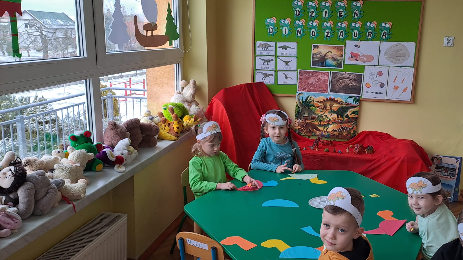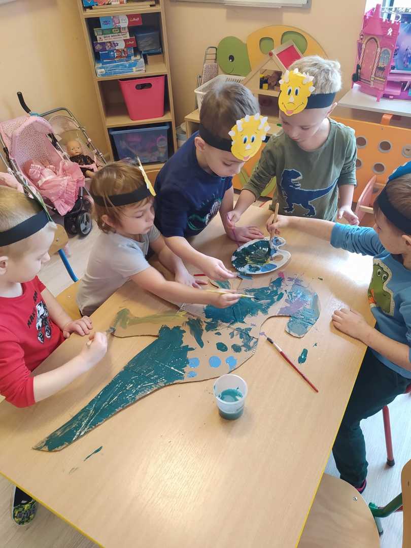 Dziś obchodziliśmy święto znanych, prehistorycznych stworzeń - Dzień Dinozaura. Dzieci poznały historię dinozaurów, dowiedziały się kiedy żyły, czym się żywiły i jak wyglądały. Rozmawialiśmy na temat pracy paleontologa i wspólnie dokonaliśmy ,,wykopalisk" dzięki którym zobaczyliśmy jak wyglądają szkielety niektórych dinozaurów. W zorganizowanych kącikach można było podziwiać diplodoki tyranozaury, triceratopsy, pterodaktyle itp. Nie zabrakło również ciekawych zabawach ruchowych oraz plastycznych związanych z tematyką zajęć. Duże zainteresowanie wzbudziły zajęcia badawcze, dzięki którym dzieci mogły poznać działanie wulkanu.