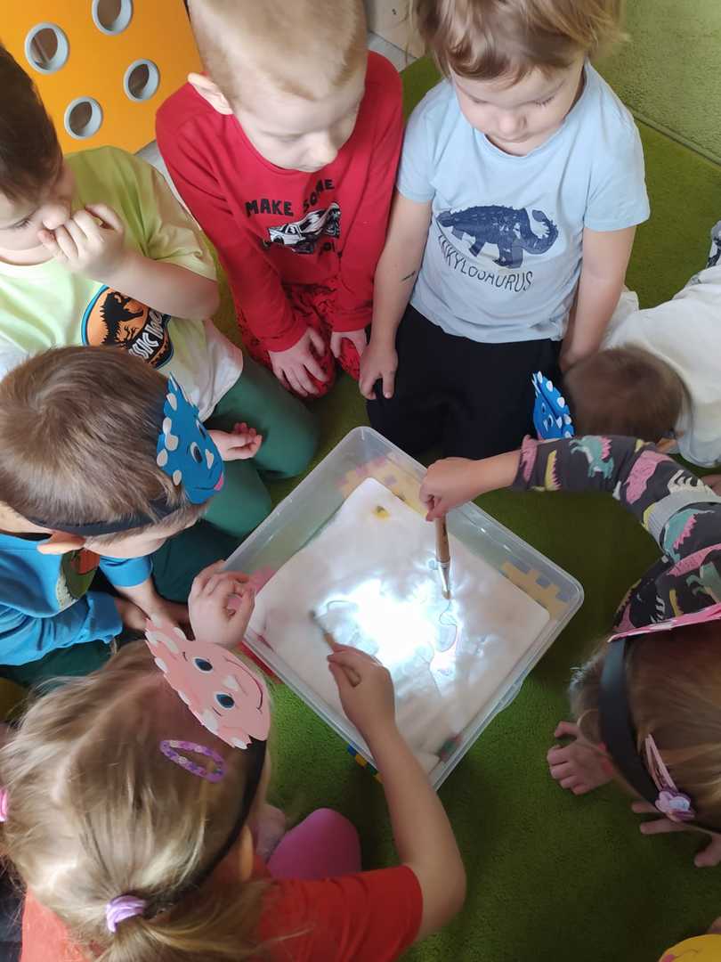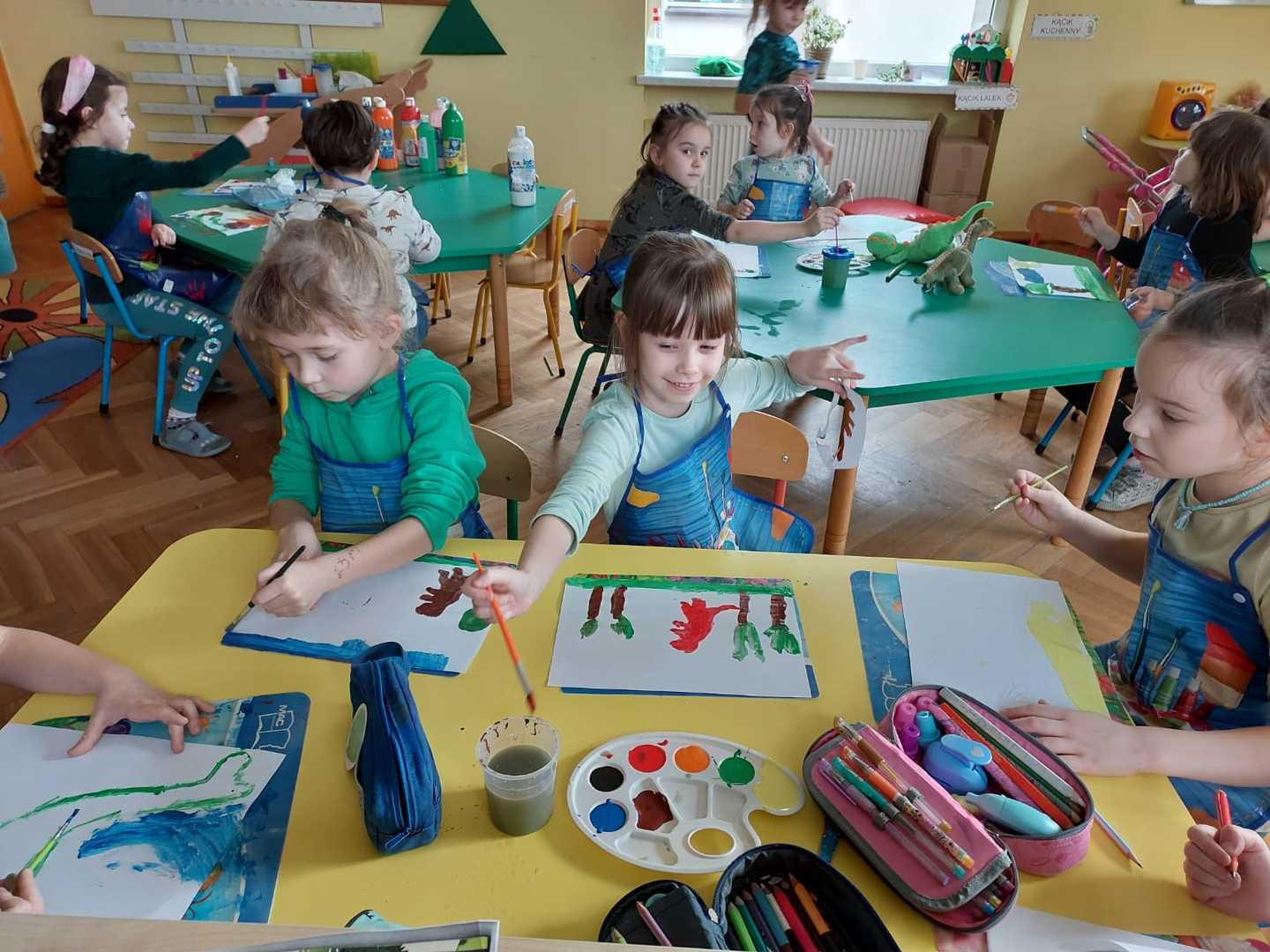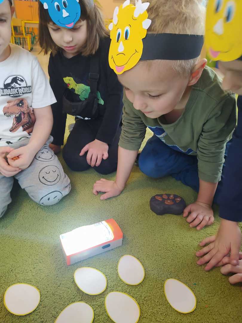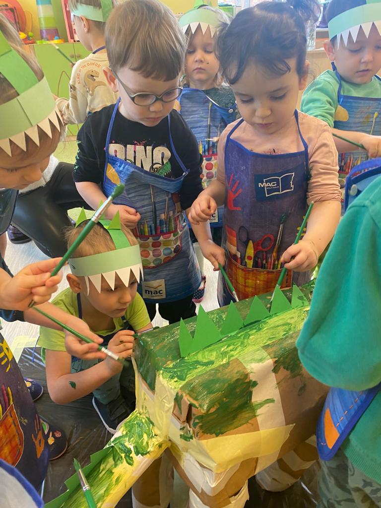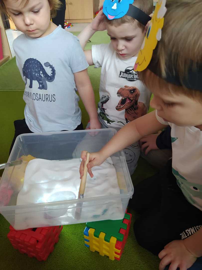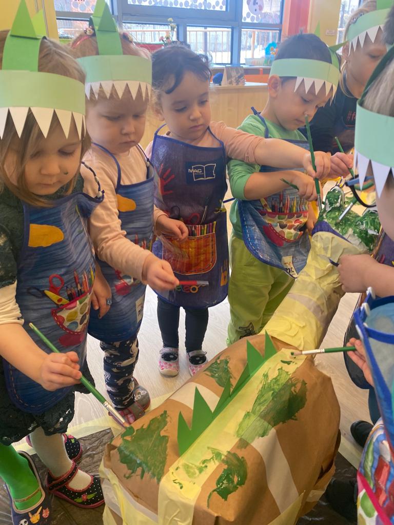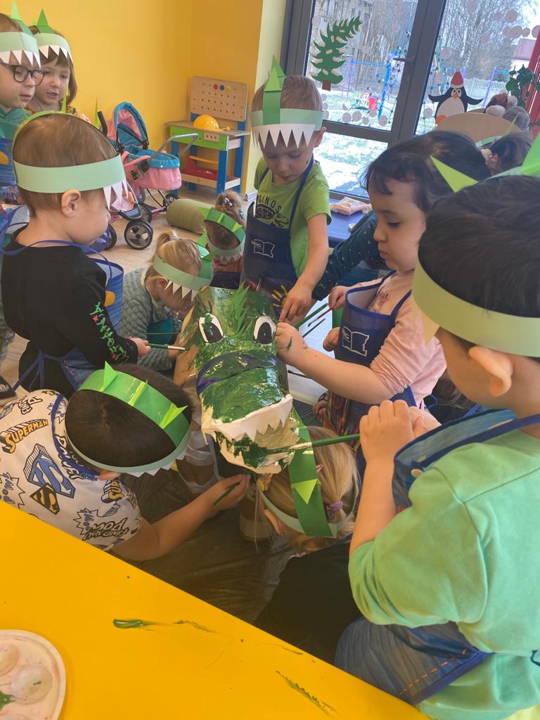 Dziś obchodziliśmy święto znanych, prehistorycznych stworzeń - Dzień Dinozaura. Dzieci poznały historię dinozaurów, dowiedziały się kiedy żyły, czym się żywiły i jak wyglądały. Rozmawialiśmy na temat pracy paleontologa i wspólnie dokonaliśmy ,,wykopalisk" dzięki którym zobaczyliśmy jak wyglądają szkielety niektórych dinozaurów. W zorganizowanych kącikach można było podziwiać diplodoki tyranozaury, triceratopsy, pterodaktyle itp. Nie zabrakło również ciekawych zabawach ruchowych oraz plastycznych związanych z tematyką zajęć. Duże zainteresowanie wzbudziły zajęcia badawcze, dzięki którym dzieci mogły poznać działanie wulkanu.