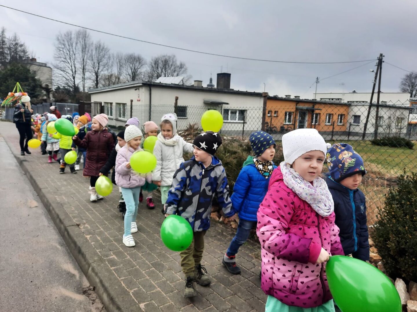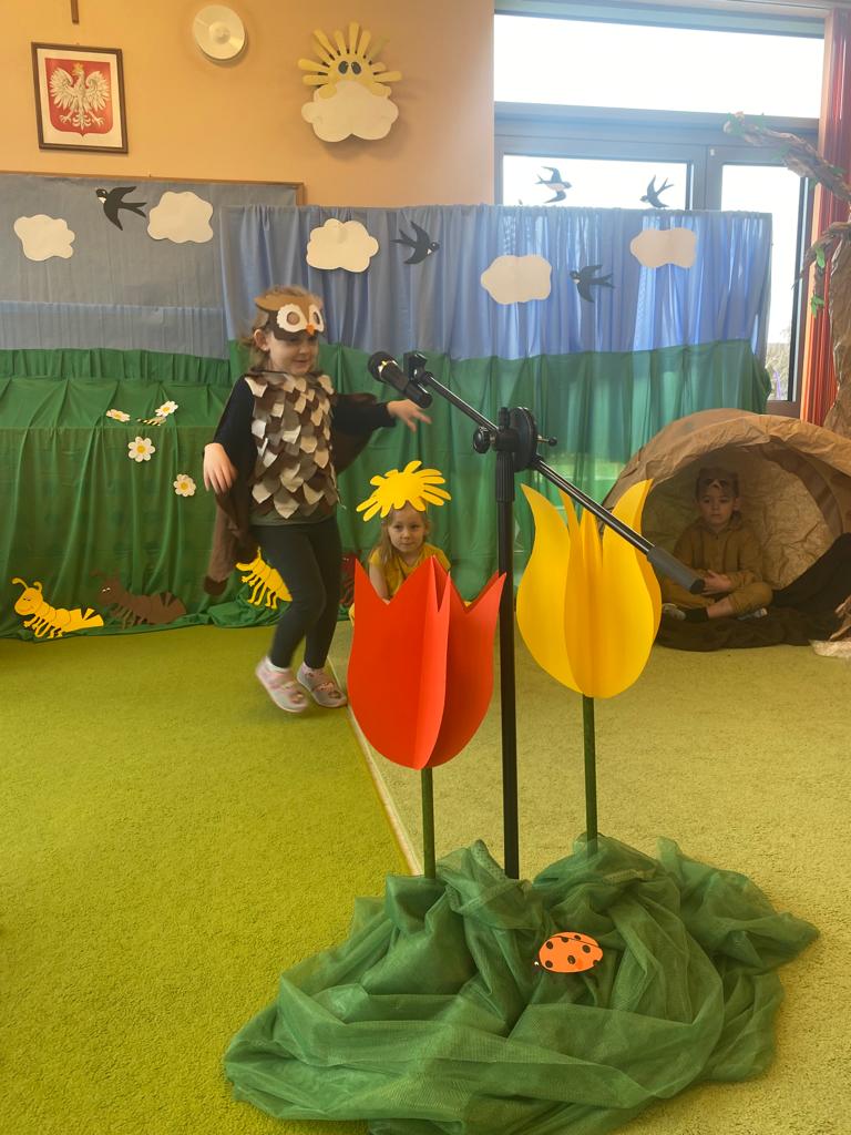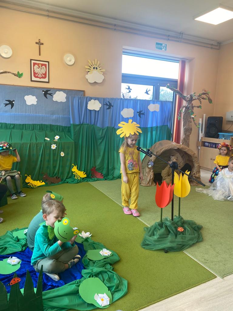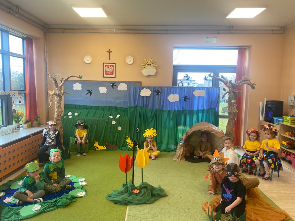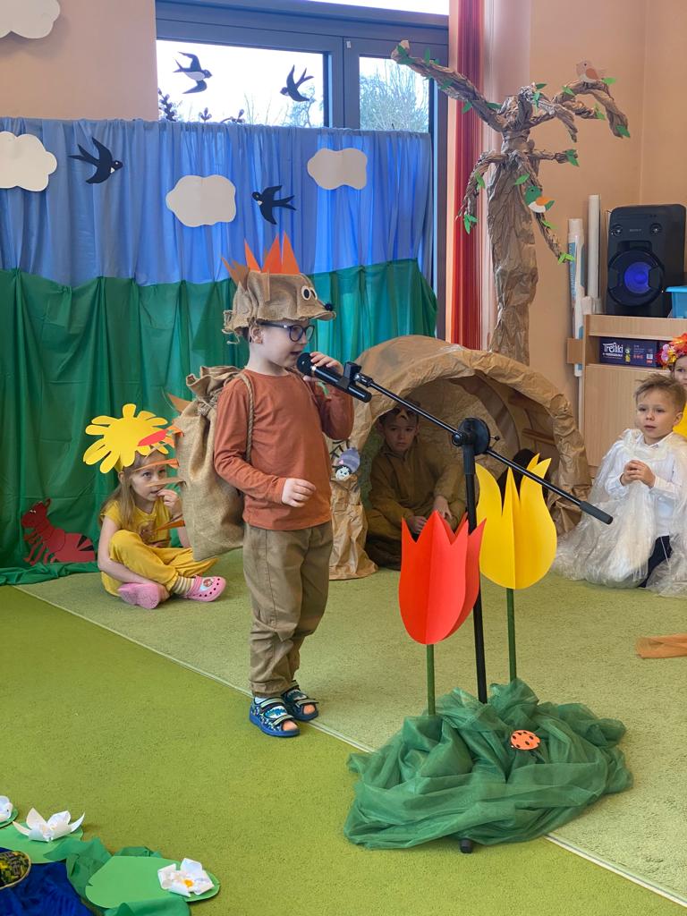 Grupa Jeżyków pod kierunkiem wychowawcy pani Anny Skop przygotowała wiosenny teatrzyk pt. ,,Powitanie Wiosny”. Następnie wszyscy wyruszyliśmy symbolicznie wygonić „Marzannę” wykonaną przez najstarszą grupę Lisków.