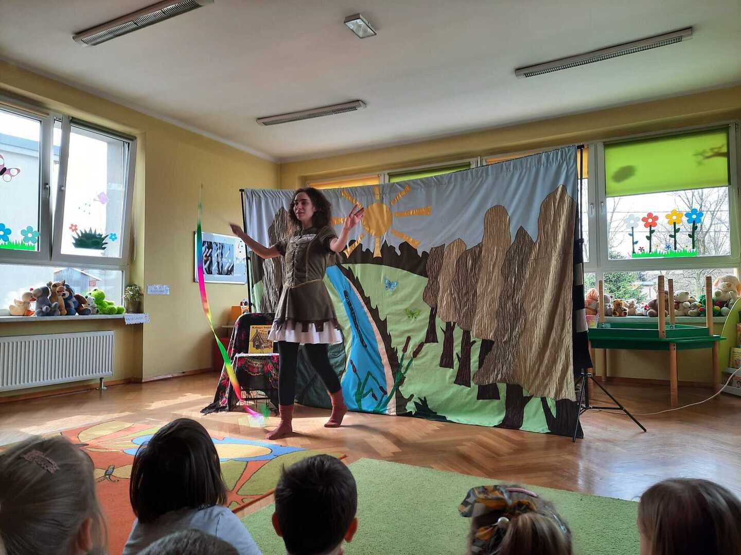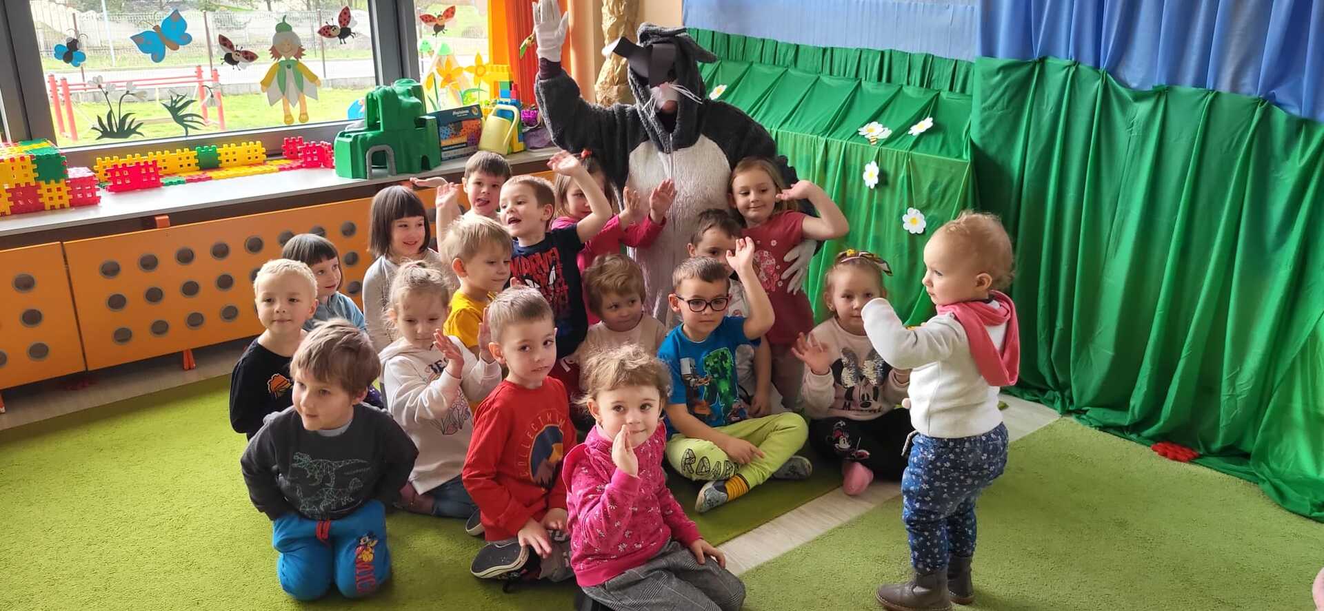 Przedszkolaki obejrzały spektakl pod tytułem „W cieniu łopianowego liścia”.
