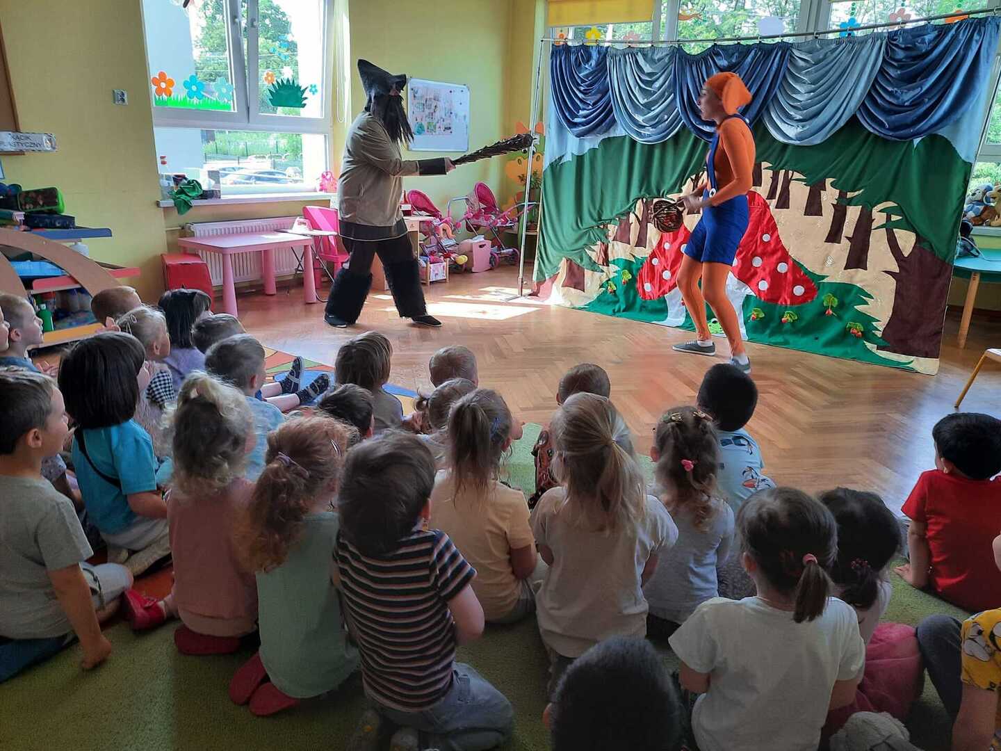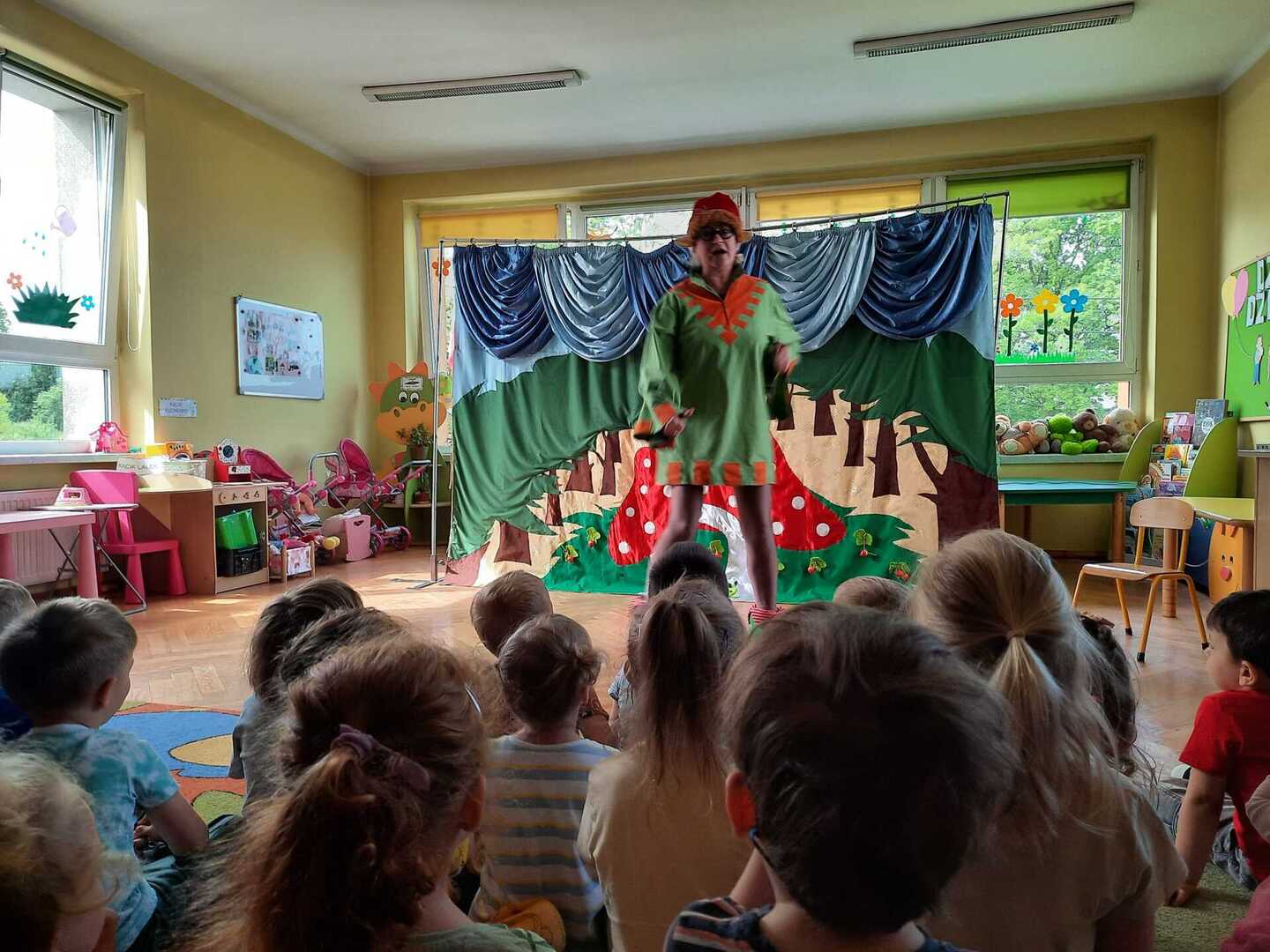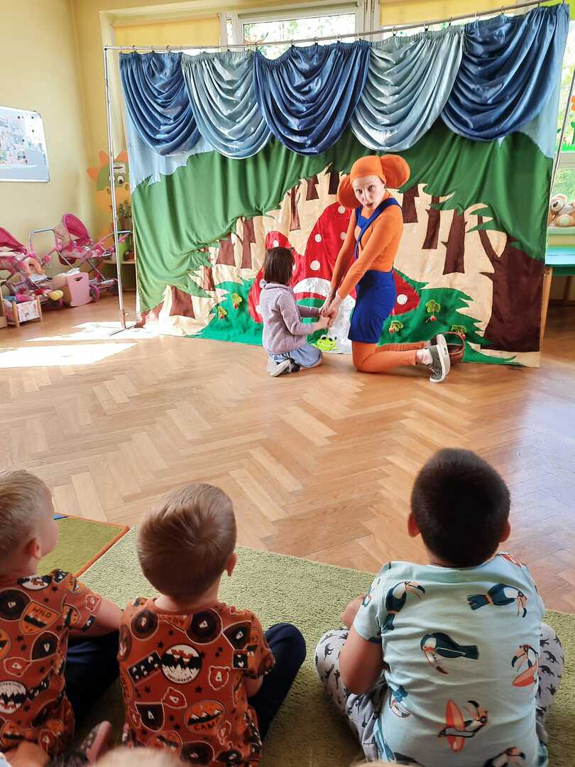 We wtorek 30 maja przedszkolaki obejrzały przestawienie teatrzyku „Skrzat” pt. „O Plastusiu, co zabłądził w borze”. Plastuś wędrował po lesie szukając poziomek dla lalki Kasi, co dostarczyło Mu wielu ciekawych przygód, które z kolei wywołały u dzieci wiele emocji. Istotnym przesłaniem teatrzyku były wartości: przyjaźń, dobro i pomoc innym w potrzebie, które powinny być zawsze obecne w życiu każdego.