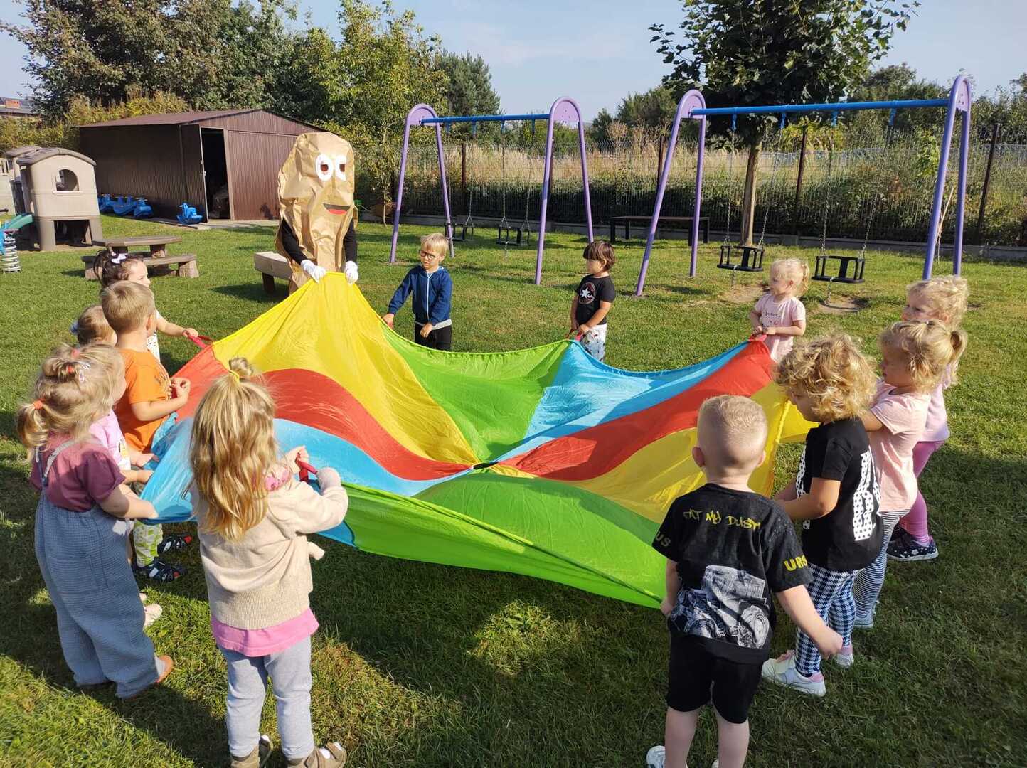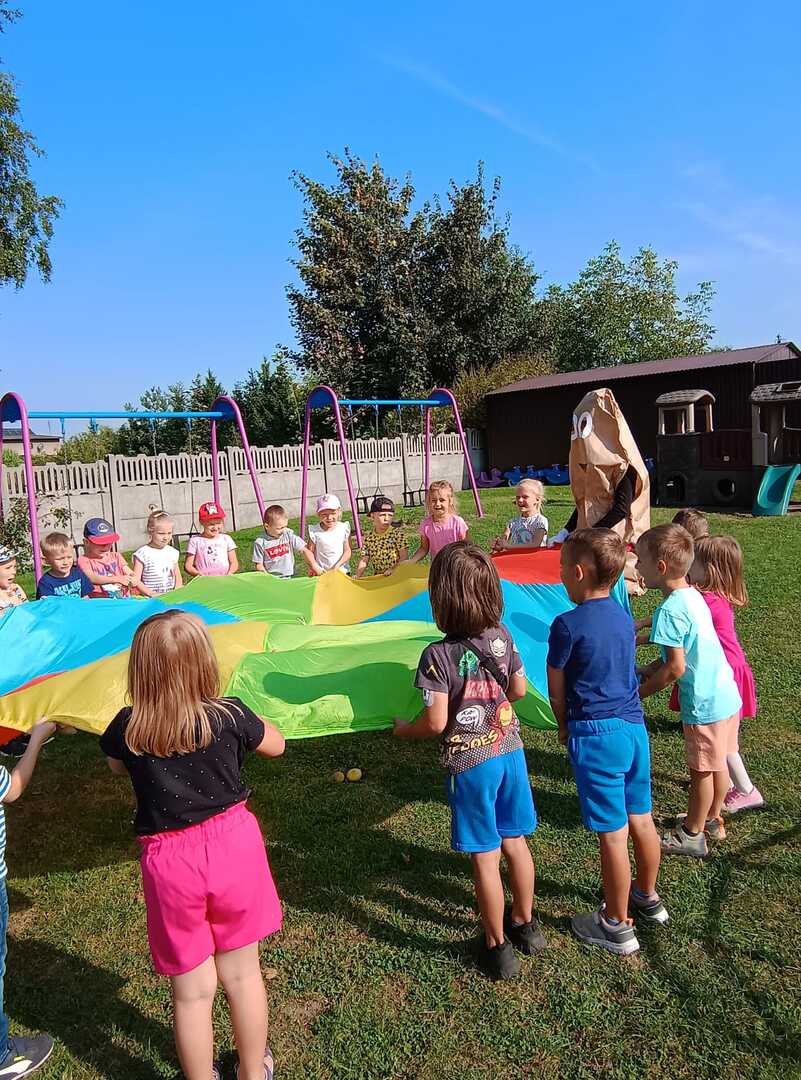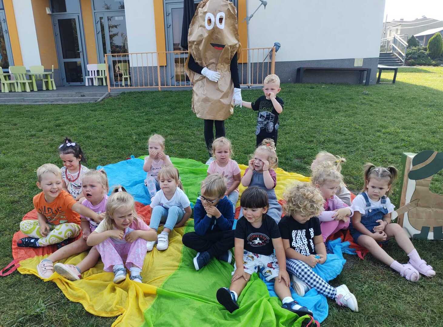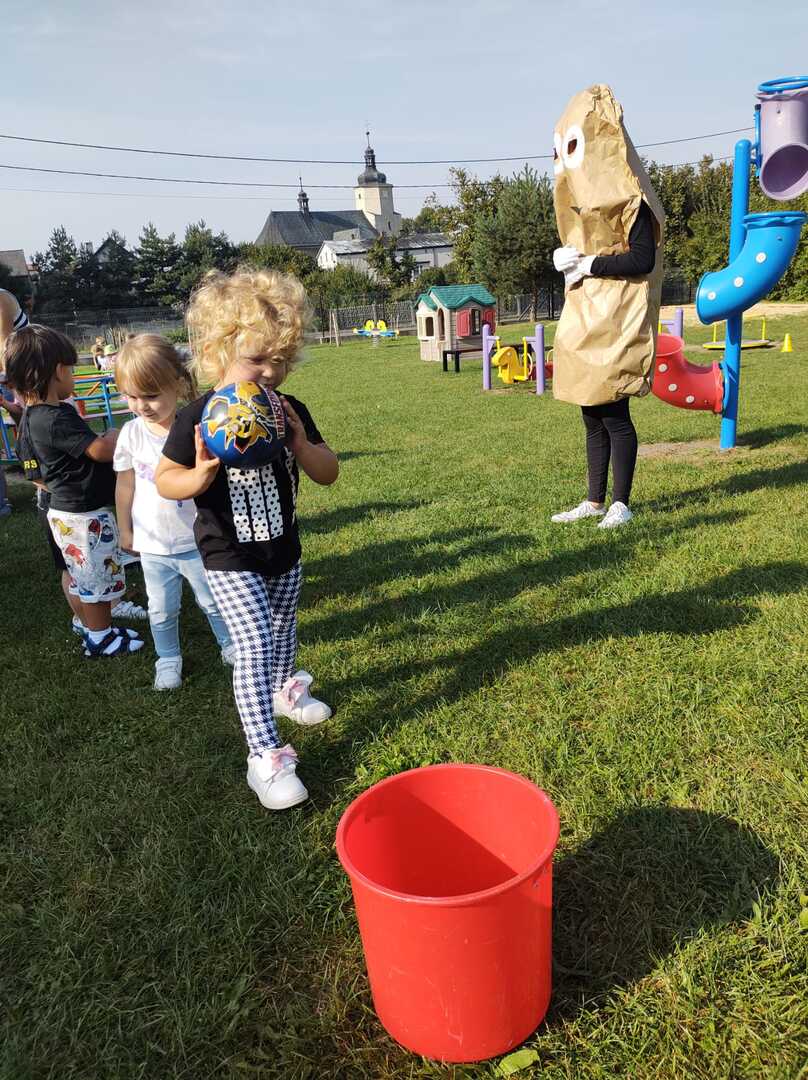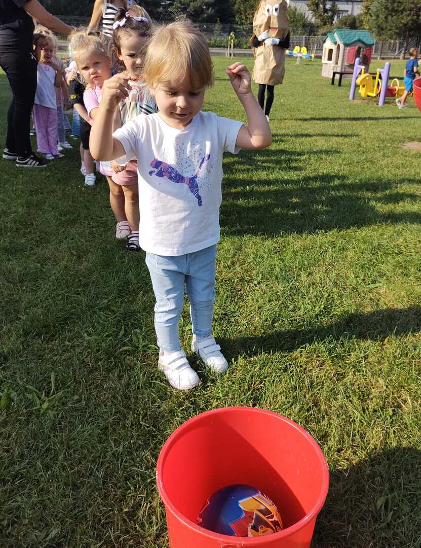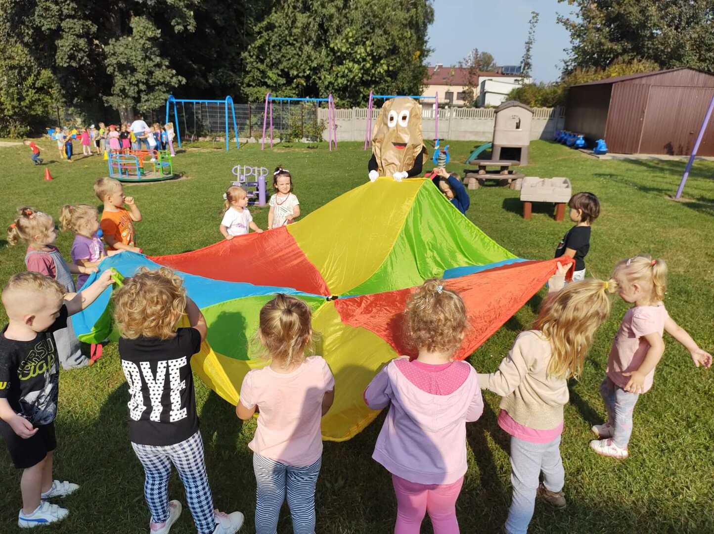 Podczas wspólnej zabawy z Panem Ziemniakiem rzucały do celu, ścigały się, szukały ziemniaków, bawiły się z wykorzystaniem chusty animacyjnej.