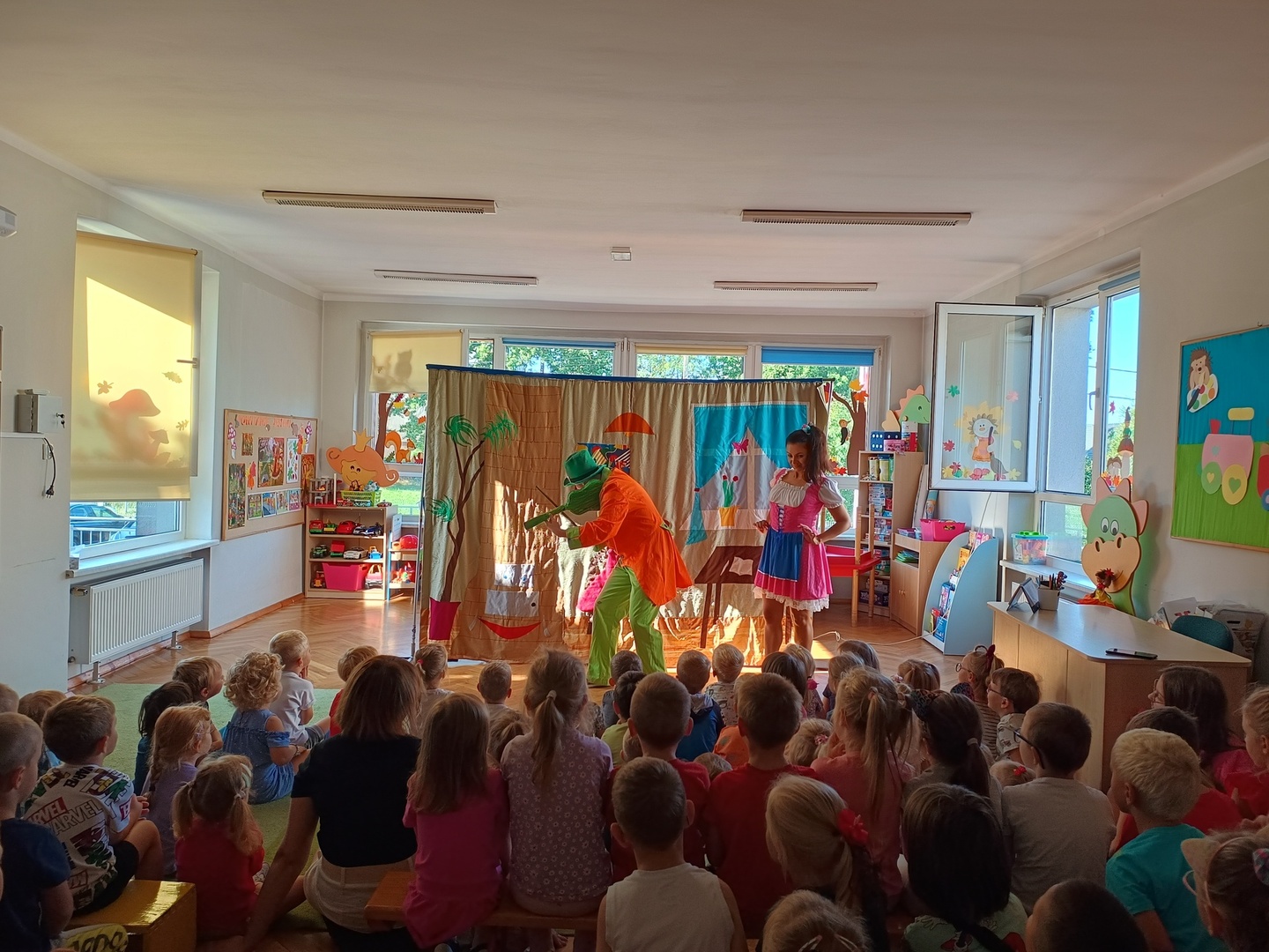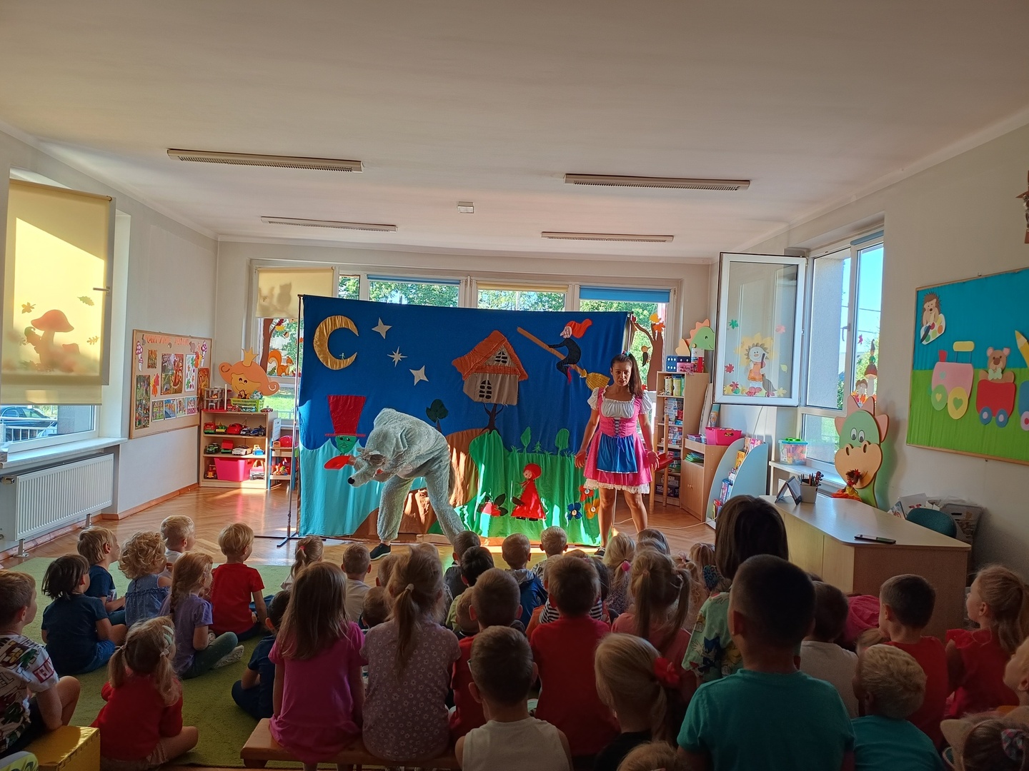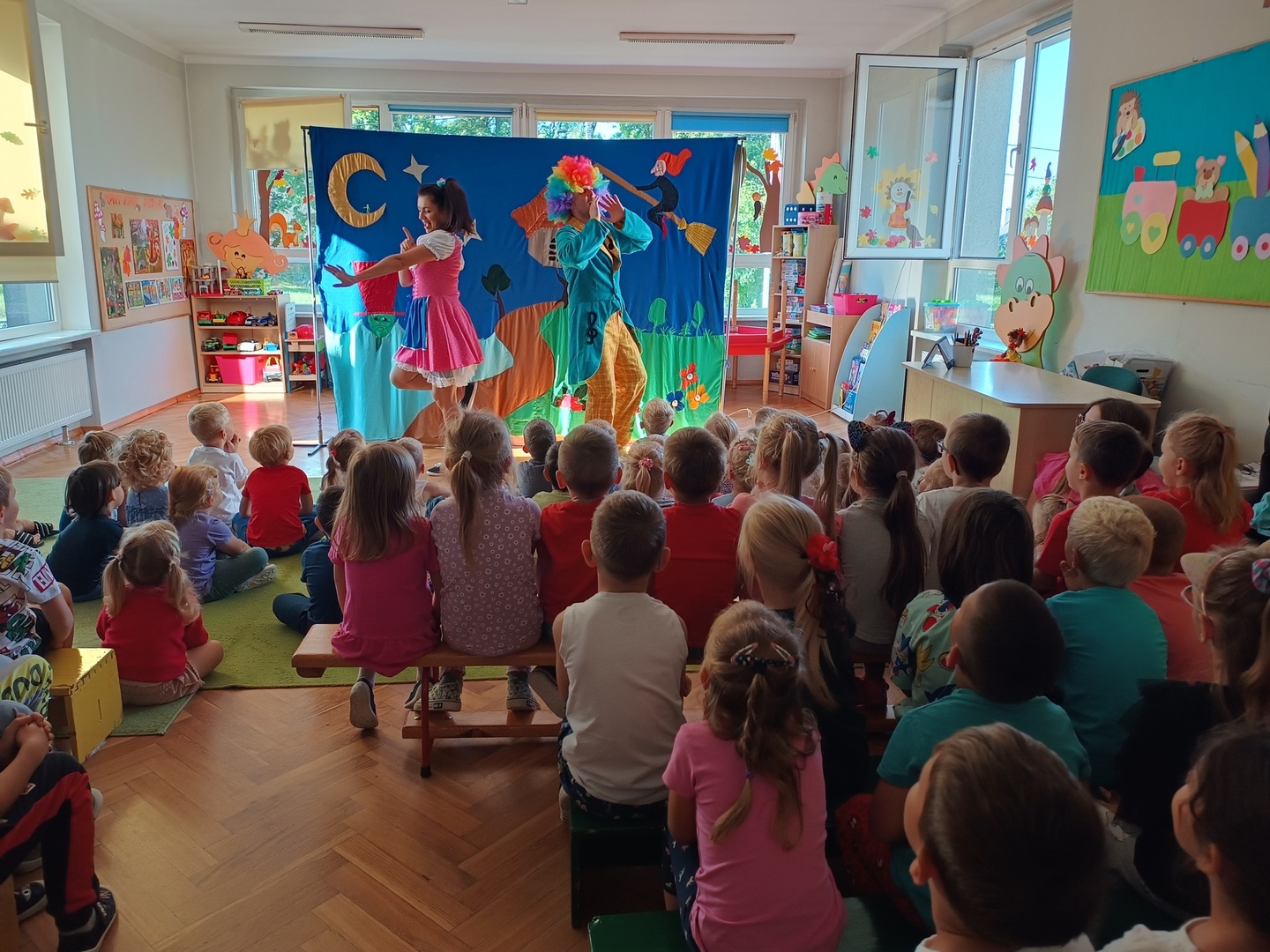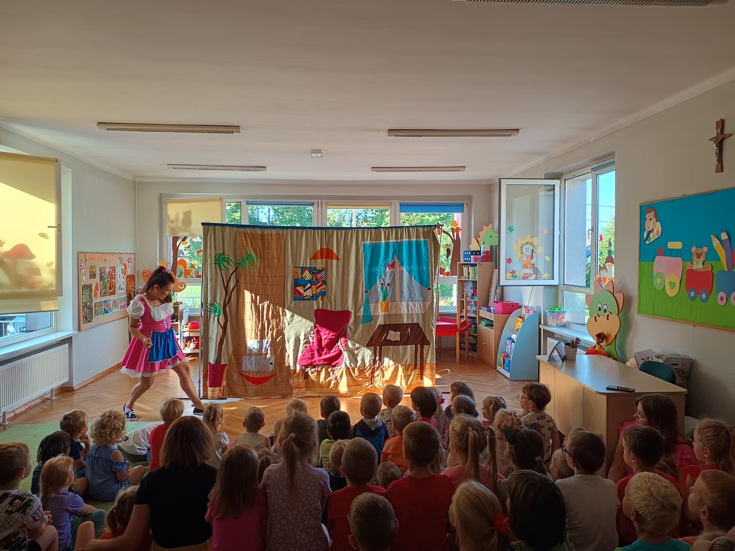 Dnia 28. 09.2023 do przedszkola zawitał teatr „Skrzat” z Krakowa ze spektaklem pt. „Cztery mile za piec”. Przedszkolaki z ciekawością śledziły poszukiwania lalki małej Zosi. Za piecem nie tylko mieszkają pajęczyny i kurz, ale również znajduje się sekretna Kraina Baśni.