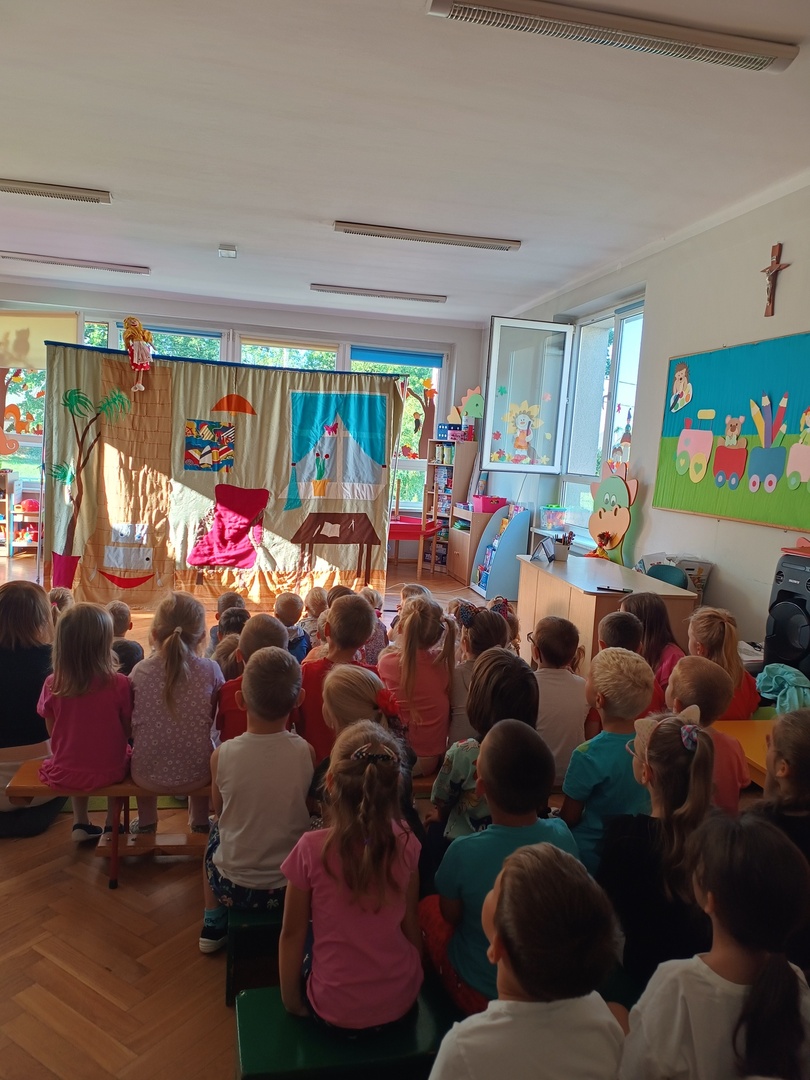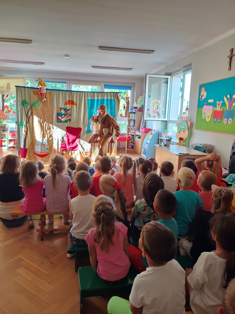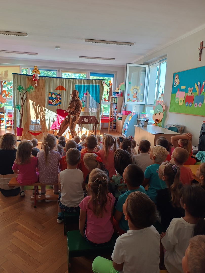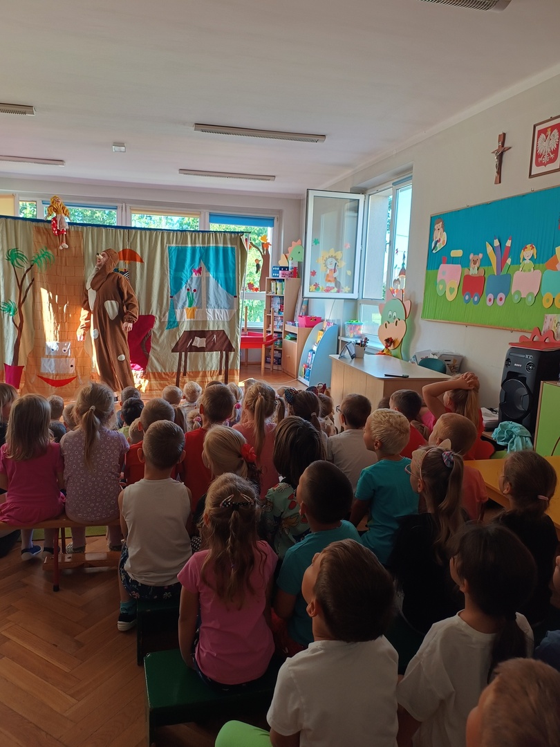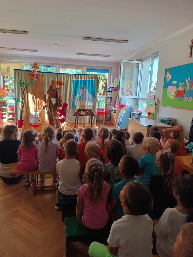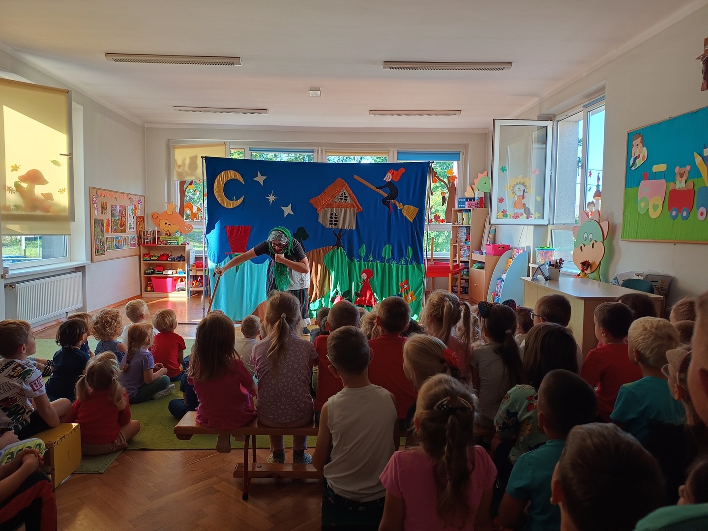 Dnia 28. 09.2023 do przedszkola zawitał teatr „Skrzat” z Krakowa ze spektaklem pt. „Cztery mile za piec”. Przedszkolaki z ciekawością śledziły poszukiwania lalki małej Zosi. Za piecem nie tylko mieszkają pajęczyny i kurz, ale również znajduje się sekretna Kraina Baśni.