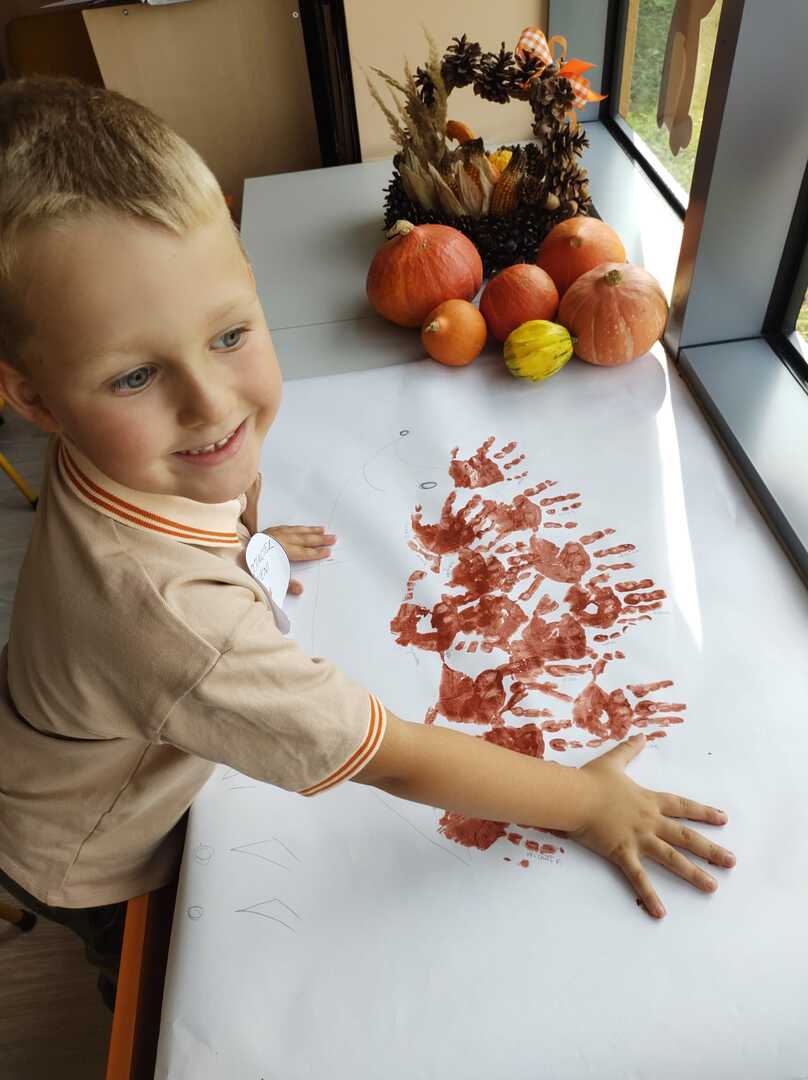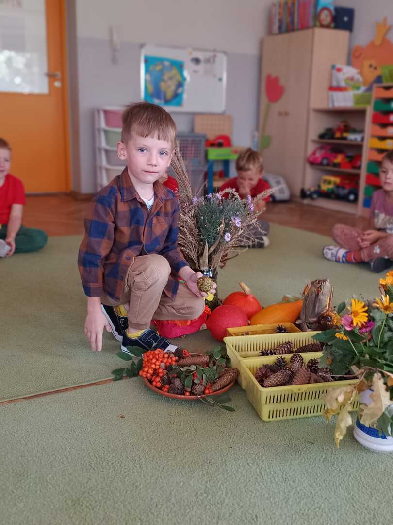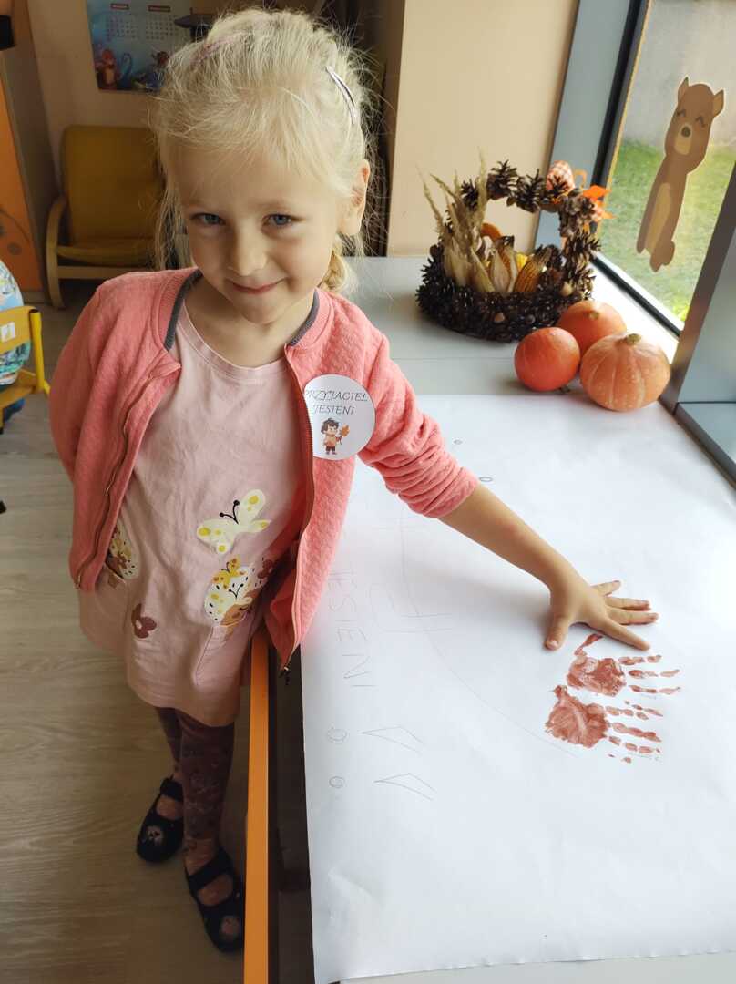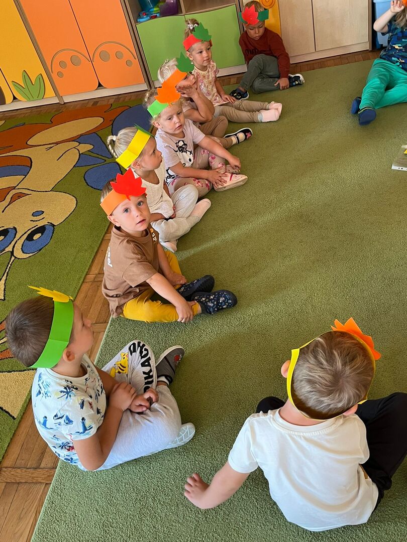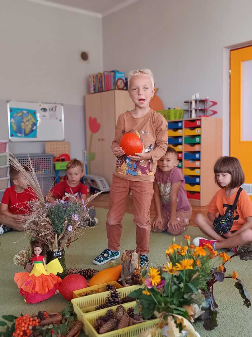 Tego dnia w przedszkolu królowały kolory: brązowy, pomarańczowy, żółty i czerwony. Dzieci brały udział w zajęciach i zabawach o tematyce jesiennej poprzez które zdobywały wiadomości o rozpoczynającej się porze roku. Podczas pobytu w przedszkolnym ogrodzie zbierały kolorowe liście i poszukiwały pierwszych oznak jesieni.