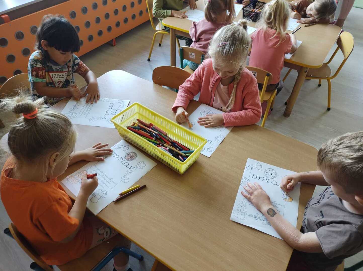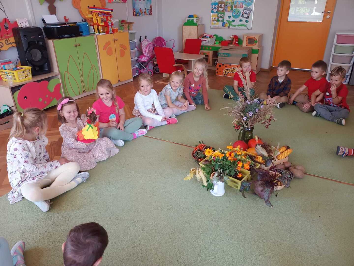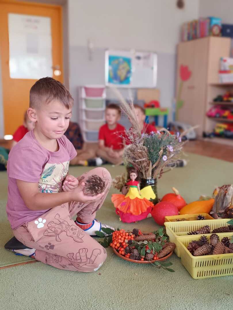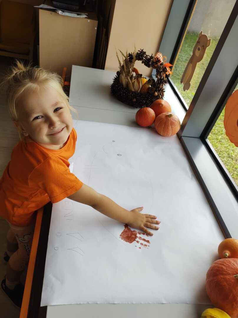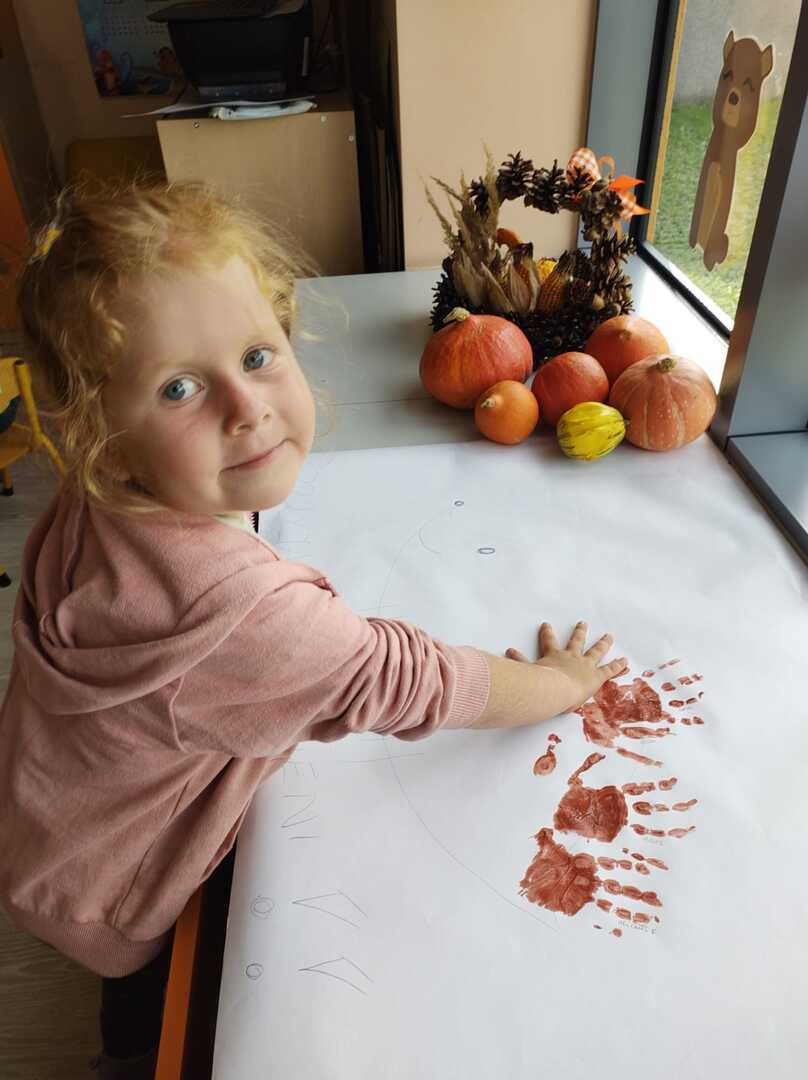 Tego dnia w przedszkolu królowały kolory: brązowy, pomarańczowy, żółty i czerwony. Dzieci brały udział w zajęciach i zabawach o tematyce jesiennej poprzez które zdobywały wiadomości o rozpoczynającej się porze roku. Podczas pobytu w przedszkolnym ogrodzie zbierały kolorowe liście i poszukiwały pierwszych oznak jesieni.