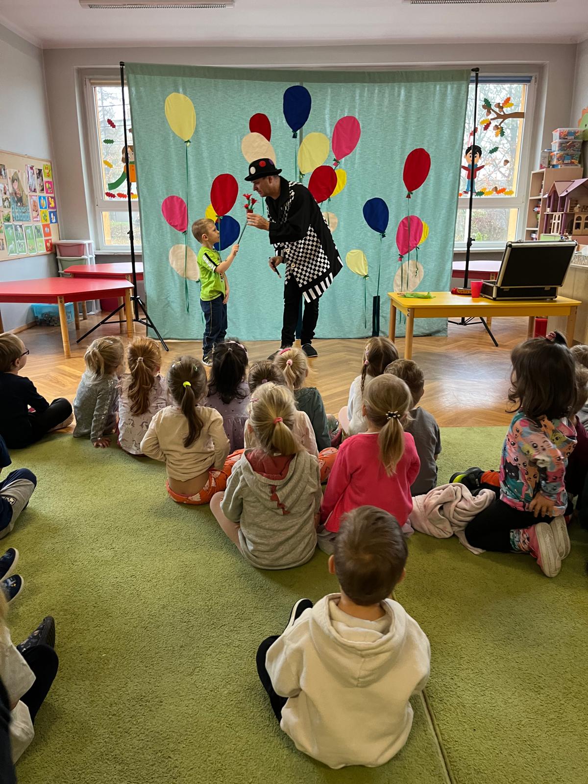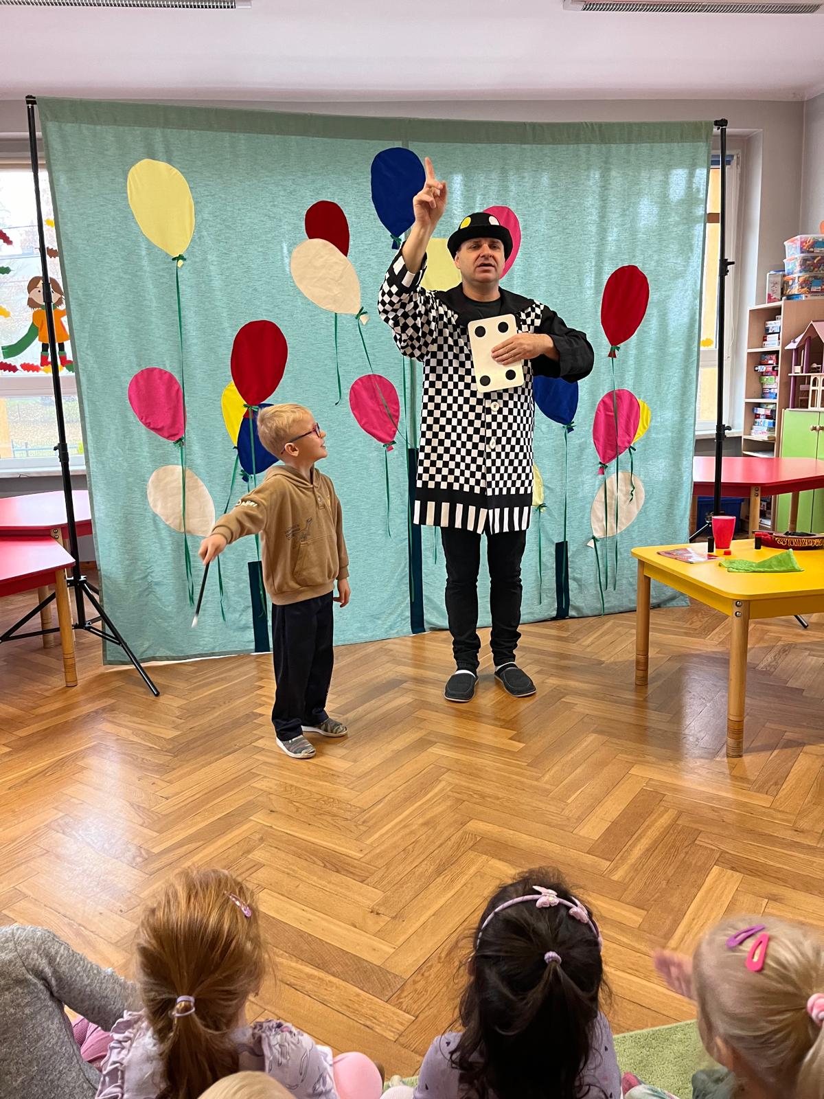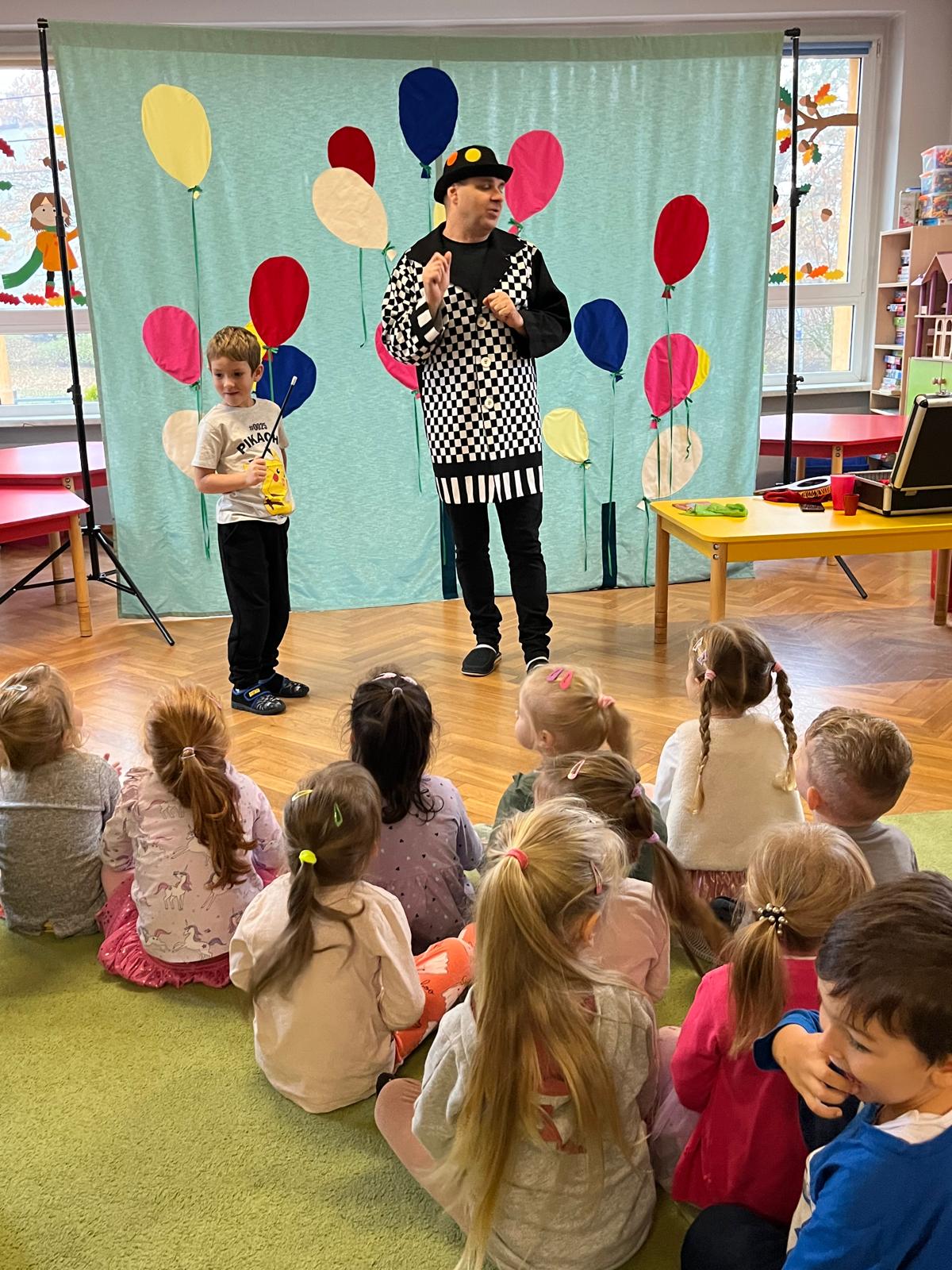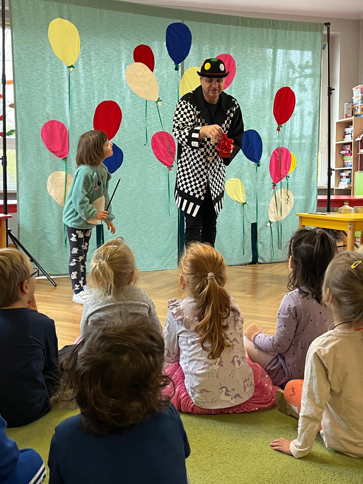 12 listopada 2024r. odwiedził nasze przedszkole niezwykły gość, który przeniósł dzieci w świat iluzji i czarów. Wyprawa do tajemniczego świata dostarczyła wszystkim sporo satysfakcji i radości. Dzieci miały możliwość przeżycia czegoś niezwykłego, ponieważ aktywnie uczestniczyły w przedstawieniu. Uczyły się tajemniczych zaklęć, a odważni ochotnicy pomagali mistrzowi w jego pokazie. Dzieci miały okazje podziwiać najróżniejsze sztuczki m. in. : z kartami, sznurkami, chustami i kwiatami.